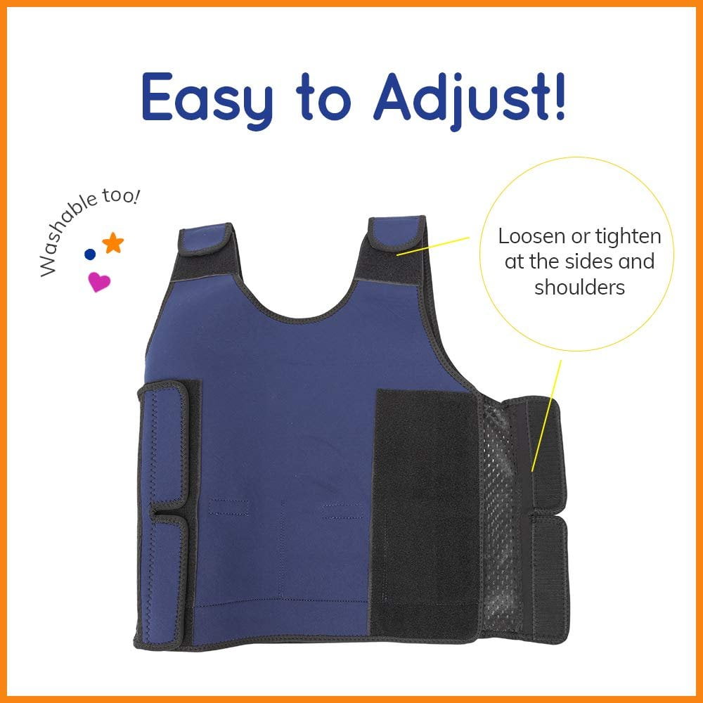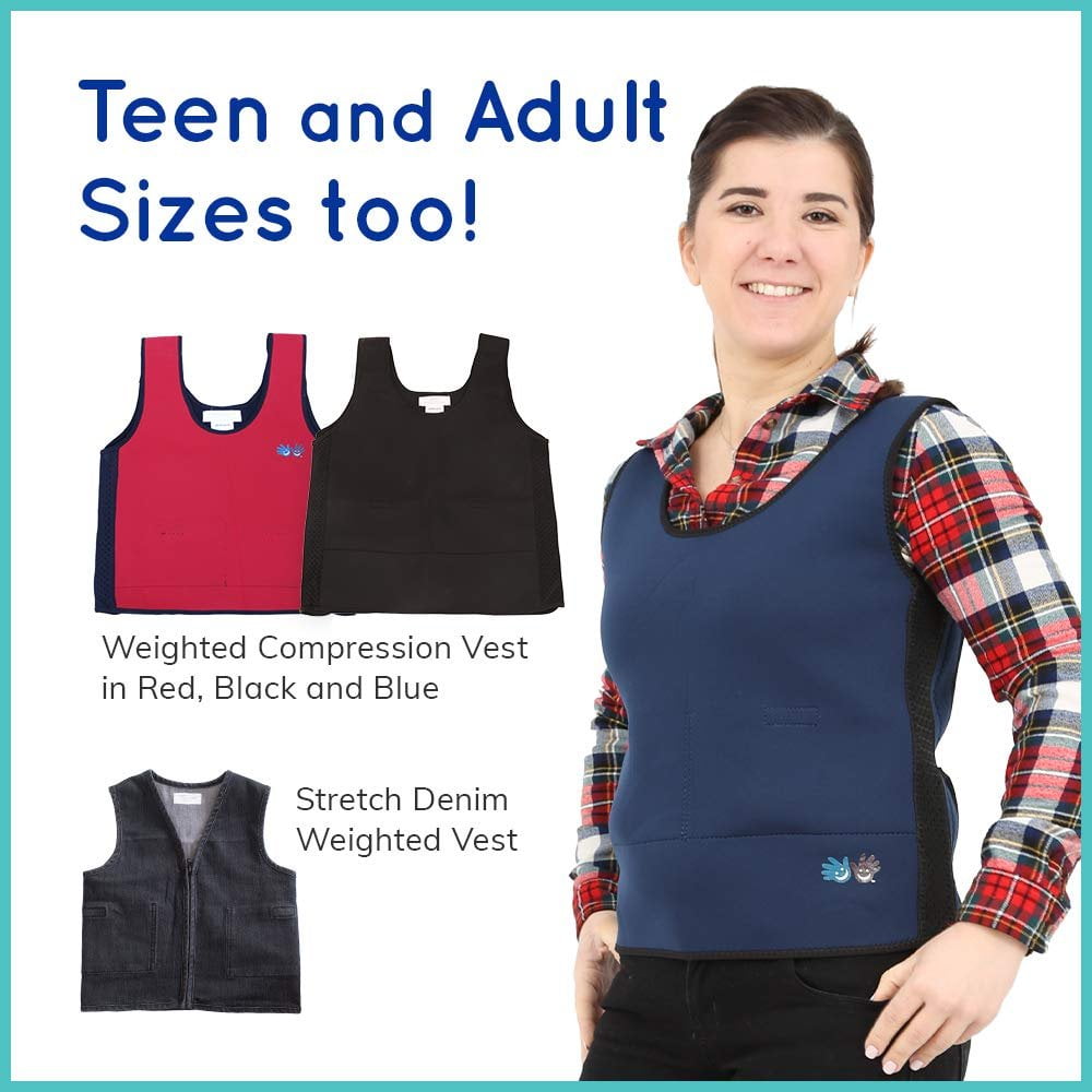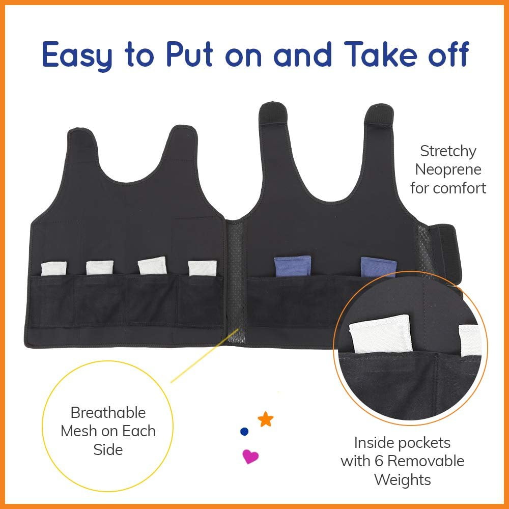 Made with stretchy neoprene to provide a snug, comfy fit, kids even ask to wear it. Imagine one, big, wearable hug. Here is the Fun and Function blue weighted compression vest that encourages the big trifecta of calm, focus, and concentration for learning. And it looks weigh-cool, too. Made for kids and adults alike, the deep pressure and balanced weight are gentle, calming, and reassuring. Most sizes include two .5-pound weights and four .25-pound weights for a total of two pounds, the extra-large size includes four .25-pound weights for a total of 1 lb. There’s a soft neoprene shell for comfort think deep-sea divers, air-conditioned mesh sides to allow air to circulate for breathability, and pockets to place adjustable weights.