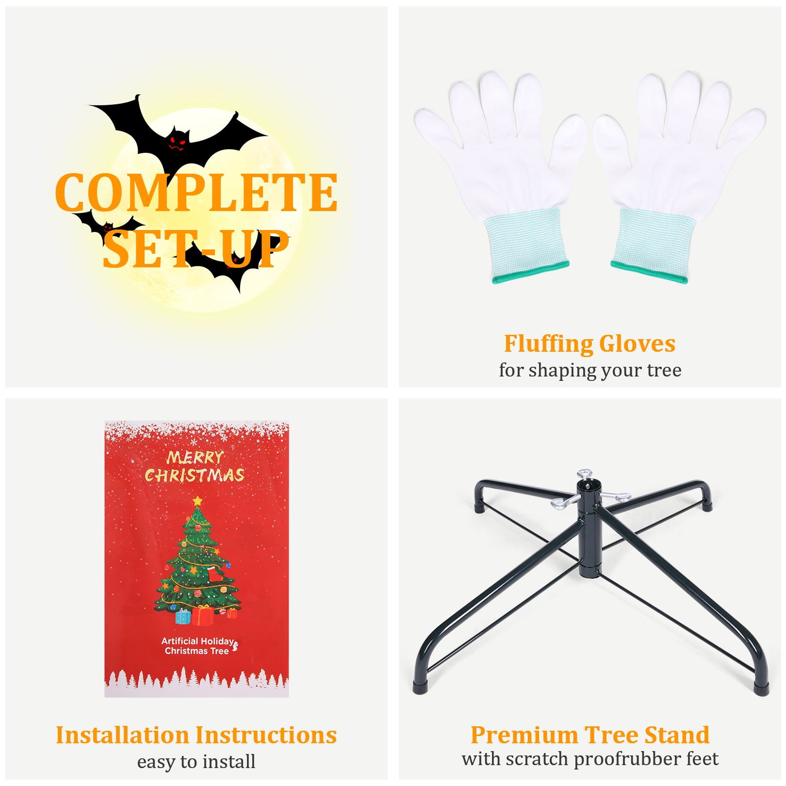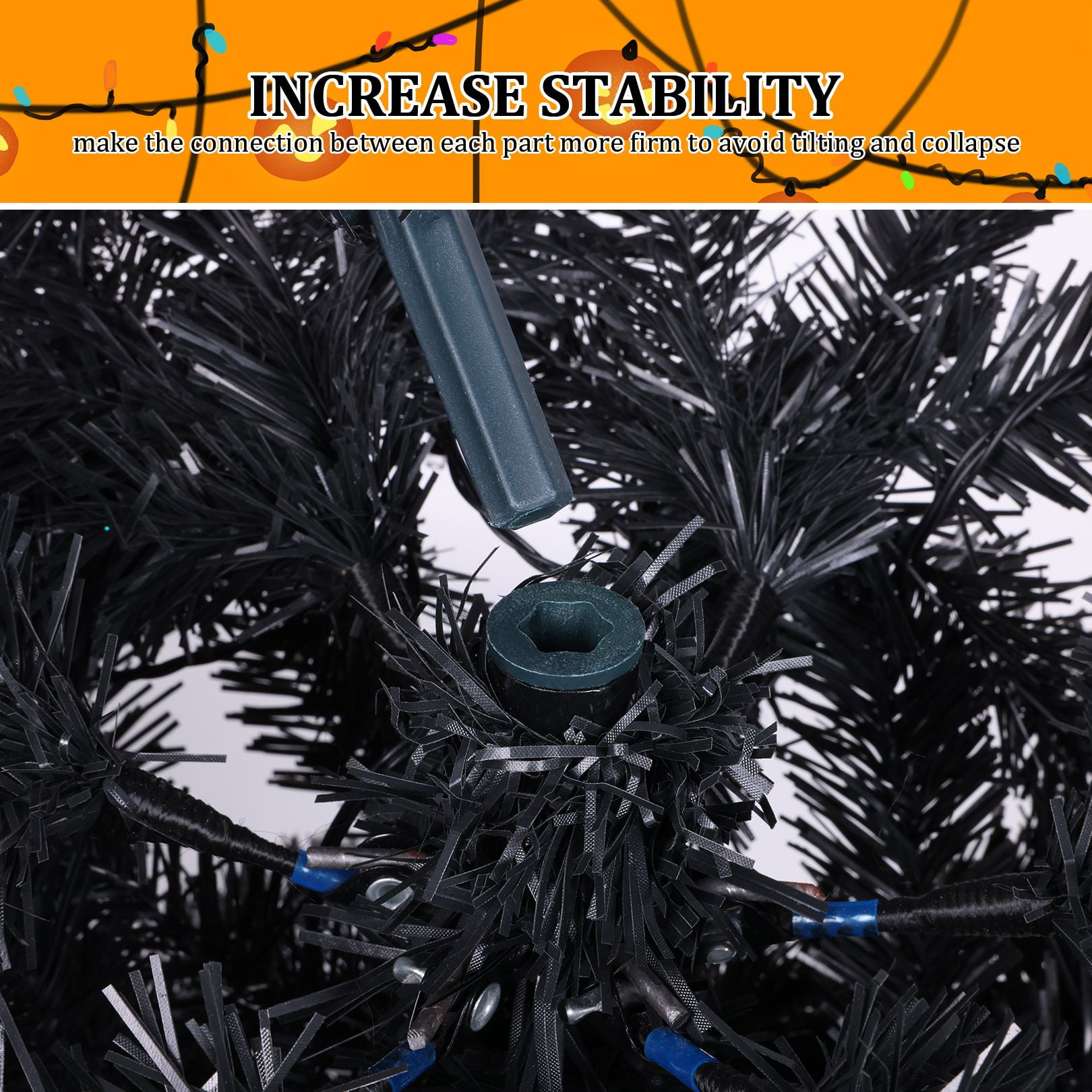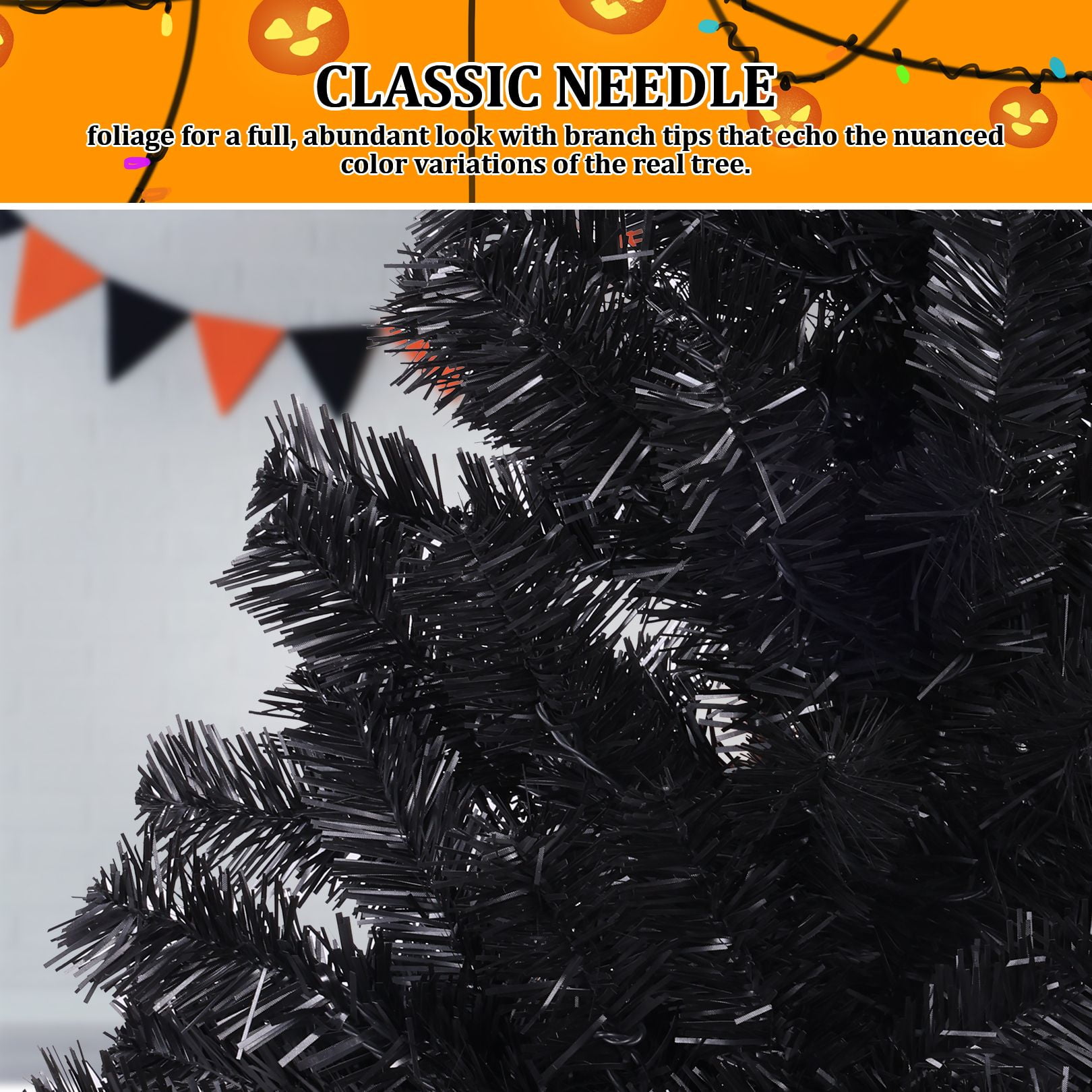 PVC material is non-flammable and non-allergic Constructed in 3 sections for easy set up Have ample space to decorate your favorite tree Perfect size to create a holiday atmosphere Stable and foldable metal base is sturdy to support the whole tree Suitable for home, office, holiday party, classroom Features: Unique & Full Appearance: Our 6ft Artificial Christmas tree stands out with its distinctive green spruce design. Featuring ultra-realistic 1477 PVC branch tips, this tree offers a lush and full appearance after fluffing, providing ample space for hanging ornaments in your preferred style. Easy to Assemble & Fluff: With a convenient hinged design, this tree is a breeze to assemble, disassemble, and store. The tree comes in 3 sections that easily fit together, and the hinged branches expand effortlessly, saving you time and energy. Simply arrange the branches, add your decorations, and your stunning Christmas tree is ready to shine. Superior Material: Our Christmas tree is constructed with sturdy metal hinges and fire-retardant pink PVC blades, ensuring durability and safety for indoor use. The high-quality materials contribute to a better overall experience, making this tree a reliable and long-lasting holiday centerpiece. Foldable Metal Stand: Unlike cheap plastic stands, our tree comes with a foldable metal stand equipped with non-slip foot pads. This provides superior stability and balance, keeping the tree securely upright and preventing breakage, while also protecting your floors. The foldable feature makes storage and packing a breeze. Holiday Cheer: Spread Holiday Cheer with the Artificial Halloween Christmas Tree, perfect for any location! Whether you’re looking to decorate for Halloween, host a Halloween party, or create a festive ambiance, this versatile tree is an ideal choice. Place it by your doorway, in the living room, near the fireplace, on the windowsill, alongside the stairs, on your balcony, or even in a shopping mall or children’s room. Get creative and hang your favorite ornaments on it to add a personal touch. With this tree, you’ll effortlessly bring joy and prosperity to your celebrations. Specifications: Color: Black Size: 6ft Material: PVC + Metal Number of Tips: 1477 Package Includes: 1 x Black Christmas Tree 1 x Metal Stand 1 x Instruction 2 x gloves Note: At the end of the installation, it takes about 30-40 minutes to fluff and shape the tips. Please remove the plastic cap from a pole which is only for tree protection in transit. If the caps are damaged or missing upon arrival, it doesn’t matter.