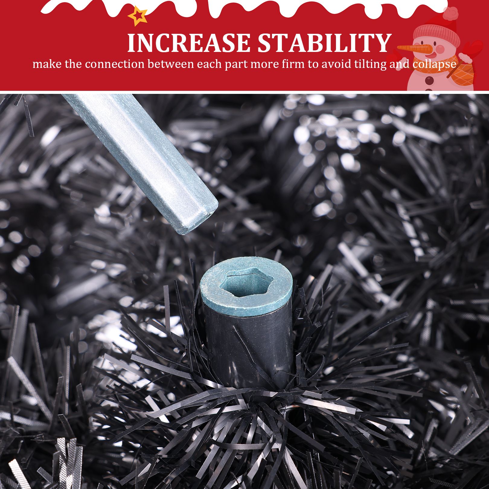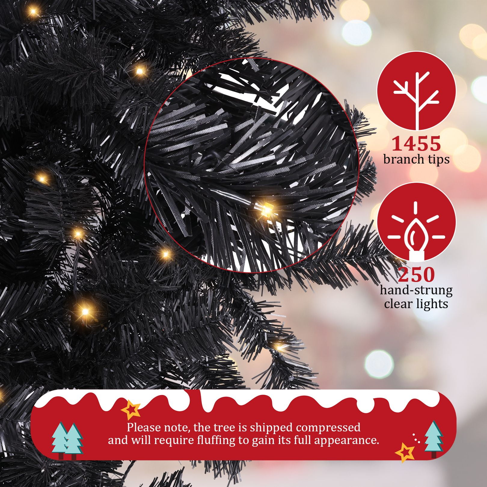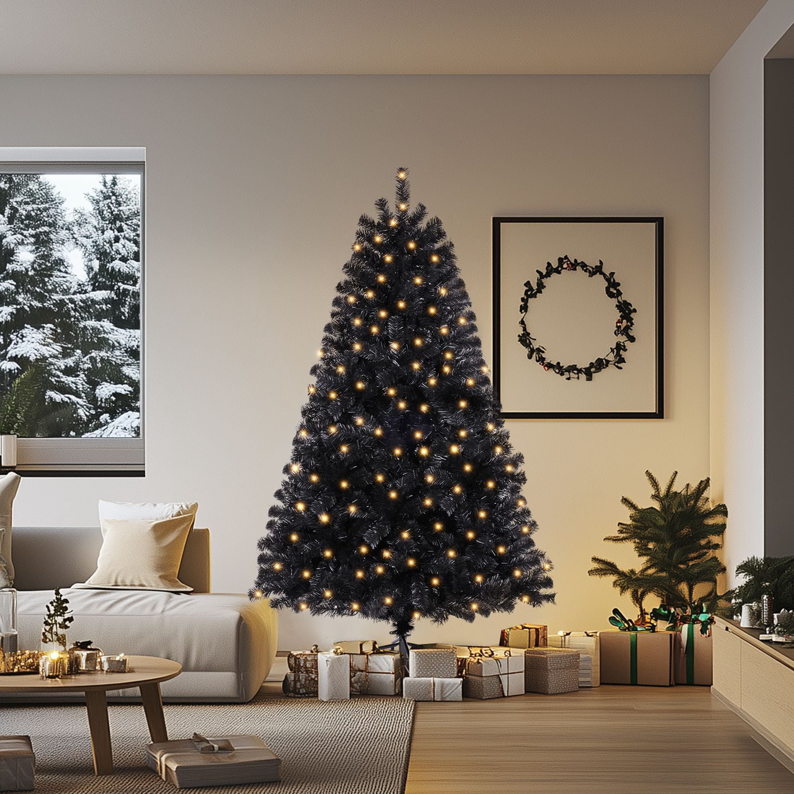 Refresh your home for the holidays with our versatile black artificial tree. Standing at 6ft tall and featuring 1477 crafted branch tips, it looks dense and lifelike. Whether you want a classic Christmas or spooky Halloween tree, this one is perfect. This fantastically festive tree pre-strung with 250 warm LED lights and among the branches create a glowing nighttime display. It leaves plenty of room for your creativity and preferred ornaments. The tree is made with high-quality PVC tips and a foldable strong metal stand for long-lasting use. Get one today and elevate your home decor!