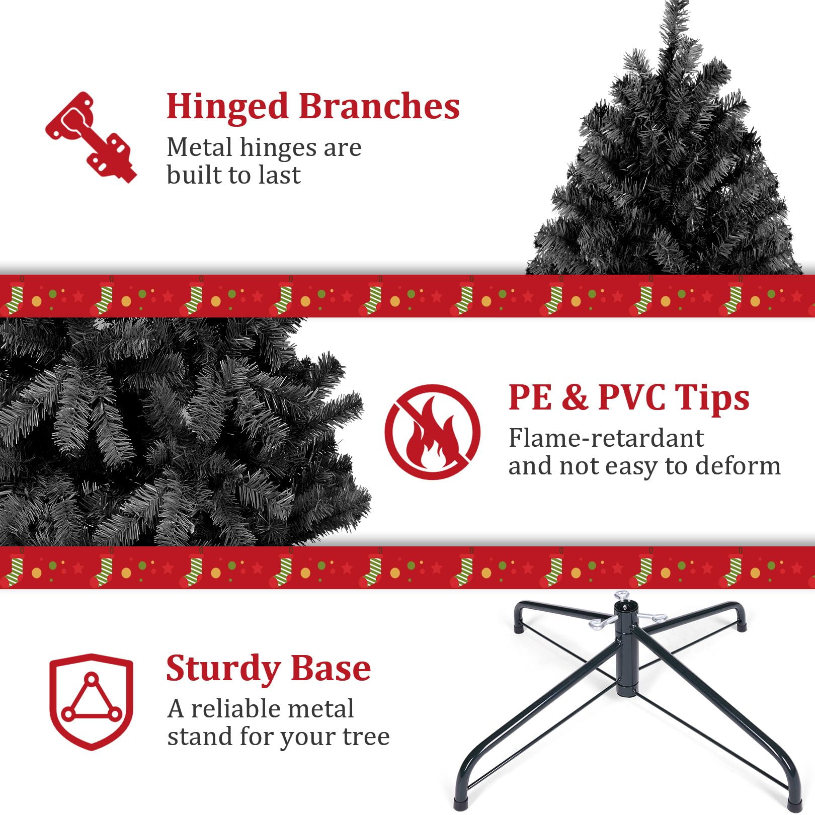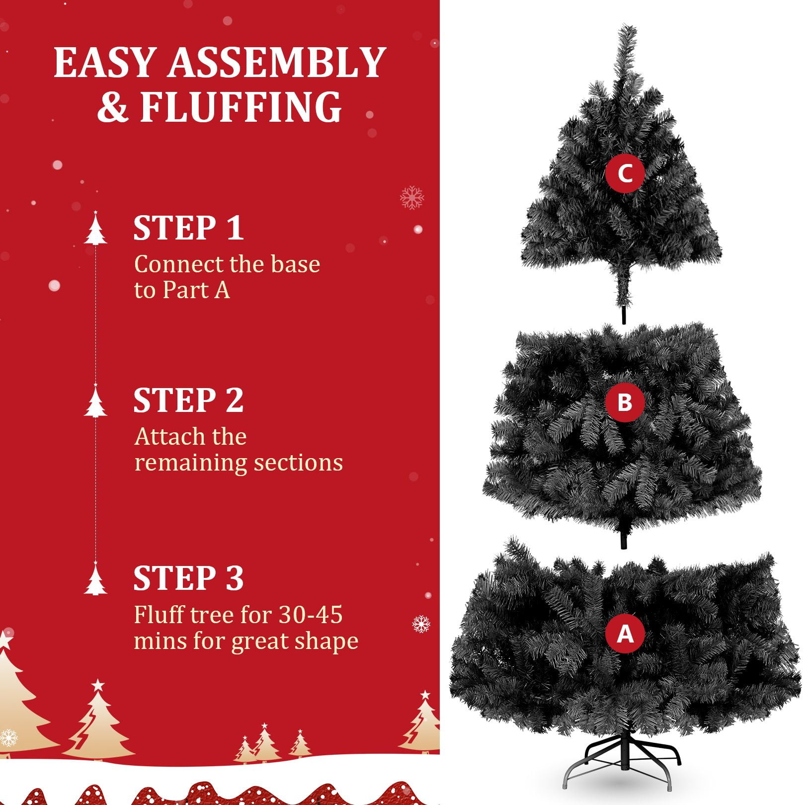 PVC material is non-flammable and non-allergic Constructed in 3 sections for easy set up Have ample space to decorate your favorite tree Warm led light strings creates a warm ambiance Perfect size to create a holiday atmosphere Stable and foldable metal base is sturdy to support the whole tree Suitable for home, office, holiday party, classroom Features: Unique & Full Appearance: Our 6ft Artificial Christmas tree is equipped with 250 incandescent LED lights. Featuring ultra-realistic 1477 PVC branch tips, this tree offers a lush and full appearance after fluffing, providing ample space for hanging ornaments in your preferred style. Easy to Assemble & Fluff: With a convenient hinged design, this tree is a breeze to assemble, disassemble, and store. The tree comes in 3 sections that easily fit together, and the hinged branches expand effortlessly, saving you time and energy. Simply arrange the branches, add your decorations, and your stunning Christmas tree is ready to shine. Superior Material: Our Christmas tree is constructed with sturdy metal hinges and fire-retardant pink PVC blades, ensuring durability and safety for indoor use. The high-quality materials contribute to a better overall experience, making this tree a reliable and long-lasting holiday centerpiece. Foldable Metal Stand: Unlike cheap plastic stands, our tree comes with a foldable metal stand equipped with non-slip foot pads. This provides superior stability and balance, keeping the tree securely upright and preventing breakage, while also protecting your floors. The foldable feature makes storage and packing a breeze. Holiday Cheer: Spread Holiday Cheer with the Artificial Halloween Christmas Tree, perfect for any location! Whether you’re looking to decorate for Halloween, host a Halloween party, or create a festive ambiance, this versatile tree is an ideal choice. Place it by your doorway, in the living room, near the fireplace, on the windowsill, alongside the stairs, on your balcony, or even in a shopping mall or children’s room. Get creative and hang your favorite ornaments on it to add a personal touch. With this tree, you’ll effortlessly bring joy and prosperity to your celebrations. Specifications: Color: Black Size: 6ft Material: PVC + Metal Number of lights: 250 Mode: 10 Light Modes Number of Tips: 1477 Package Includes: 1 x Black Christmas Tree 1 x Metal Stand 1 x Instruction 2 x gloves Note: At the end of the installation, it takes about 30-40 minutes to fluff and shape the tips. Please remove the plastic cap from a pole which is only for tree protection in transit. If the caps are damaged or missing upon arrival, it doesn’t matter.