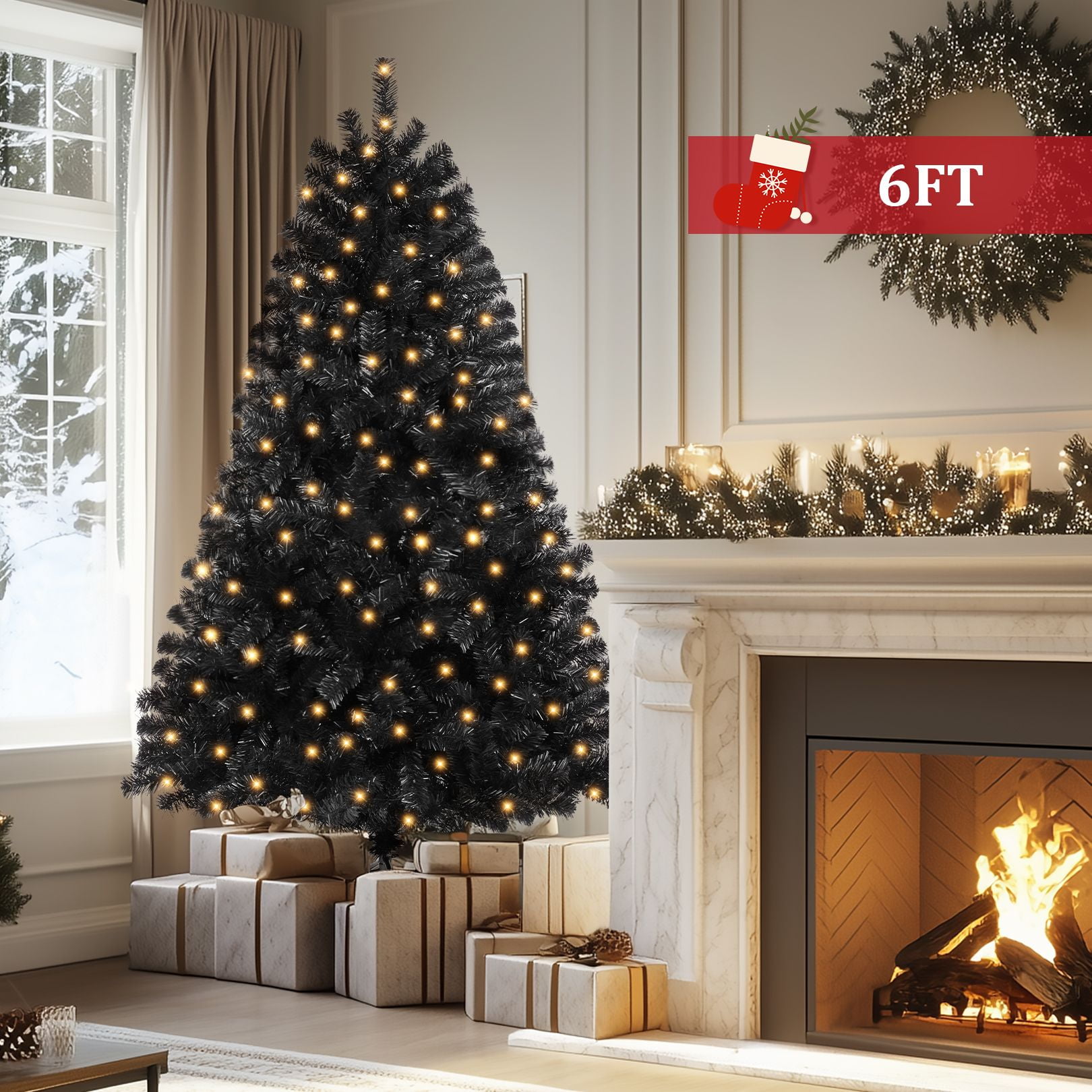 Funcid 6Ft Pre-Lit Artificial Full Black Christmas Tree Halloween Holiday Decoration with 1,477 Branch Tips, 250 Incandescent Lights, Foldable Metal Stand – Black
