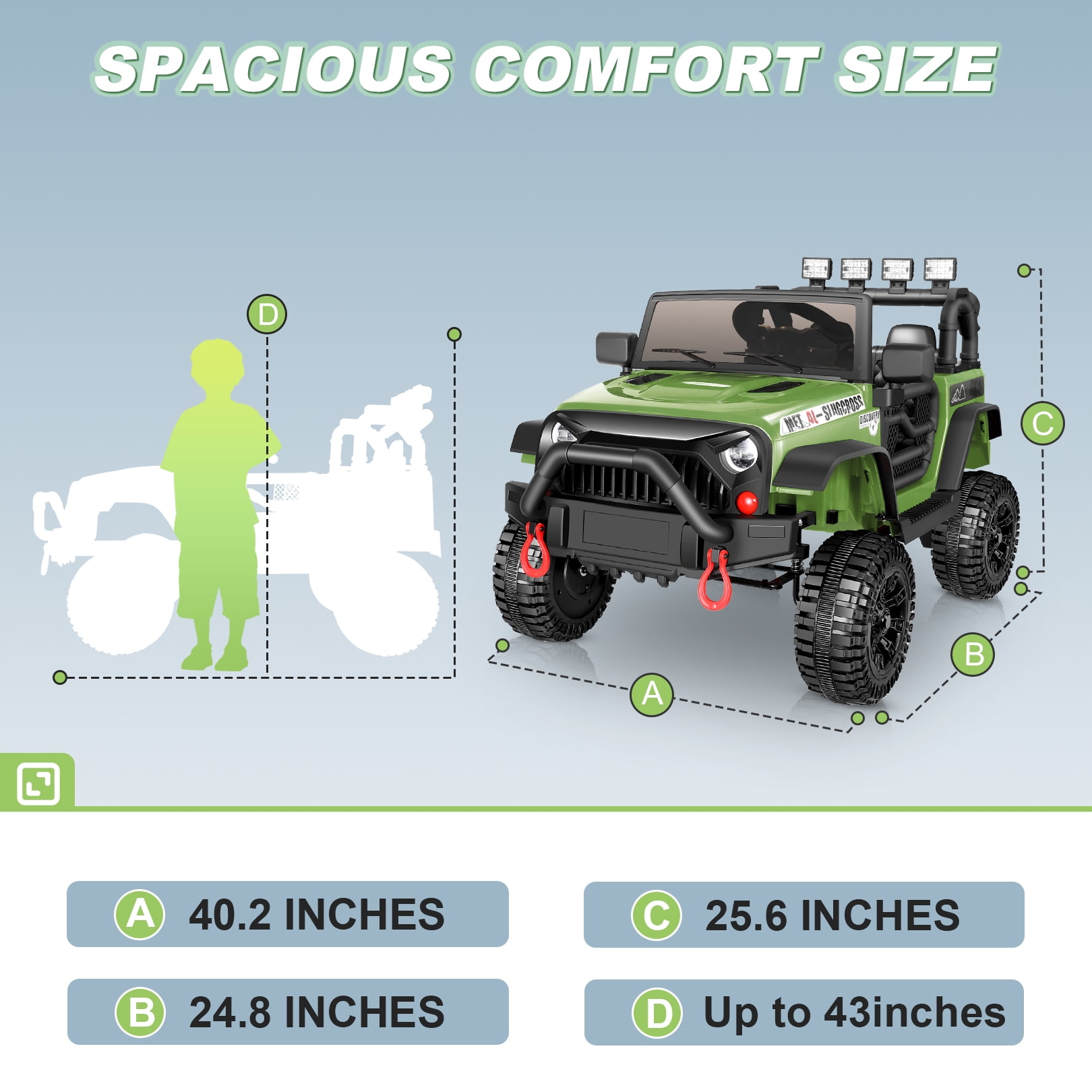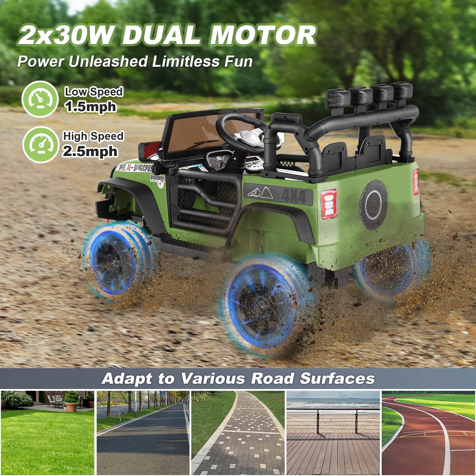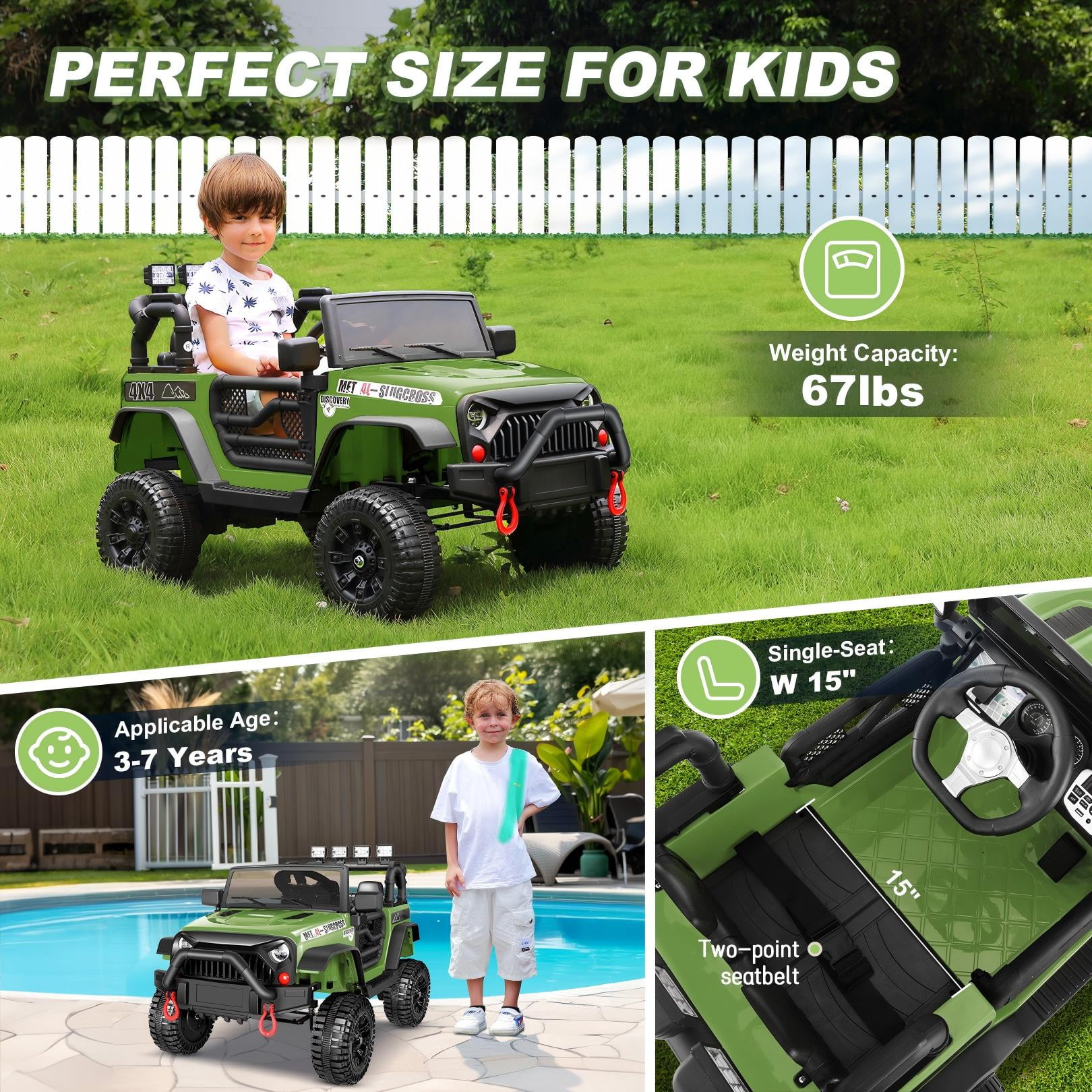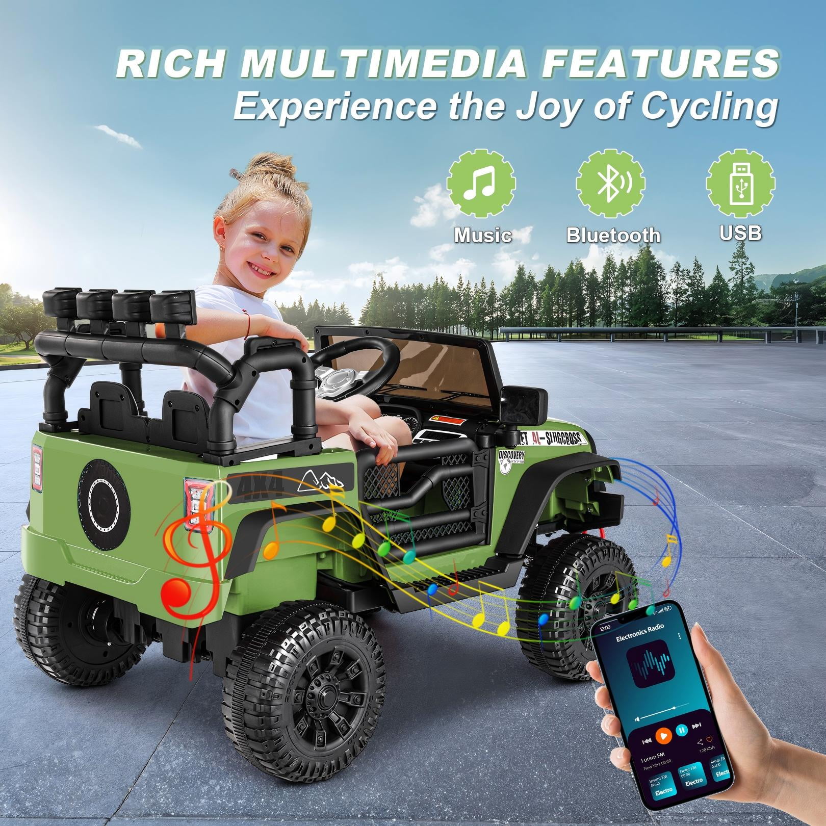 Keyfeatures: Immersive Entertainment Four spring damping systems PP Material Eco-friendly And Durable Kids Self Driving & Parent Remote Control 12V Battery & Dual Drive Motors Powerful Features: Two Driving Modes: Parental Remote Control and Child Self-Driving. Parents can control the car’s operation using the included remote control, which features one-click brake and three-speed adjustment. Meanwhile, children can control the car through the foot pedal and steering wheel. The dashboard is equipped with a master switch, requiring only a gentle press to start or stop the ride. Powerful Performance: The Funcid ride on cars comes with a robust 12V battery and two 30W motors, providing abundant power and extended lifespan. The control panel screen displays the battery level, allowing parents and children to check the remaining power at any time. Kids will enjoy a smooth and thrilling driving experience, creating unforgettable adventures every time. Child-Friendly Design: Our ride on toys for toddlers features a specially designed steering wheel that fits perfectly in small hands, enabling children to handle it comfortably and confidently. The electric ride-on car offers added protection for kids, with features like soft start, lockable doors, spacious seats equipped with safety belts and backrests. The priority control of the remote ensures children’s driving safety. Additionally, the kids ride on toys is ASTM F963 & CPSIA certified and made from non-toxic and odorless PP material, ensuring the health and safety of kids. Immersive Music Experience: The electric car for kids is equipped with a built-in multimedia player, supporting the playback of nursery rhymes via AUX and USB interfaces. Moreover, electric car for kids supports Bluetooth connectivity, giving children endless music choices. The cool LED lights and music add extra fun to the kids’ driving experience. Suitable for All Terrains: The kids ride on car is made of high-quality PP polypropylene material, capable of withstanding rough play and numerous adventures. The high-friction wheels ensure smooth travel on various terrains, from grass to bumpy sidewalks, making it an ideal outdoor companion. The windshield and rearview mirrors also greatly enhance the realism. Specifications: Color: Pink / Red / Black / Geen / Purple Product Size:33.5 x 18 x 19.68 inches (L x W x H) Seat Width:15 inches Material: PP and ABS plastic, metal Rechargeable Battery: 12V 4.5AH Motor: 30W*2 Charging Time: 8-12 hrs Speed: 1.8-3.2 mph RC Mode: 3 Speeds Weight Capacity: 70 lbs Suitable age: 3-6 years old Note: Always keep the child in view when the child is in the vehicle. For the best performance, please ensure to charge the car for 8-12 hours before its first use. We also recommend not charging the car for more than 18 hours per charge to avoid any damage.