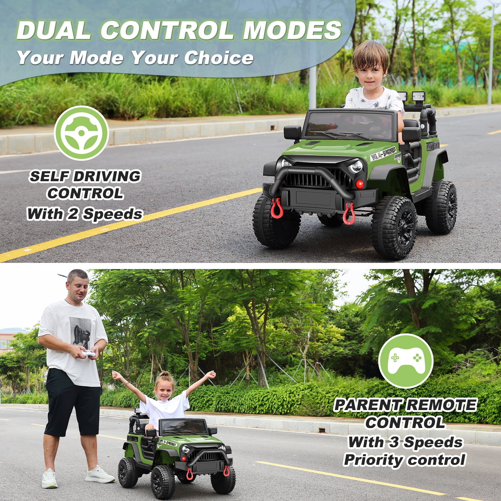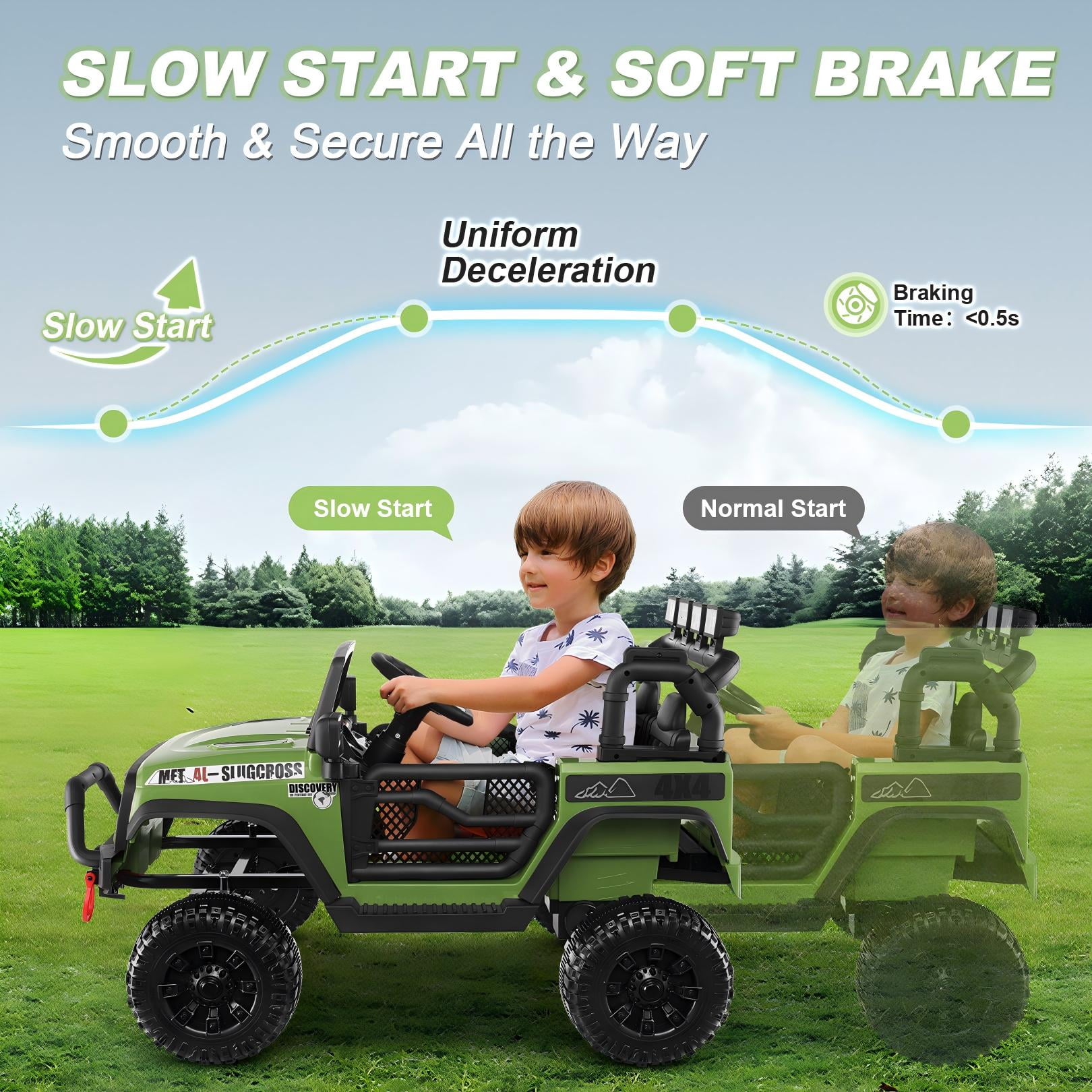 Funcid 12V kids ride on truck is equipped with a powerful dual-drive motor to ensure endless fun for children. Ride on truck has two exciting driving modes, with parents controlling it using the included remote or letting the kids experience the thrill of real driving through the self-driving simulation. The music function adds passion to every journey. Funcid kid car also features a child-friendly steering wheel, allowing little hands to control it comfortably and confidently. With four-spring shock absorption design, ride on car prevents any startles during startup or speed adjustments. The doors can be locked, and the soft, spacious seats come with safety belts and backrests to enhance safety. Embark on an adventure with our kids’ electric ride on and create unforgettable memories!