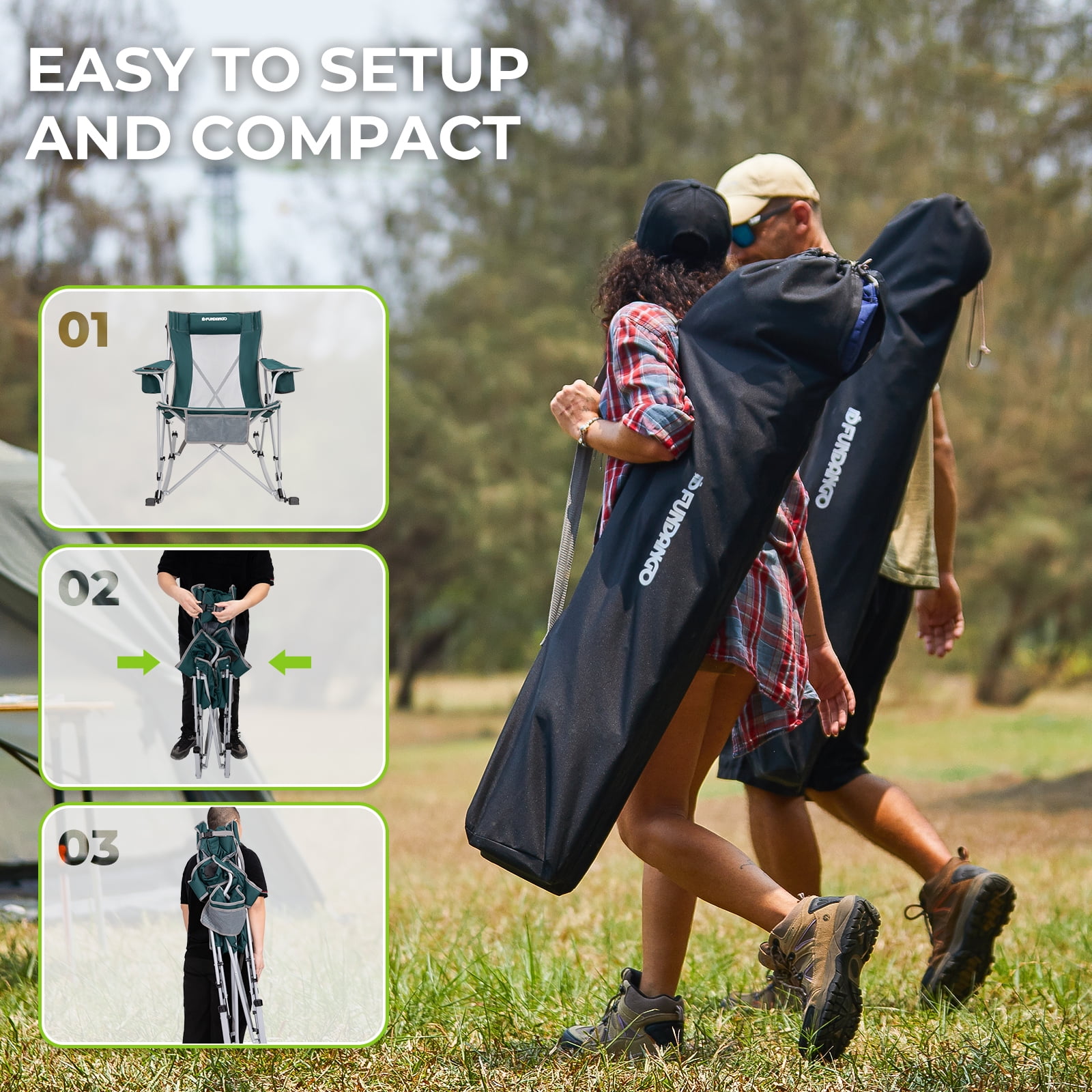 Rocking Chairs Let Your Enjoy Outdoor Life More: FUNDANGO rocking camping chair has the prefect rocking design.You can rock your body in the swinging camping chair and listen to music, watch the scenery, drink your favorite drink. You can forget about the troubles and stress of work and make your outdoor life more relaxing. Comfortable & Breathable Chair:Â Our reclining camping chair bottom use 600D PVC fabric make the lawn chair more durable, and the back use mesh fabric make the rocker camping chair more breathable.Ergonomic high back design, cotton headrest and armrest design, make you relax on the lounge chair more comfortable. Durable & Strong: FUNDANGO swinging camping chair is made of thicker steel frame, more durable and make sure the oversized rocking chair can support to 220 LBS for adults. The camping swing chair lounger back with the fastened X-shape and reinforced joints, Comfortable Support ensuring your long time using. Easy to Set Up & Carry: Small pack size (45.6″ x 7.4″ x 3.9″) and light weight (11 lbs) with convenient storage bag make the ultralight camping chair easy to take anywhere. Camping, Patio, Picnic, Sports game, or BBQ. Sit or rock comfortably, everywhere you go. More Usage: You can use lightweight reclining lawn chair as a camping chair, folding chair, lawn chair, travel chair, beach chair and more. Suitable for outdoor adventures, tailgating, fishing, backpacking, beach, picnic, sport games, car travelling, or just put it in the backyard, cabin, balcony, patio lawn parties.