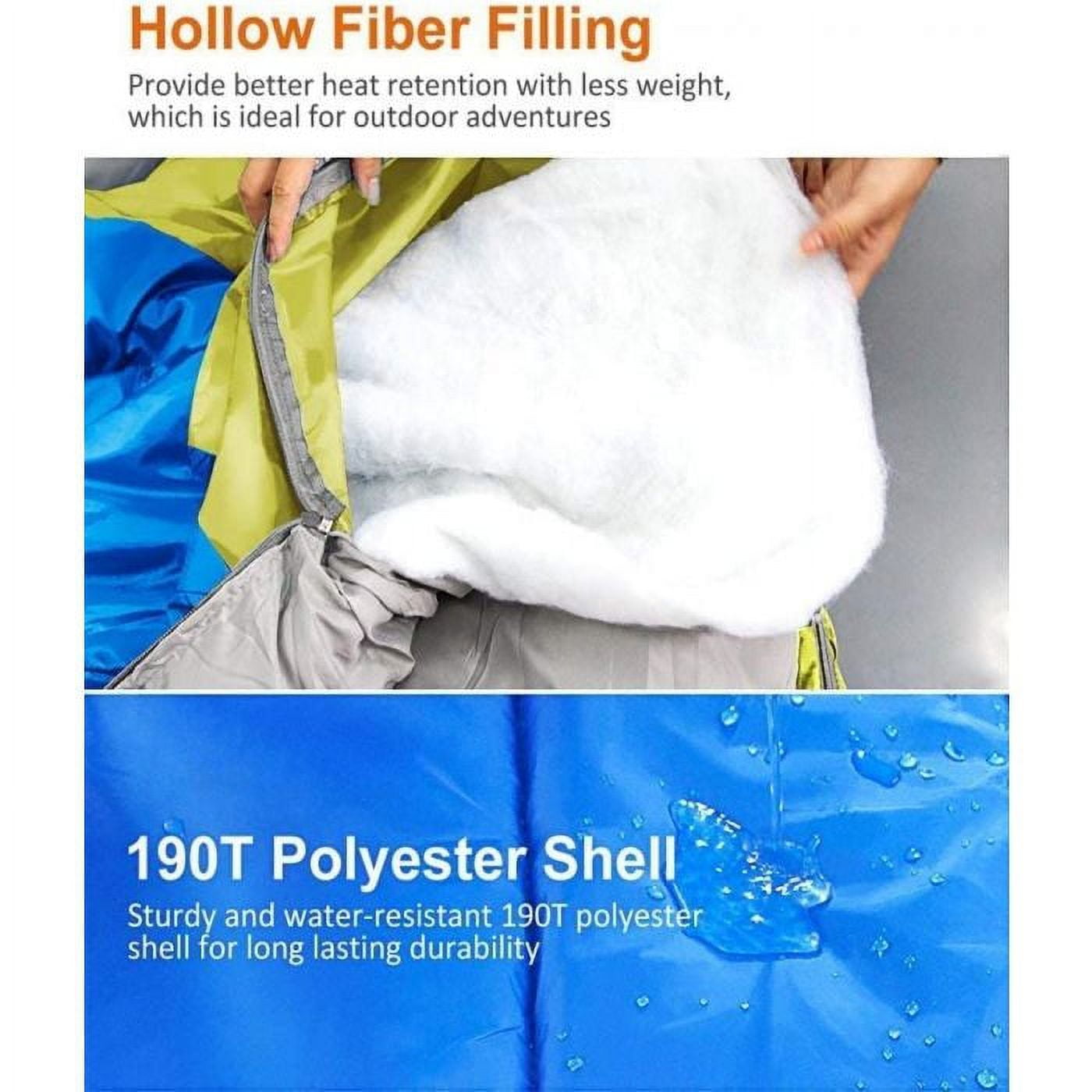 Double Wide Sleeping Bag: This camping sleeping bag is big enough for two adults. With two sides zipper design, the top half and bottom half can be separated to make two single sleeping bags, meanwhile it is a good choice to use it as quilt or blanket. Two convenient outer pocket with zipper to hold flashlight, wallet, keys ,watch and other valuables. Warm Weather Sleeping Bag: The outer fabric of this adult sleeping bag is 100% polyester 190T which is waterproof. The filling is hollow warm loft 250 g/m2 which make the bag warm. Full-length, insulated draft tube prevents heat loss through the zipper. Comfortable Sleeping Bag: The lining material is 100% micro-brushed polyester which make the bag soft and extreme comfort when your skin touch against it. Wide bottom room is convenient to move your legs. Unzip bottom for extra ventilation on warmer nights. Two pillows are included. With two-way separating zips on two sides, it will be very convenient for you to get in and out without disturbing your partner and keep warm. Four straps at the bottom are designed to hang or dry the sleeping bag. Durable Sleeping Bag: The Fundango sleeping bag comes with super durable, reinforced zippers, zipper guards, tight compression sack, will ensure the bag durable in countless adventures. Full-length zipper webbing protects against snags. Sturdy polyester taffeta shell stands up to years of use. Portable Sleeping Bag: The sleeping bag can be compressed to22.4 ×12.6×12.6inches as a small package for easy transport and store with its compressed carry bag.