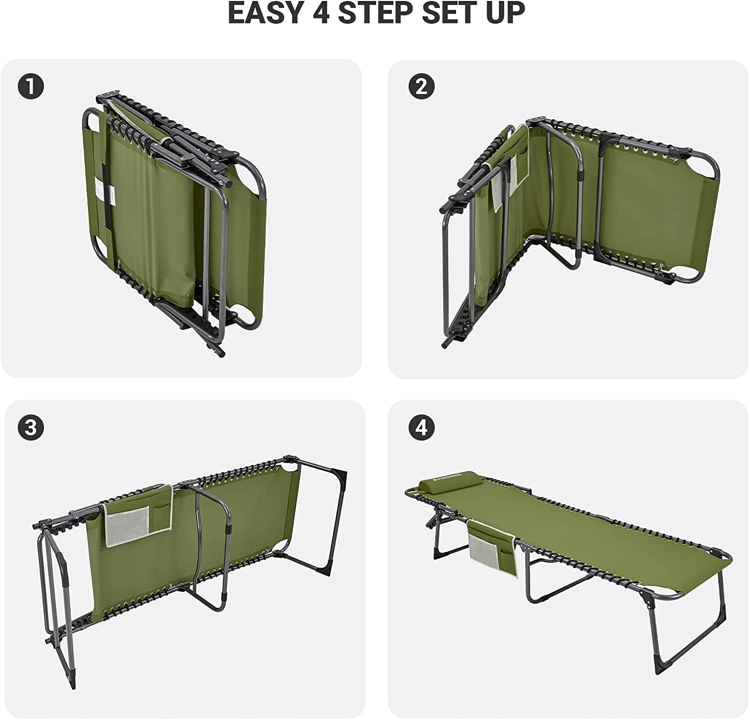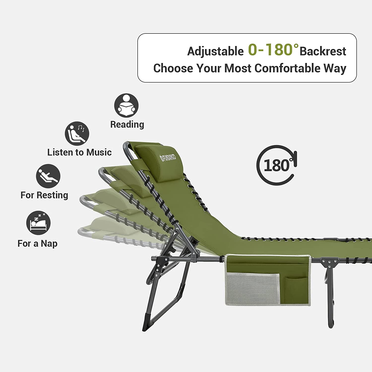 FUNDANGO Camping Chairs Outdoor Folding Chaise Lounge Chair Adjustable Reclining Chair with Pillow, Supports 265lbs, Green