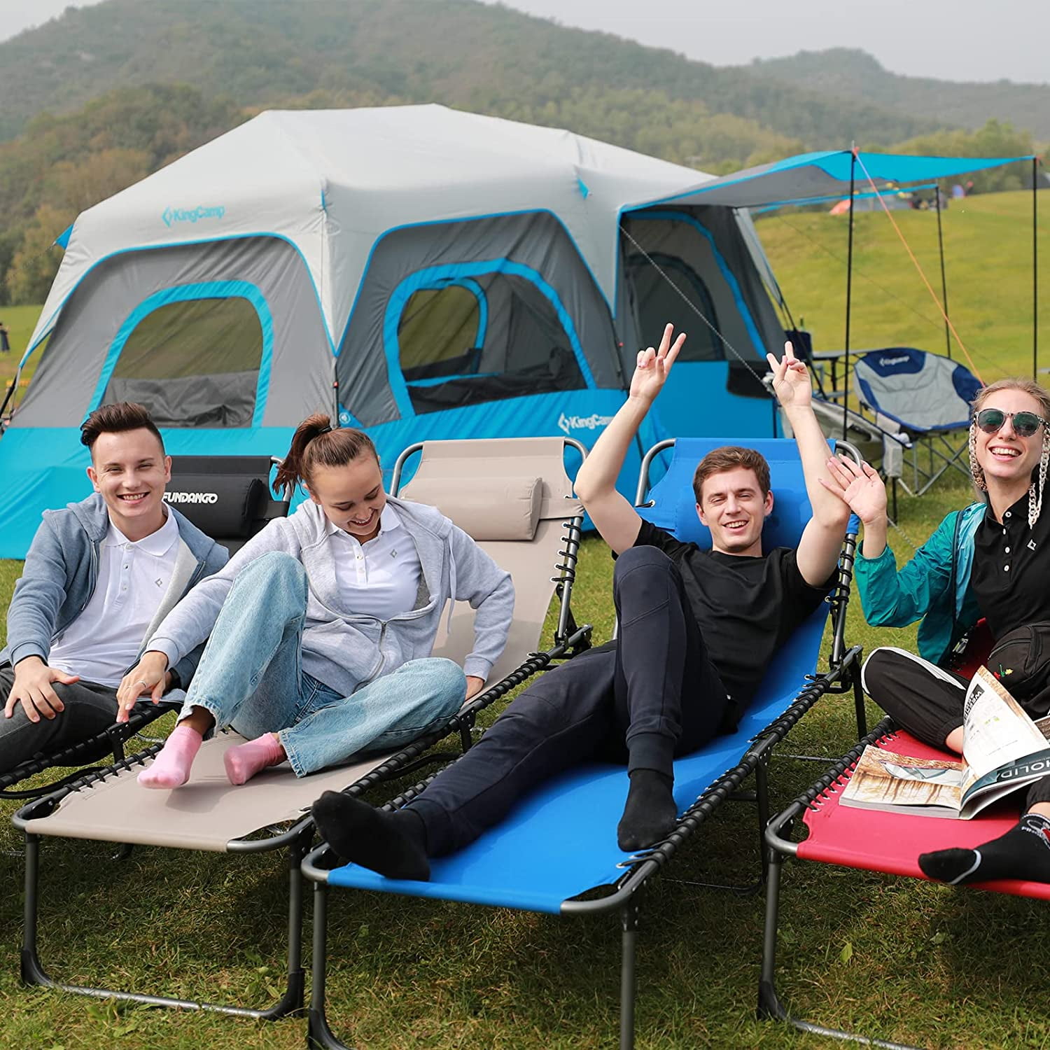 【4-Fold Lounge Chair】The chaise lounge with triangle locking system, which allows you to lock the chair in different positions, you can sit up, recline or lay flat. Ergonomic design to reduce your muscle tension and stress,perfect balance between firmness and softness. Lays completely flat as a camping cot. 【Sturdy and Comfy】The dimension of the Reclining chair is 74.8×23.2×13.3/14.5in, fits people up to 6.2 feet. Packed size: 29.9×23.2×5.9 inches, weight 14.1lbs. Constructed of anodized steel and durable,breathable 600D oxford fabric suspended by double bungee system, footrest cover and foot pads helps from sinking into mud or loose ground. Heavy duty steel tubes that can support a weight of up to 270lbs 【Multipurpose Folding Lounge Chair】The lounger is ideal for outdoor and indoor using. You can take it to the the beach, patio, pool, lawn, garden, deck, office Nap, bedroom, balcony, or as a temporary bed for your guest. Relax yourself in backyard, enjoying the sunbathing or listening to the waves at beach. 【Quick Open & Fold】No tools needed! Just fold everything out, and you’re done. Only spend your few seconds. **Please check that the back bracket snaps into the slot when adjust the position. 【Removable Pillow & Storage Bag】The padded wide pillow is adjustable and completely removable allowing it to serve as a headrest, lumbar support or for other support purposes. 3-IN-6 storage pocket for storing your cell Phone, keys, water bottle, toys, earplugs & More. Easy for washing and providing a more comfortable experience. 【CUSTOMER GUARANTEE】This chair comes with 12-monthes warranty, and a 100% satisfaction guarantee. If you have any questions, please contact us directly.
