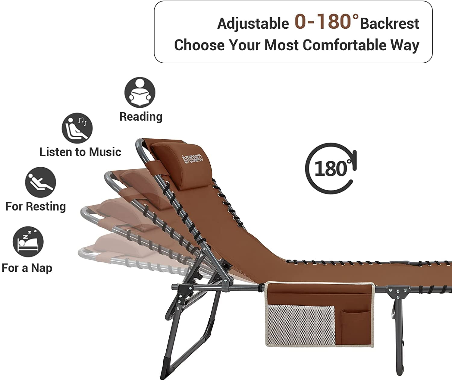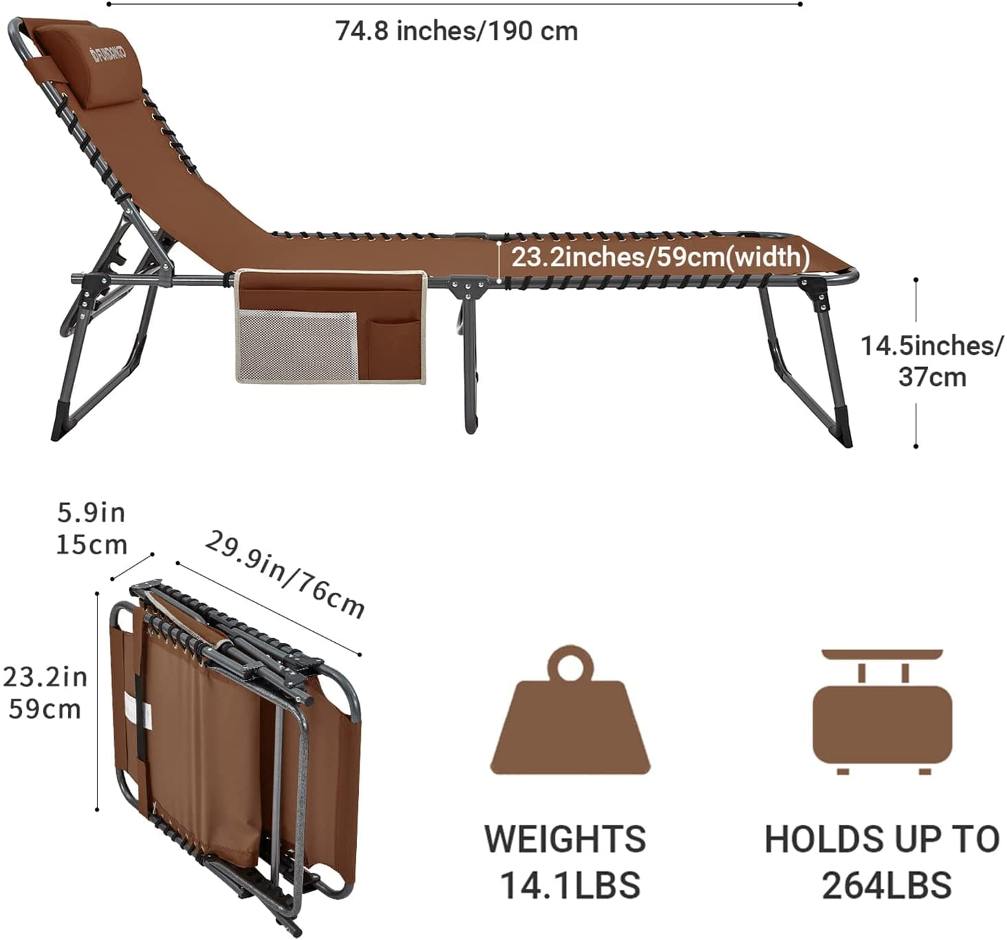 FUNDANGO Outdoor Folding Chaise Lounge Camping Chair, Adjustable Reclining Design with Pillow, High Weight Capacity (265lbs), Perfect for Beach & Pool, Khaki