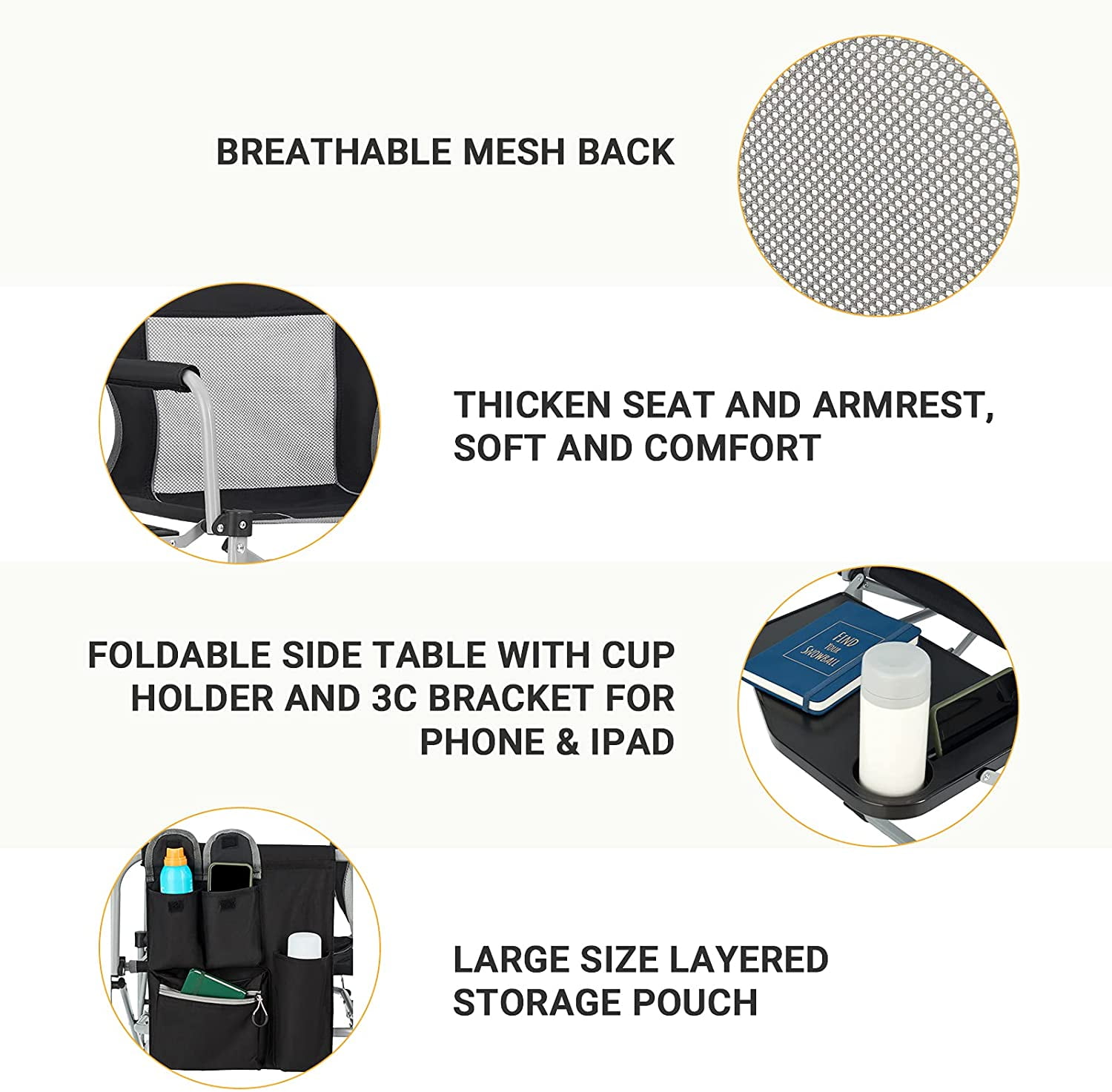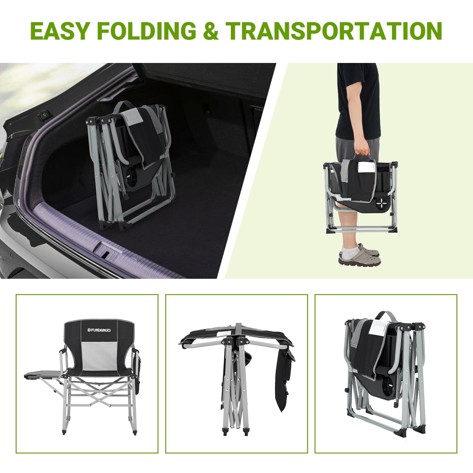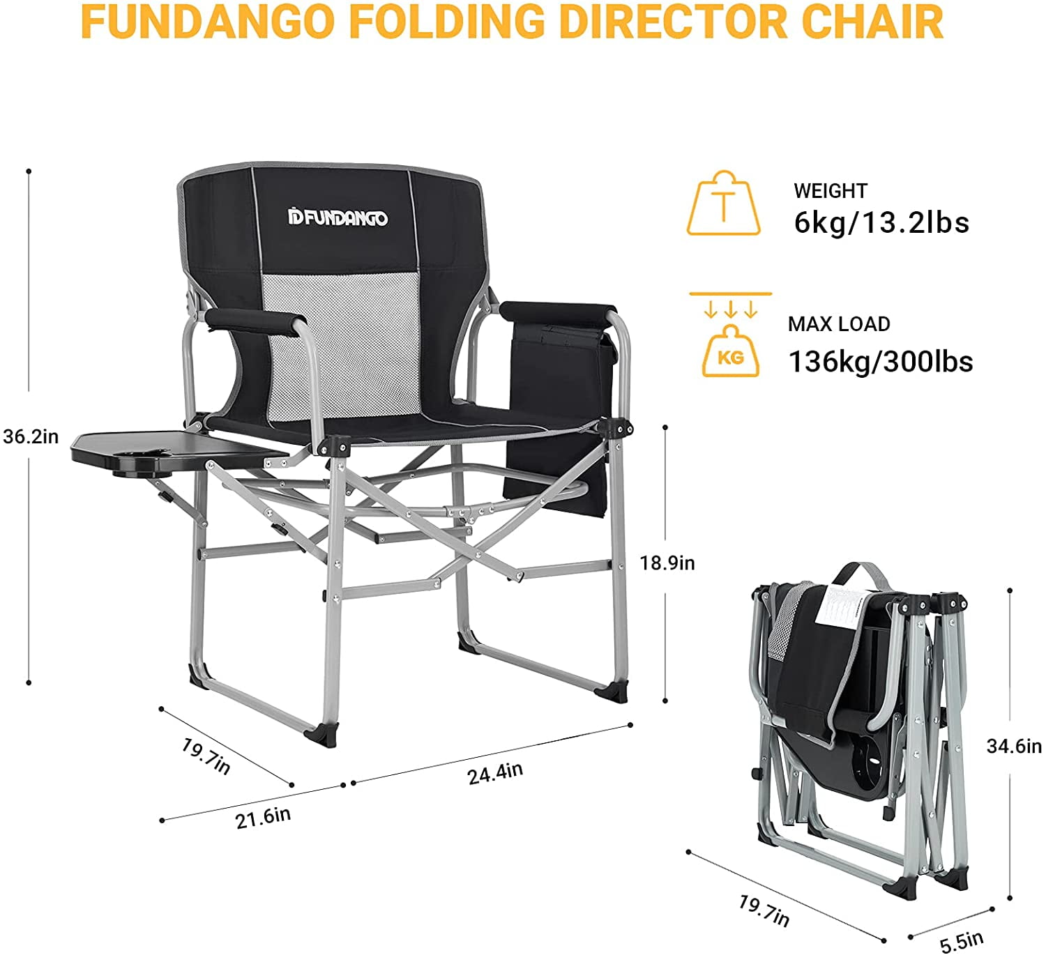 FUNDANGO Black Heavy Duty Directors Chair with Side Table for Camping, Portable Folding Camping Chairs for Outside, Foldable Outdoor Chair Support 400lbs, Oversized Beach Chair for Sports, Black