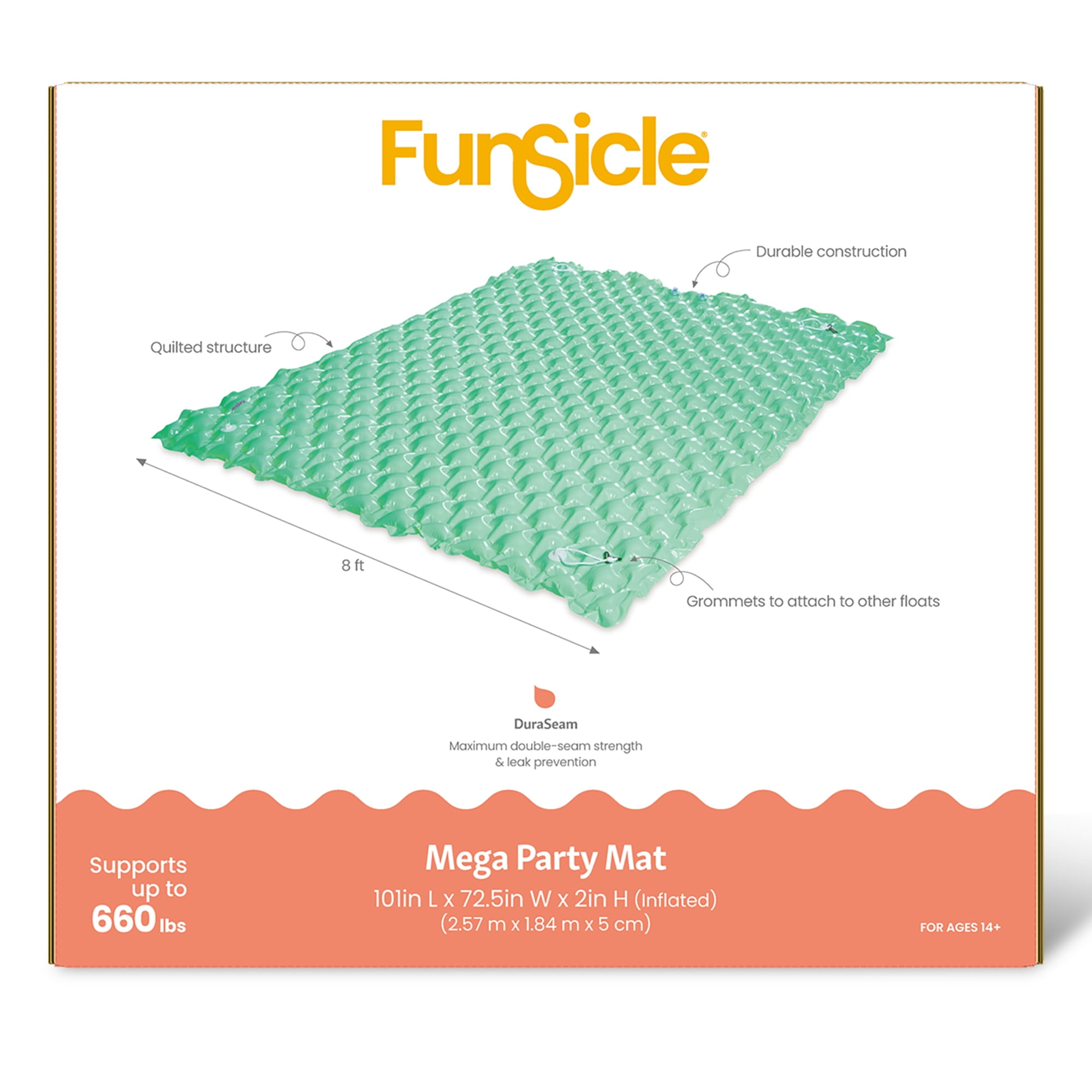 MEGA PARTY MAT: FRESH MINT – 101″ – There’s nothing minimal about the Funsicle Mega Party Mat. Perfect for socializing on the water with your best buddies, this 8ft wide inflatable mat has room for everyone. You can stretch out in comfort thanks to the soft quilted design. Grommets are included for attaching the mat to other floats – keeping the party together and your mat secured. This giant pool mat is a sturdy choice, made from durable, puncture-resistant materials. Once the fun’s done, roll it up and carry it anywhere. The Funsicle Mega Party Mat is a supersized summer essential for fun events.101×72.5×2″, Supports Up To 660 lbs.