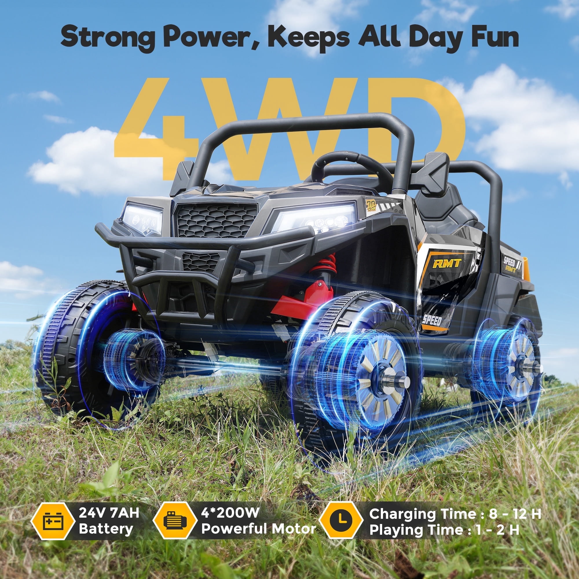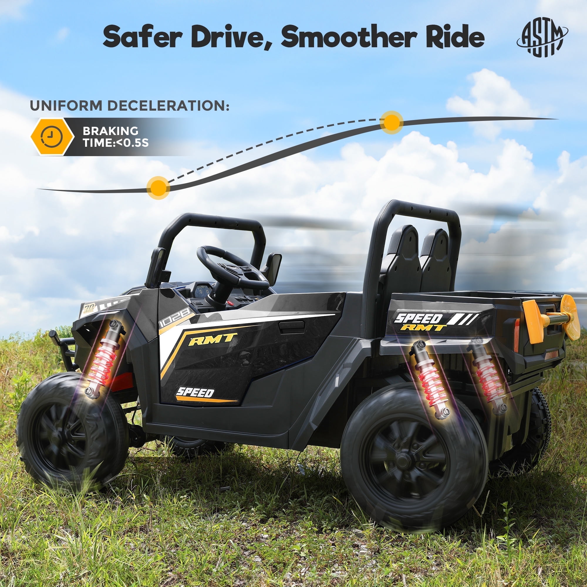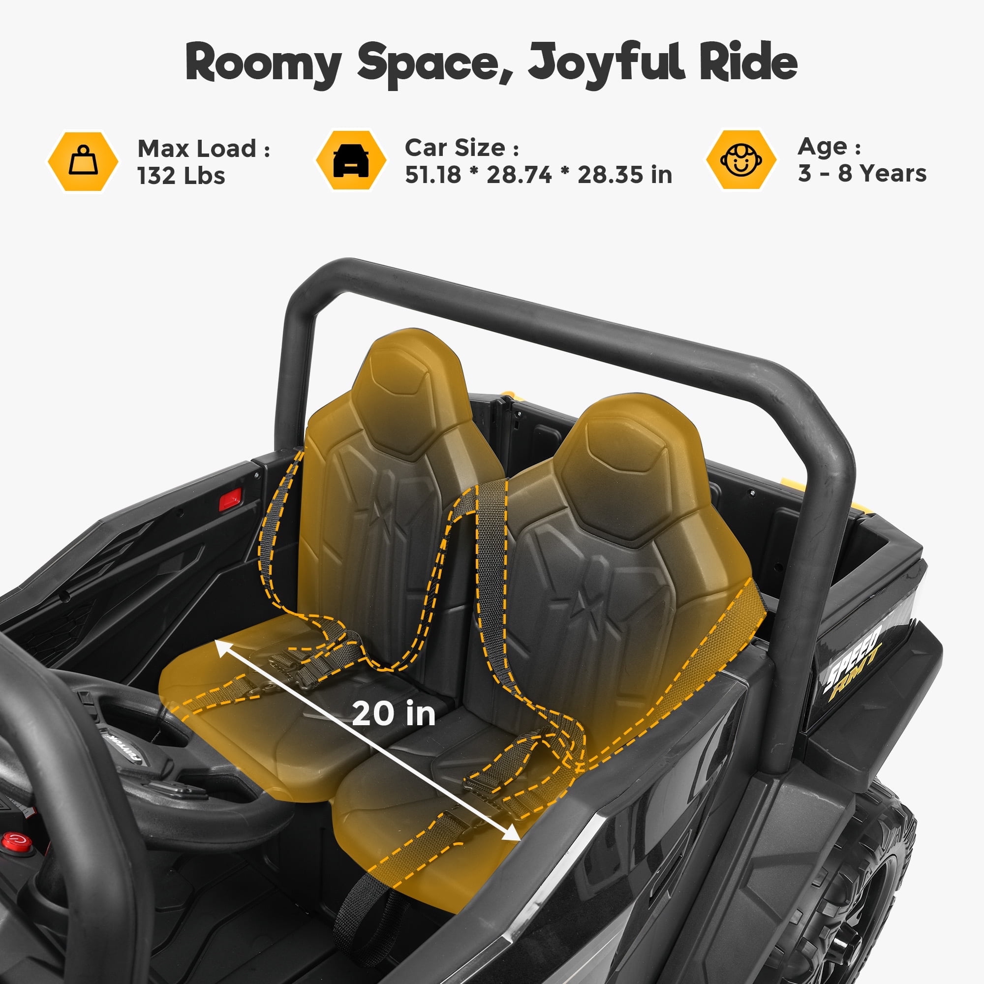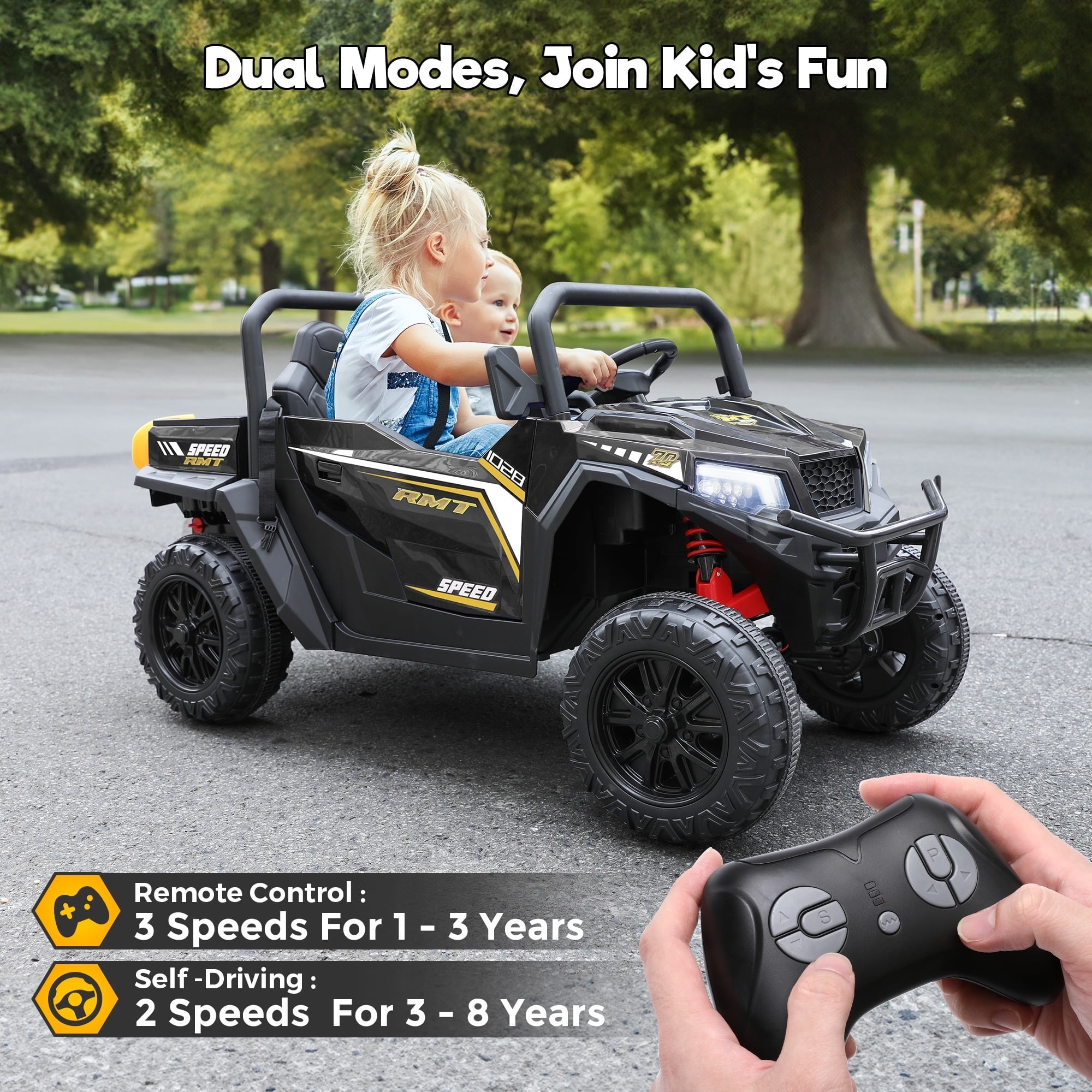 Electric Ride On Dump Truck Key Features: 4 x 200W Powerful Motors 24v ride on toys for big kids is equipped with powerful motors and 4 wheels spring suspension, providing ample power while effectively absorbing bumps. It can smoothly handle surfaces like grass,brick road,rubber road,asphalt road. Real Driving Experience Motorized cars for toddlers 1-3 features a large dump bed with a tailgate.Your little one can effortlessly operate the dump bed with the switch, and the provided shovel is great for hauling and clearing debris, leaves, or snow. 24V ride on UTV boosts your child’s hands-on skills and communication abilities, delivering an authentic UTV vehicle driving experience. Spacious 20″ Wider Seater Kids ride on car with remote comes with 2 wide seats. The maximum weight capacity for this electric truck for kids is 132Lbs, providing a comfortable and roomy ride for children aged 3 to 8. 2 Riding Mode Your child can operate the 2 seater ride on car for kids independently using the steering wheel and pedals,enjoy 2 different speeds.Parents can control their toddler electric car 2 seater with a 2.4GHz remote with 3 speeds.Highest speed reaches 5 mph.Press the P button to activate the emergency brake. Fun Entertaining Function 24v electric ride on vehicles for kids equipped with the Buletooth,MP3 player, USB port.One-button start design,real foot pedal acceleration, steering direction control,bright LED lights and loud horns add more fun.These realistic functions will make your kid’s ride more enjoyable. 【Perfect Present for Kids】 Electric car for kids 2 seater is the safe present for boys and girls on Birthdays,Thanksgiving, Xmas, New Year’s, Children’s Day, and other holidays that brings endless smiles and excitement to kids. Specifications for Battery Powered Cars for Kids: Product Name : Ride on Dump Truck Safe Certificate : CPSIA Battery Type : 24V 7AH Motor Type : 4 x 200W Color : Black / Pink / Blue / Red / Green Recommended Age : 3 to 8 years Material : PP(Polypropylene) and Iron Maximum User Weight :132 lbs (60 kg) Maximum Speed : 3 – 8 km/h (2.67-5 mph) Charging Time : 8-12 hr. Run Time :1 hour – 2 hours(Depending on the child’s weight and riding speed) Music Function : Bluetooth / MP3 player / USB port / FM Controller Batteries : 2 AAA batteries (not included) Product Size : 51.18 inches (L) x 28.74 inches (W) x 28.35 inches(H) Package Includes : 1 x Two Seater Ride On Toys 1 x 2.4G Remote Control (Batteries not included) 1 x Charger 1 x Shovel 1 x Manual Warm Tips : 1. Please carefully check the size of the electric cars for toddlers 3-5 and combine the children’s age and body shape when purchasing. 2. Always keep the child in view when the child is in the battery car for kids. 3. For the best performance, please ensure to charge the kids cars to drive for 8-12 hours before its first use.