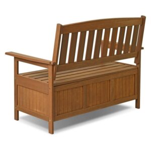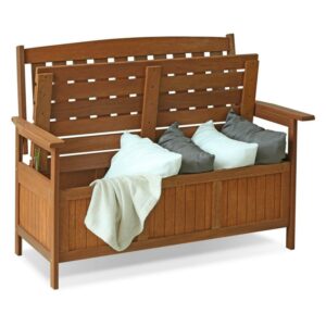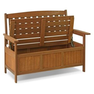 The Furinno Tioman Outdoor Hardwood Kent Storage Box Bench is a versatile addition to your outdoor setup. It boasts hardwood and plywood construction for lasting use. It’s treated with teak oil to withstand outdoor elements. The seat lifts up to reveal a roomy storage compartment for pillows, blankets, and other items.