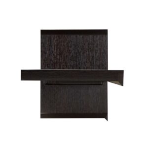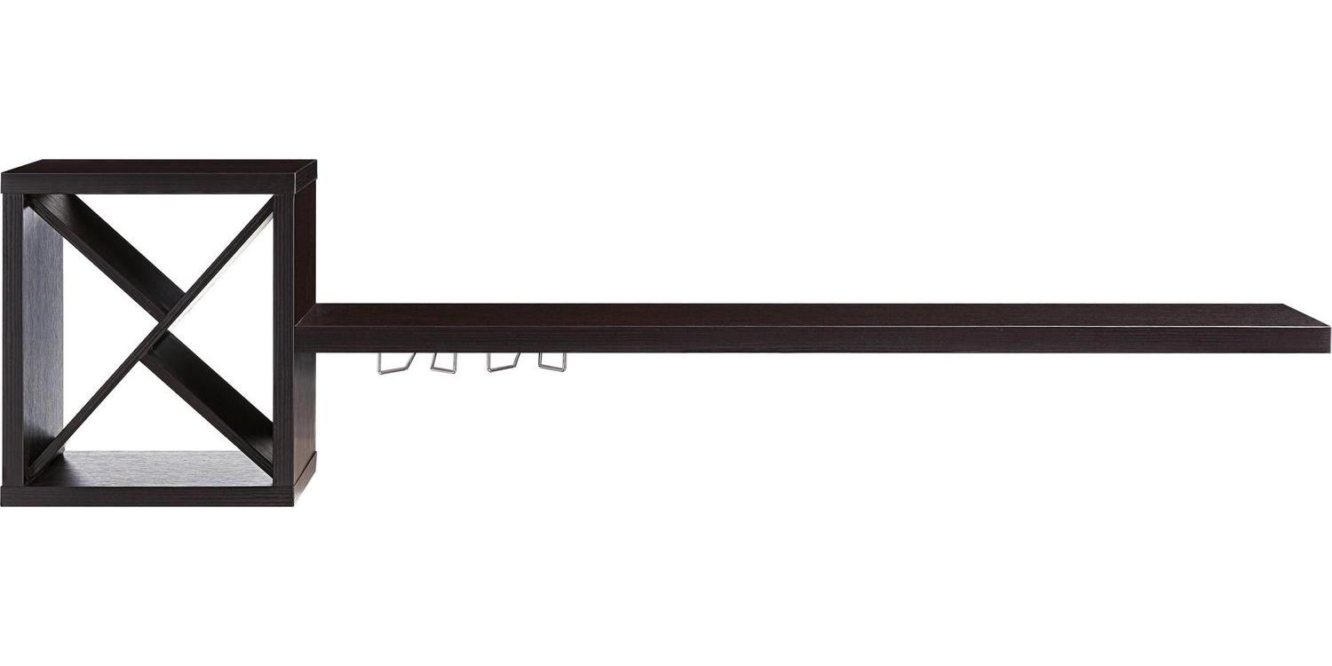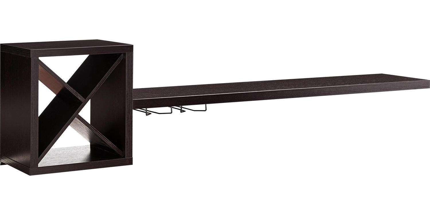 This espresso-finished wall-mountable bar has cube’s shifted panels to create unique compartments for your standard wine bottles. A long and spacious table stretches out of the cube to greet guests in a mingling environment. Beneath this table is two silver metal stemware racks for an accessible serving station.