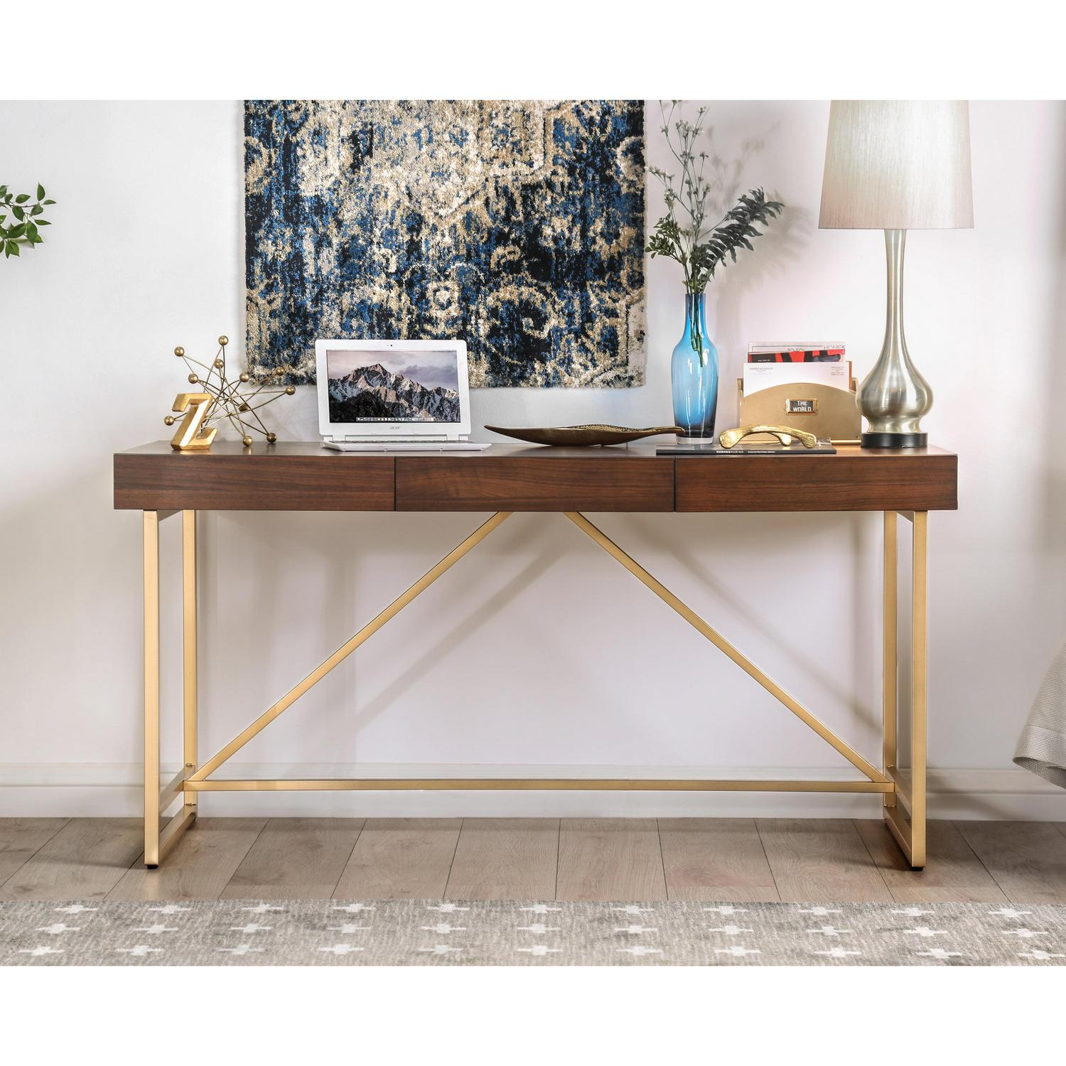 Make the most out of your workspace with the ample contemporary style Maurice desk. The desk offers plenty of tabletop space for your PC, laptop, and work supplies. Keep your small items stowed out of sight in the three drawers helping everything look nice and neat. It also comes with two drawers on roller glides that let you tuck away writing utensils and other office supplies. Plus, this desk features safety stops on the drawers to prevent little fingers (and big fingers!) from getting pinched. Easily pair the light oak and gold tone with any color schemes and contemporary, modern, and rustic decor.