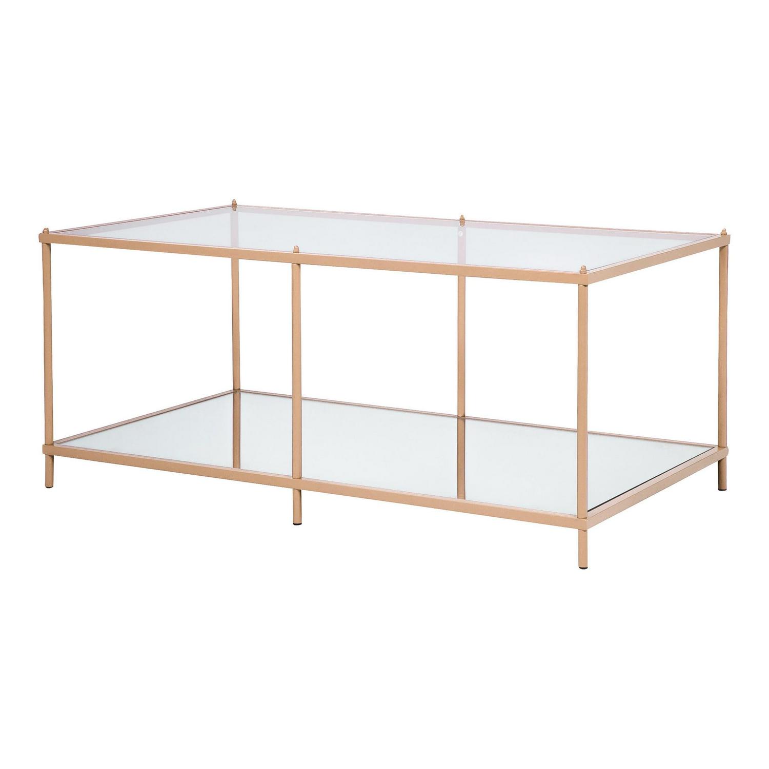 Inject a little color with the energetic, fun presentation of this modern minimalist coffee table with steel frame. It shows off a clean rectangular silhouette that adds plentiful tabletop and display space with a tempered glass top complemented with a mirrored lower shelf perfect for showing off favorite personal treasures. Its steel frame is slender and delicate, with six legs and hardware details that add dimension and catch the eye.