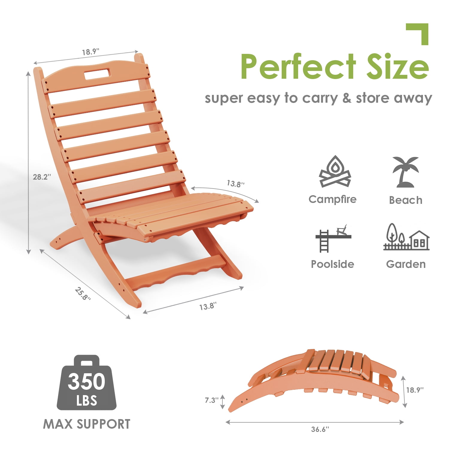 X-shape & Ergonomic — Folding Xavier Chair is low-slung, portable seating with waterproof HDPE frame, seat and back. The charming and comfortable design is perfect for outdoor relaxation or activities, and also folds easily for storage or transport. No Assembly Needed — Comes with 1 backrest piece & 1 slated seating piece. Takes 1 second to put them together or disassemble them. No hardware or tools needed! Can be used all season long with basic care and be easily stored away in the off-season. True HDPE HDPE — (High Density Polyethylene), gives a better quality and safer experience than typical material PE or PS.Unlike the normal wood chair, HDPE Xavier chairs are waterproof, weather-resistant, fade-resistant, and will not chip, peel crack, and rot as well, making it the perfect choice for outdoor useOverall product dimensions: 18.9″W x 25.8″D x 28.2″H (Single Chair). Maximum weight capacity: 350 lbs. Product weight: 18 lbs (Single Chair). It brings you an amazing outdoor experience no matter you?re fishing in lakes or having a wonderful conversation with your mates around the campfire.