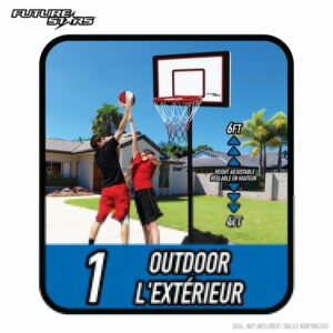 Future Stars 4 in 1 Basketball System – Outdoor, Indoor, Pool-Side and Over the Door! Height Adjustable from 4′ to 6′ with a telescopic pole. 27″ Injected Backboard is perfect for the driveway, playroom, by the edge of the pool and then fits over most doors! 15″ Metal Rim with Nylon, weather coated, tri-color mesh, you can use a regulation size basketball. Portable wheeled base can move around easily and it can be filled with water or sand. Specially designed backboard can be removed from the metal stand, equipped with the over-the-door hook and placed on any door! Tightening toggle on the padded over the door hook ensures the backboard is tight to the door to avoid rattling.