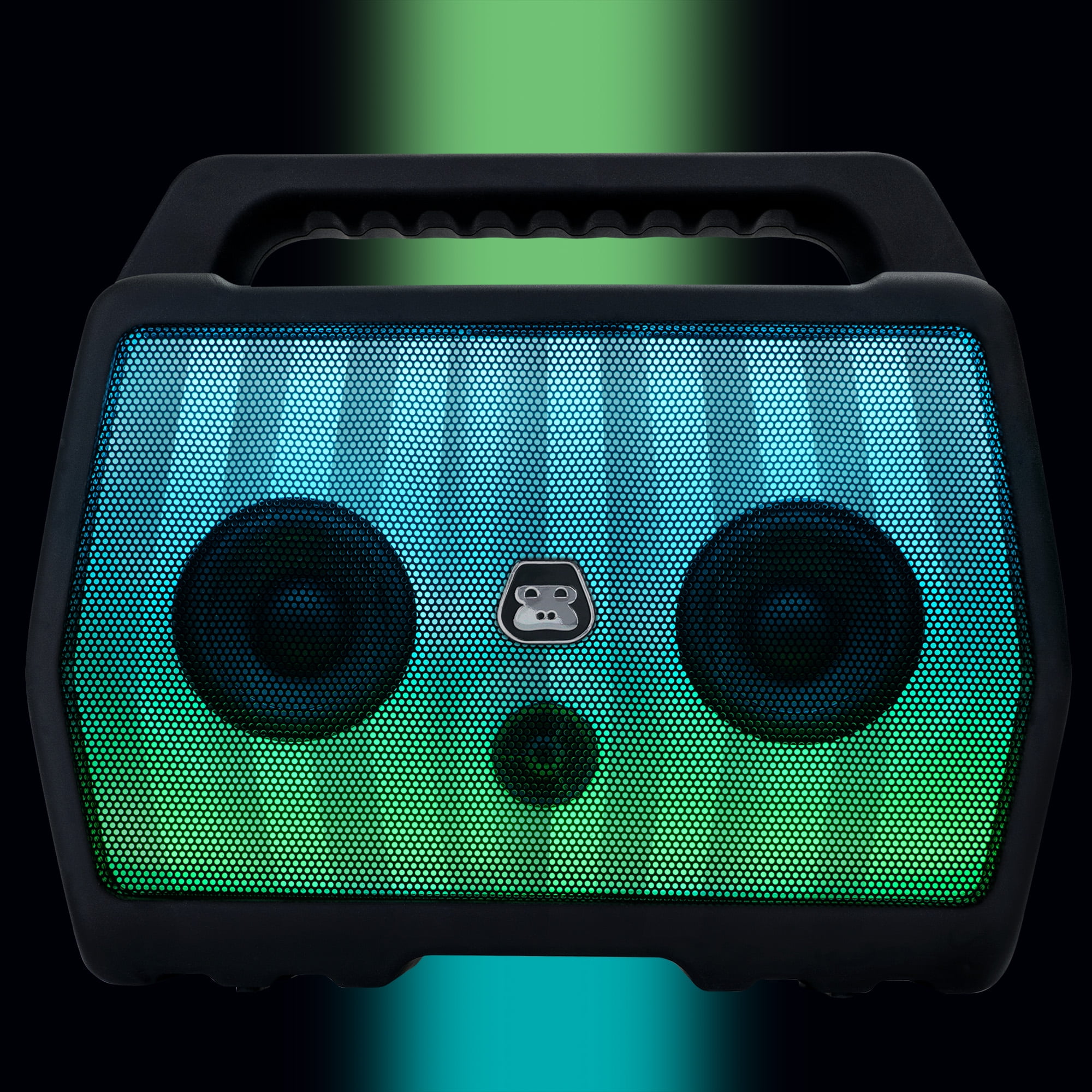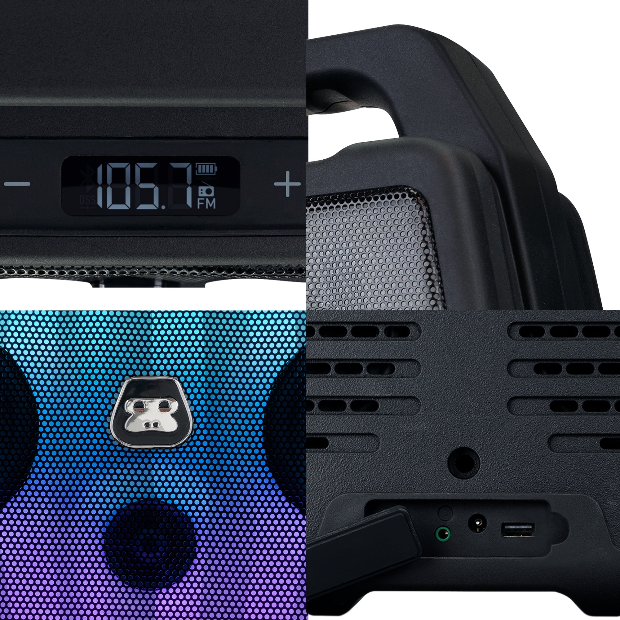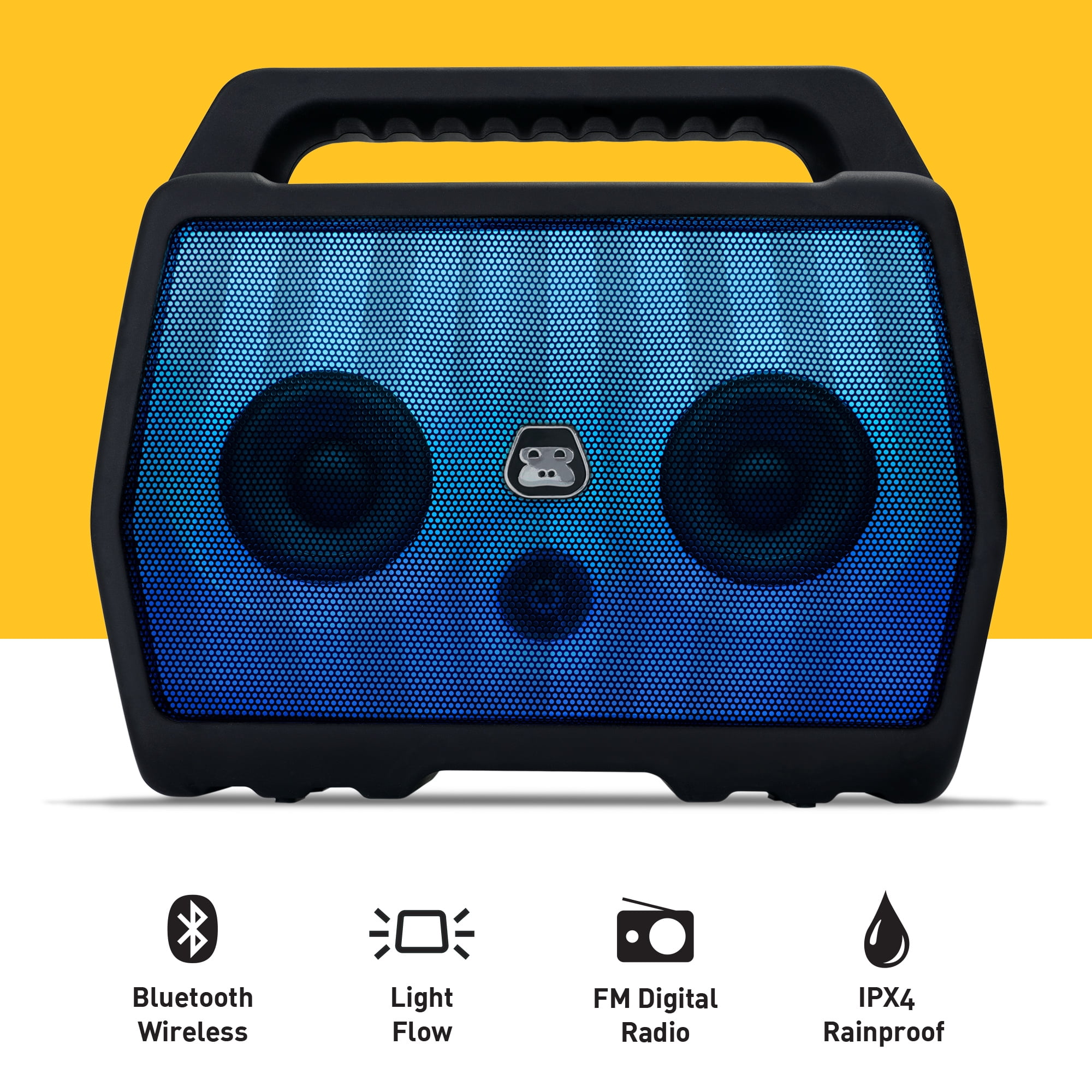 Powerful Sound, Bass that Carries: Delivered through a 2.1 speaker configuration, dual-rear bass radiators and built-in EQ with three optimized presets Light Flow: Full color front light panel with moving lights and color changing patterns that move to the beat of the music Built Tough: IPX4 Rainproof Water Resistance. Built with a rugged housing structure, protective base, and reinforced handle that’s engineered tough. Wireless Streaming: A simple one-button wireless pairing to connect to your mobile devices, smartphone, tablet or computer with Bluetooth Rechargeable Battery: Built with rechargeable battery with 12 hours playback with Bluetooth audio for on-the-go adventure and 9 hours playback with with the light show to party all night.