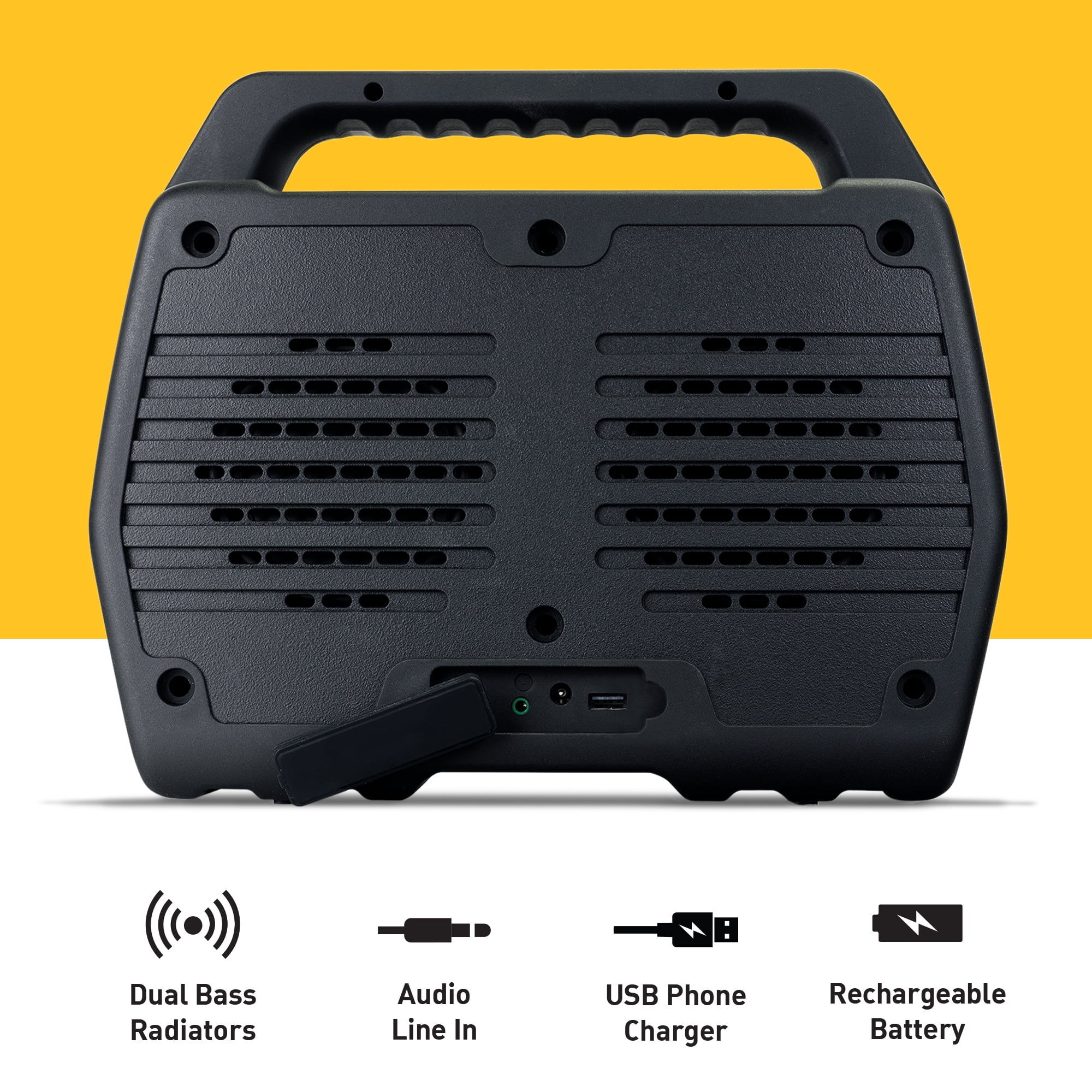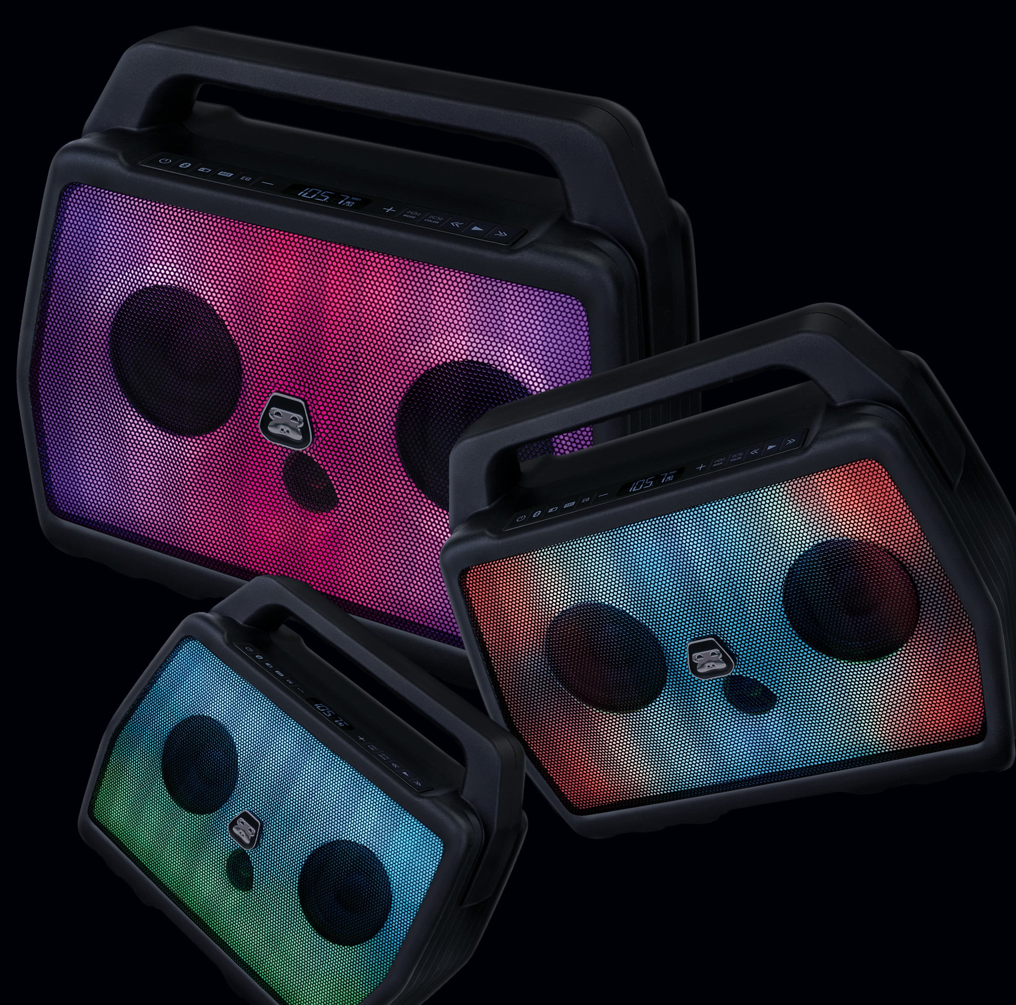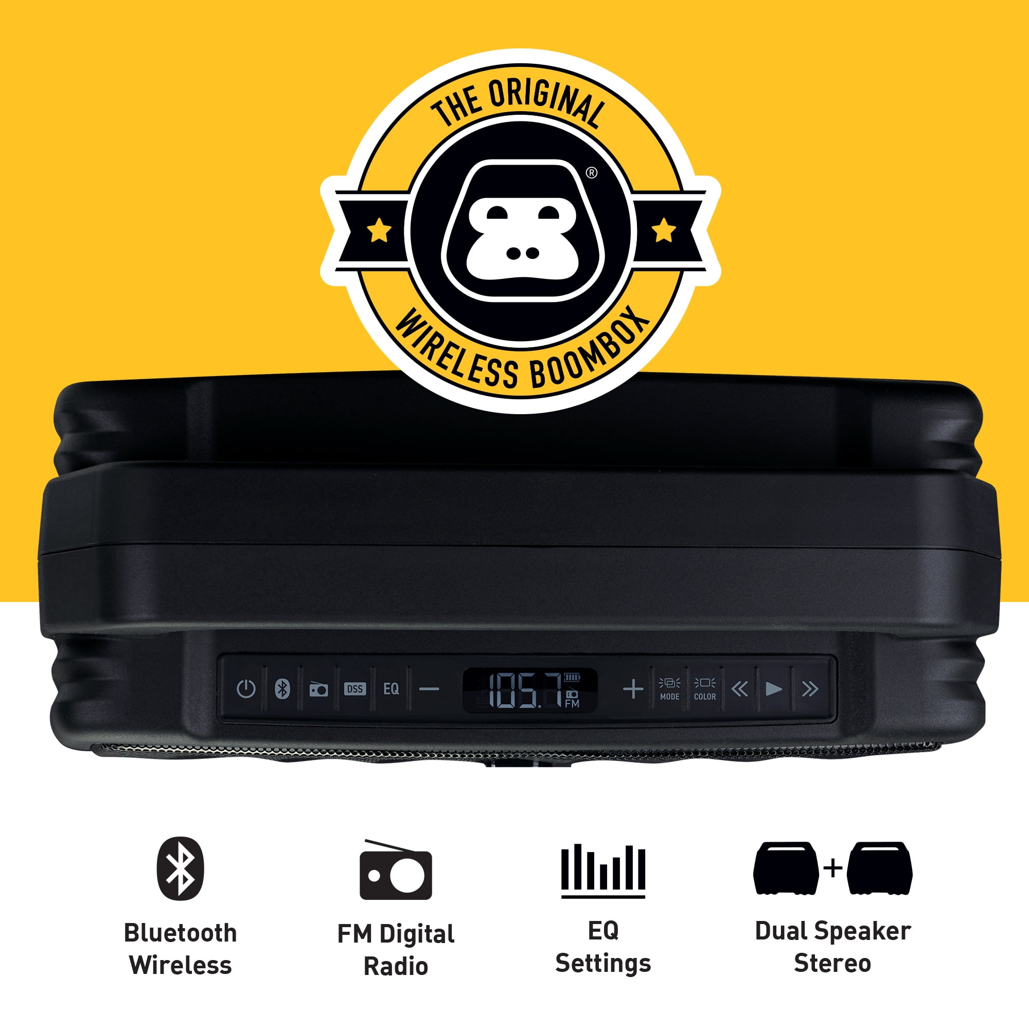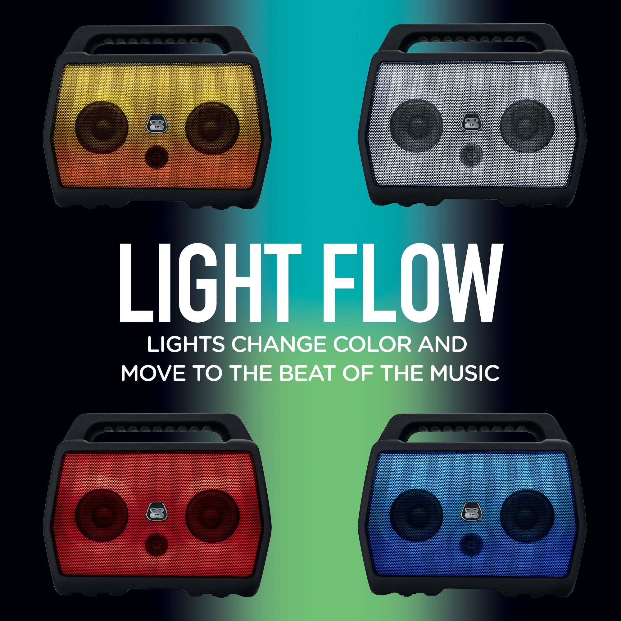 MEET G-BOOM4 The original Bluetooth boombox just got better. Meet G-BOOM4 featuring Light Flow color changing light panel that moves to the music. G-BOOM4 is the ultimate Bluetooth speaker that pumps out big sound in a rugged, water-resistant, portable package. Sturdy enough to take on any adventure and loud enough for your neighbors to hear — whether they like it or not. G-BOOM4 FEATURES Powerful Sound, Bass that Carries: Delivered through a 2.1 speaker configuration, dual-rear bass radiators and built-in EQ with three optimized presets Light Flow: Full color front light panel with moving lights and color changing patterns that move to the beat of the music Built Tough: IPX4 Rainproof Water Resistance. Built with a rugged housing structure, protective base, and reinforced handle that’s engineered tough. Wireless Streaming: A simple one-button wireless pairing to connect to your mobile devices, smartphone, tablet or computer with Bluetooth Rechargeable Battery: Built with rechargeable battery with 12 hours playback with Bluetooth audio for on-the-go adventure and 9 hours playback with with the light show to party all night. CUSTOMER SERVICE We stand behind our products and want all of our customers to enjoy their G-Project speaker on every adventure you go on. If you have any questions, our US-based support team is here to help via email and phone. Wireless Bluetooth Boombox Speaker, Rugged Portable with Rechargeable Battery LIGHT FLOW Color changing light panel that moves to the music BUILT TOUGH IPX4 RAINPROOF with ruggedized housing construction, port covers and integrated handle for easy carrying RECHARGEABLE BATTERY for up to 12 hours of on-the-go playtime / 9 hours with Light Show on FM DIGITAL RADIO to simply tune in and enjoy music, news, and sports anytime CONNECT QUICKLY AND EASILY IN SECONDS to Bluetooth devices including: iPhone, iPad, Android phones, Samsung and Tablets; Play audio from laptops, PC’s and non-Bluetooth devices using the 3.5mm / AUX-IN jack ON BOARD CONTROLS allow you to play and skip tracks wirelessly with buttons right on the speaker PAIR TWO G-BOOM4’s together and stream for double the power