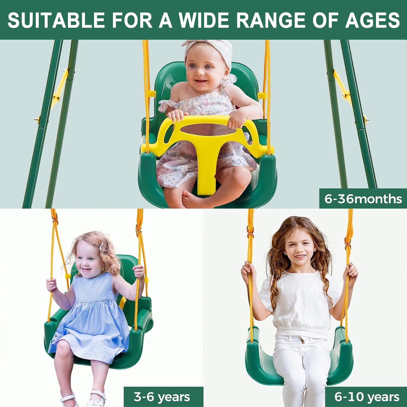 FREEDOM TO SWITCH: The product can be easily switched between toddler swing and baby jumper. It is also equipped with a removable seat and adjustable chain, which allows your child to have a good time at different ages (suitable for children from 6 months to 10 years old) SAFETY CERTIFICATION: This product is certified by the U.S. Consumer Product Safety Commission (CPSC). The stand is made of sturdy steel and scientific triangular design for stability and durability. The swing comes with sturdy ropes and the baby jumper is equipped with high elasticity stainless steel springs and adjustable soft cotton harness to ensure your child’s safety at all times. EASY TO ASSEMBLE: The swing can be assembled in about 20 minutes according to the instructions. When not in use, it can be easily folded and stored against a wall to save space. PERFECT GIFT: It will be the best birthday gift or holiday gift (Children’s Day or Christmas) for your child. Meanwhile, it can grow with your child and accompany them throughout their childhood. AFTER-SALES SERVICE: Providing customers with satisfactory solutions is the aim of our service. If you are not satisfied with your purchase for any reason, please feel free to contact us and we will give you a satisfactory answer within 24 hours.