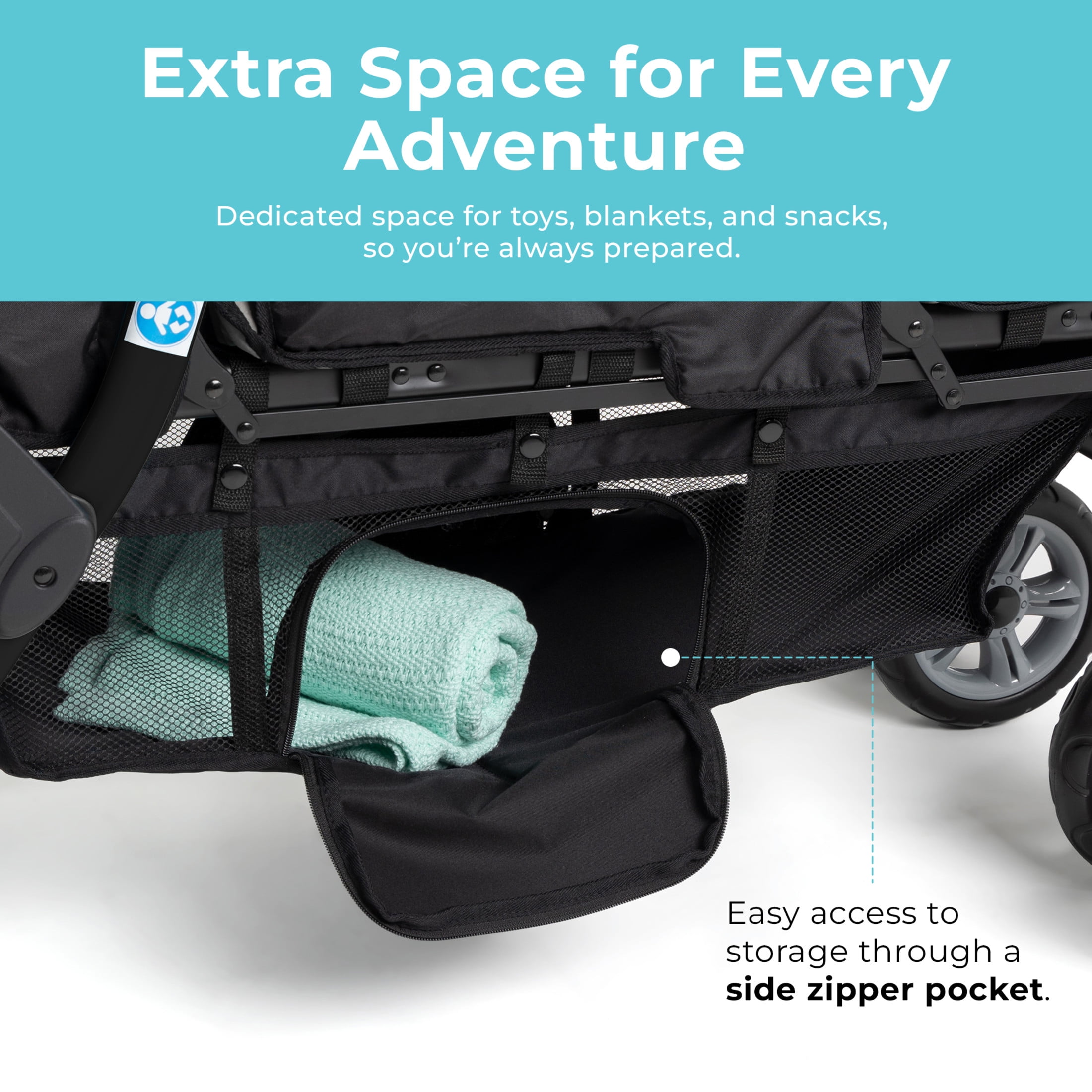 Built for Child Safety – Each seat of the three passenger stroller has a 5-point safety harness restraint system and on the back is a foot operated brake for rear wheels when 3 child stroller needs to stay in place. All terrain stroller features rubberized, never flat, shock-absorbing wheels to ensure a smooth ride and easy maneuverability. Three passenger stroller is tested to meet and exceed current safety standards. Versatile 3 Seat Stroller – Gaggle Compass Trio Strollers feature reclining seats that will accommodate 3 children. Parents and daycare providers have convenient access to the storage pouch near the handle and under the back seat for quick access to daycare essentials for trips. Baby stroller fits major amusement park size standards in USA. Sun Protection – Each row of the tandem stroller has its own UV blocking canopy to protect children while they ride. Canopies fold to collapse when not needed. Easy Loading – Front arm bar conveniently detaches from the multi child stroller to easily load child into front seat. Once seated, it locks in place so children cannot remove it on their own. Folds For Travel – Trio stroller folds for storage or transportation in compact vehicle. Stroller fits through 32″ doorways to take in and out of the classroom. Weight limit: 40 lbs per child; Unfolded dimensions: 58.5″L x 21″W x 41″H; Folded dimensions: 49″L x 21″W x 20″H