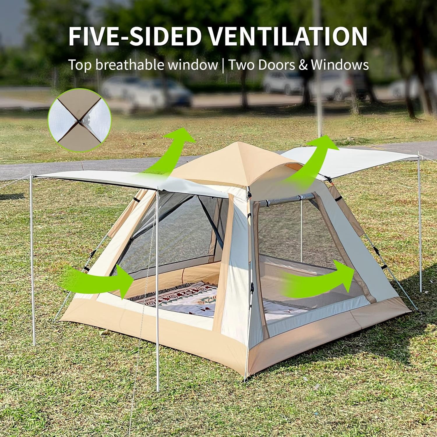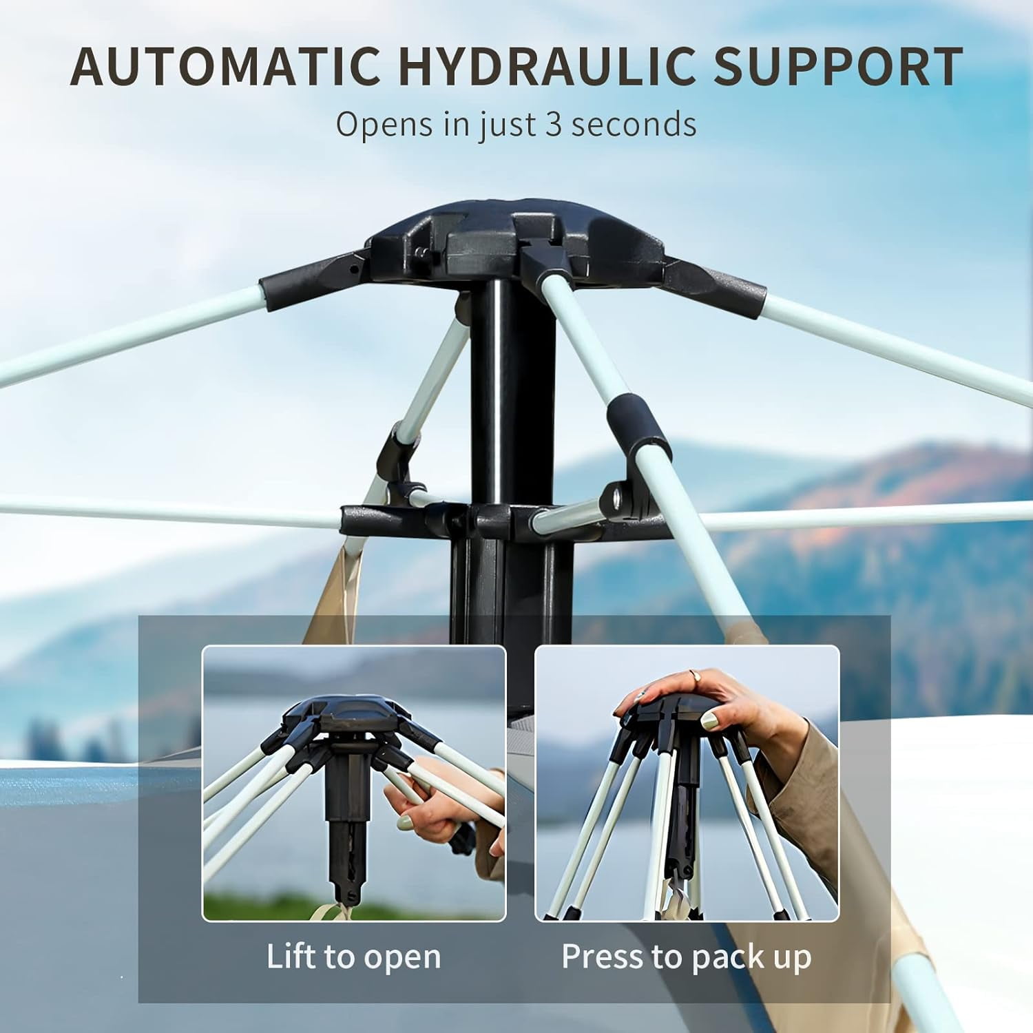 𝑬𝒂𝒔𝒚 𝑺𝒆𝒕𝒖𝒑 𝒊𝒏 𝑺𝒆𝒄𝒐𝒏𝒅𝒔】 With its automatic hydraulic support system, this camping tent opens in just 3 seconds. Simply lift the top of the tent and watch it expand effortlessly. When it’s time to pack up, a gentle press on the top allows for quick and easy folding. 【𝑫𝒖𝒂𝒍 𝑫𝒐𝒐𝒓𝒔 𝒂𝒏𝒅 𝑬𝒏𝒉𝒂𝒏𝒄𝒆𝒅 𝑽𝒆𝒏𝒕𝒊𝒍𝒂𝒕𝒊𝒐𝒏】 Featuring double doors with dual zippers, entering and exiting the instant tent is a breeze. The tent is equipped with five mesh windows, including a top, ensuring optimal air circulation and preventing stuffiness. The built-in mesh screens provide protection against pesky mosquitoes and other insects. 【𝑺𝒑𝒂𝒄𝒊𝒐𝒖𝒔 𝒂𝒏𝒅 𝑽𝒆𝒓𝒔𝒂𝒕𝒊𝒍𝒆】 Measuring 78.7 x 78.7 x 53 inches, the MATEPROX Family Tent offers an extra-large interior space, accommodating 3-4 people. Additionally, the deme tent features a sunshade vestibule, expanding your outdoor living area and providing extra shade for relaxation or storage. 【𝑷𝒓𝒆𝒎𝒊𝒖𝒎 𝑴𝒂𝒕𝒆𝒓𝒊𝒂𝒍𝒔】 Crafted with 210D silver-coated high-density Oxford fabric, the Camping Tent offers professional-grade sun protection. Whether you’re camping, hiking, or engaging in other outdoor activities, this tent is designed to meet your needs. 【𝑺𝒕𝒓𝒐𝒏𝒈 𝒂𝒏𝒅 𝑺𝒕𝒖𝒓𝒅𝒚】 The Windproof Tent frame is constructed with high-strength technology materials, and reinforced composite treatments are applied at the connection points, ensuring excellent flexibility and resistance against strong winds.
