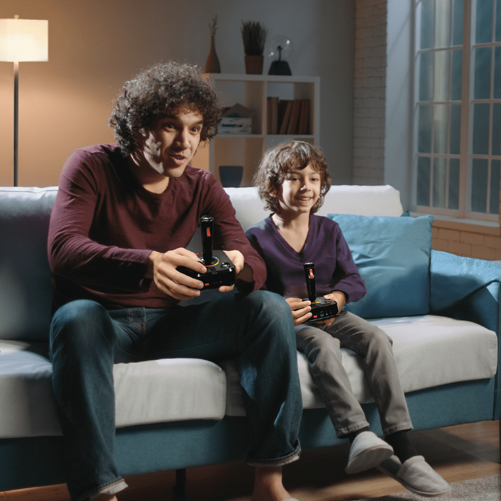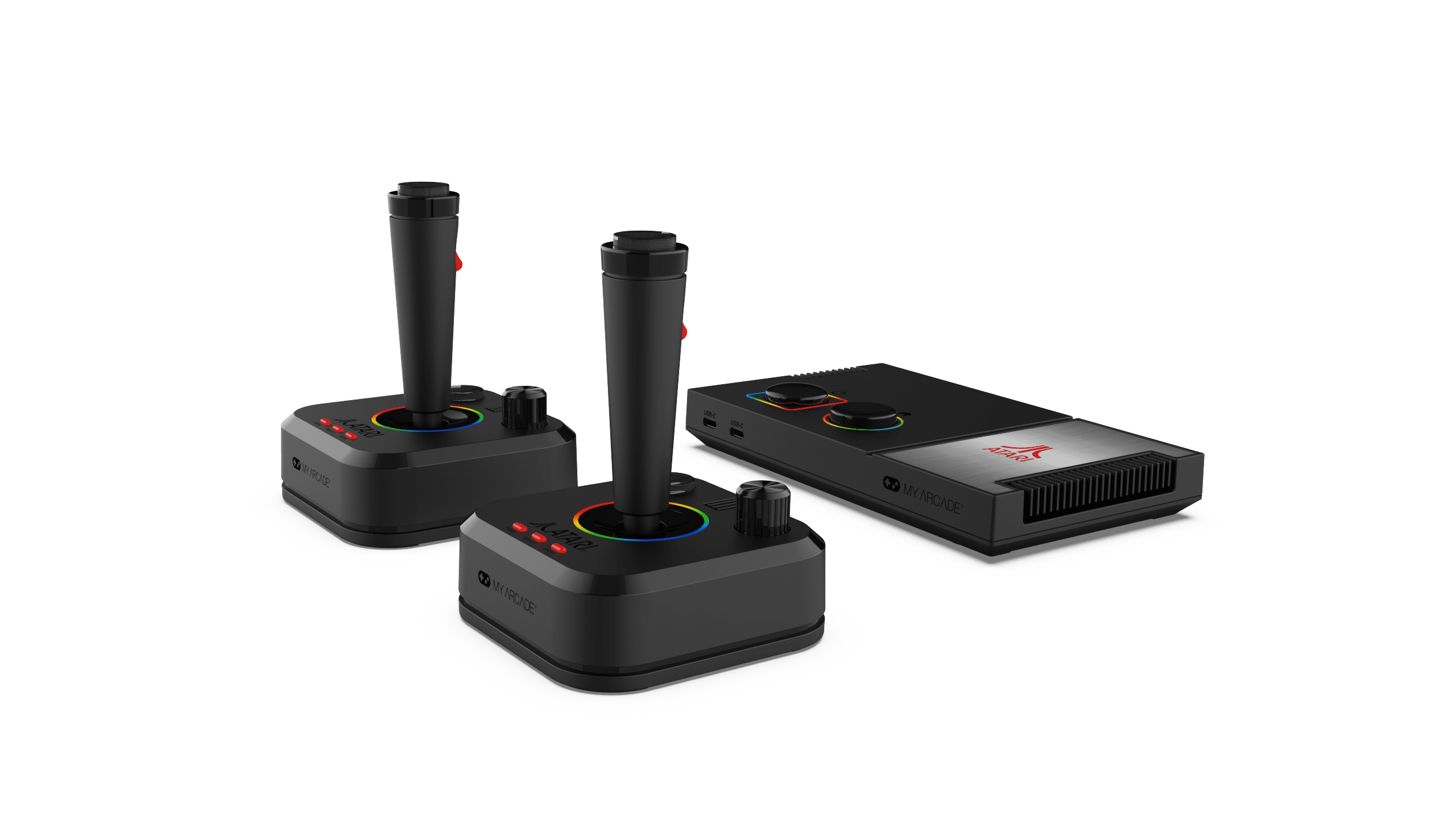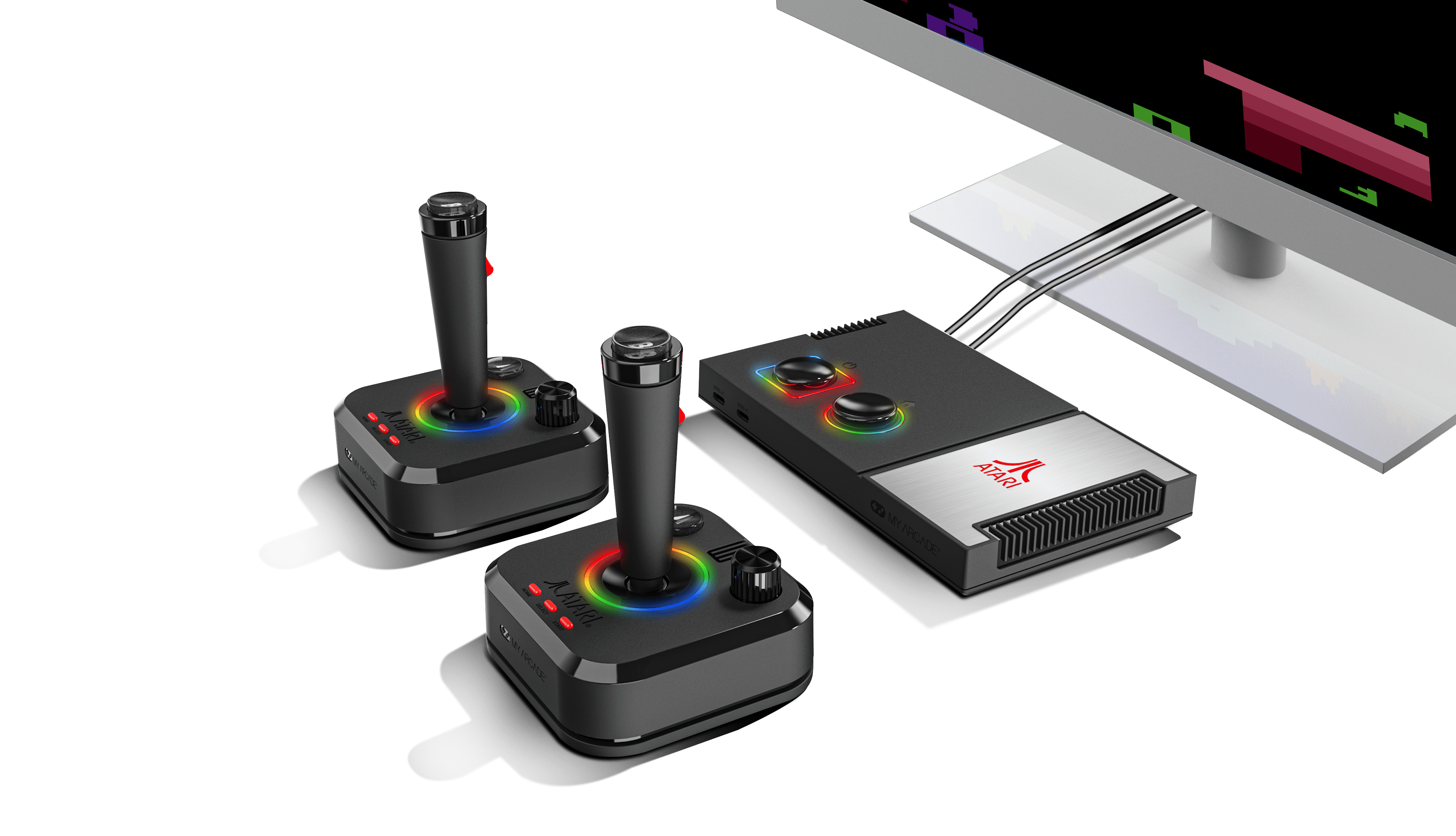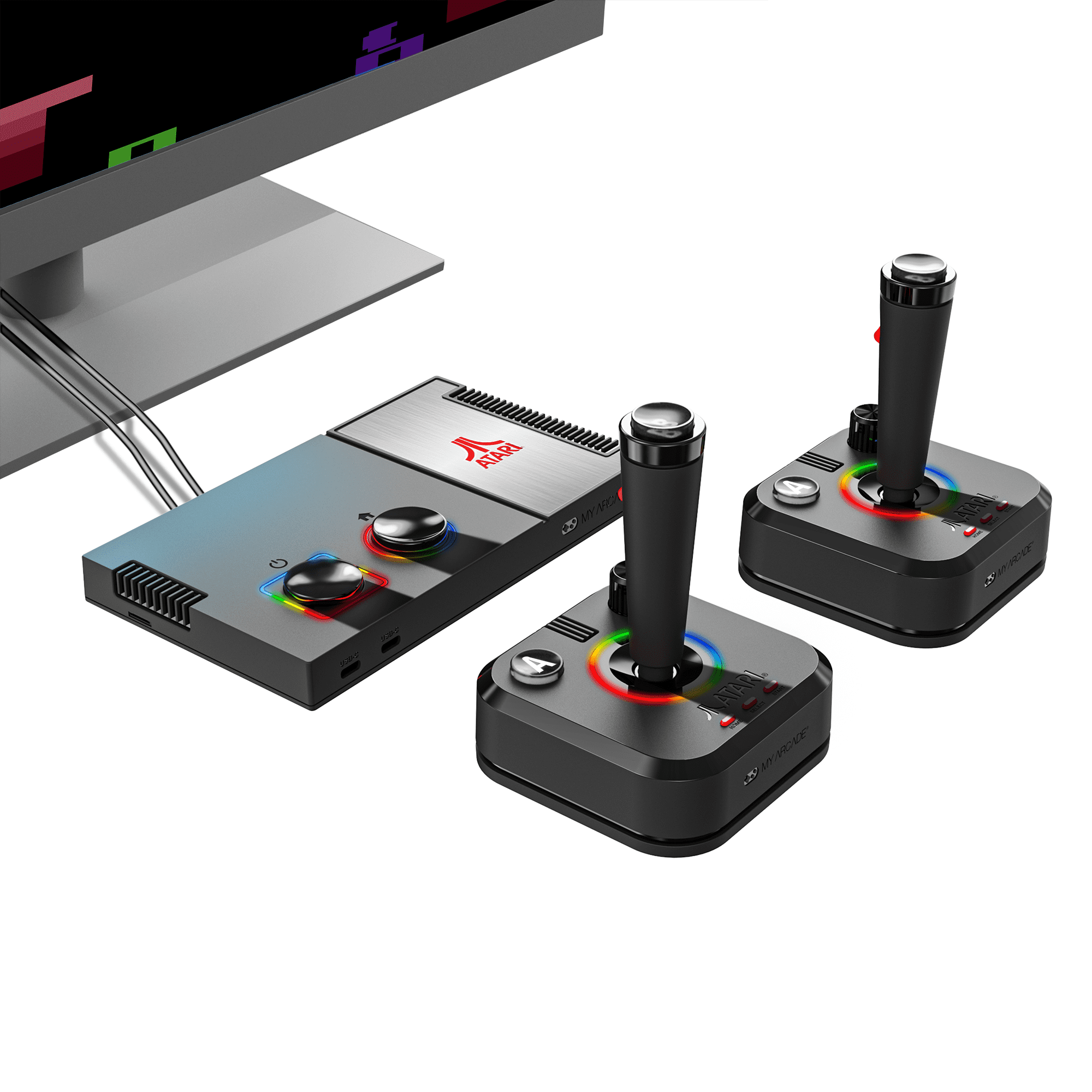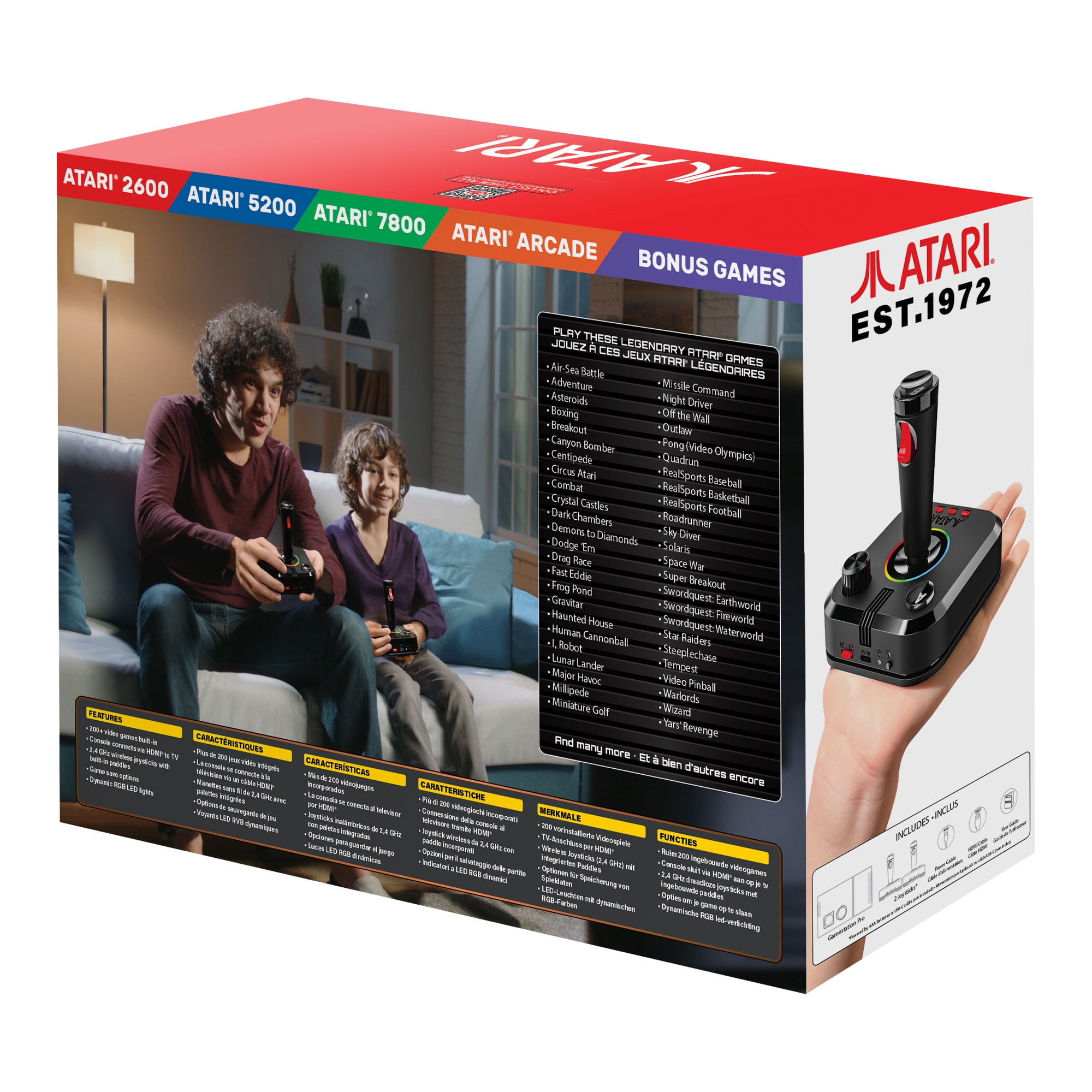 “Officially licensed titles. Packed with over 200 built-in Atari + bonus titles. System connects directly to TV. Two 2.4 GHz wireless joysticks, inspired by the original Atari joysticks, include built-in paddles for games like Super Breakout®, Warlords® and many more. Intuitive user interface. Dynamic RGB LED lights. Game save options. Includes USB power cable and HDMI cable. Joysticks require 4 AA batteries each (not included). Titles include Asteroids®, Centipede®, Millipede®, Breakout®, Missile Command®, Crystal Castles® and many more.”
