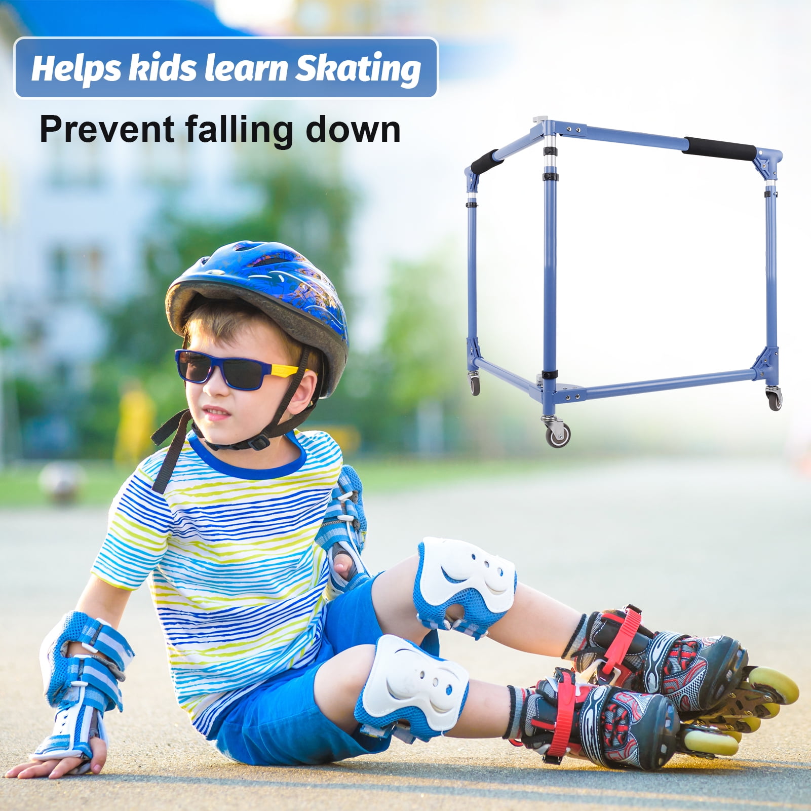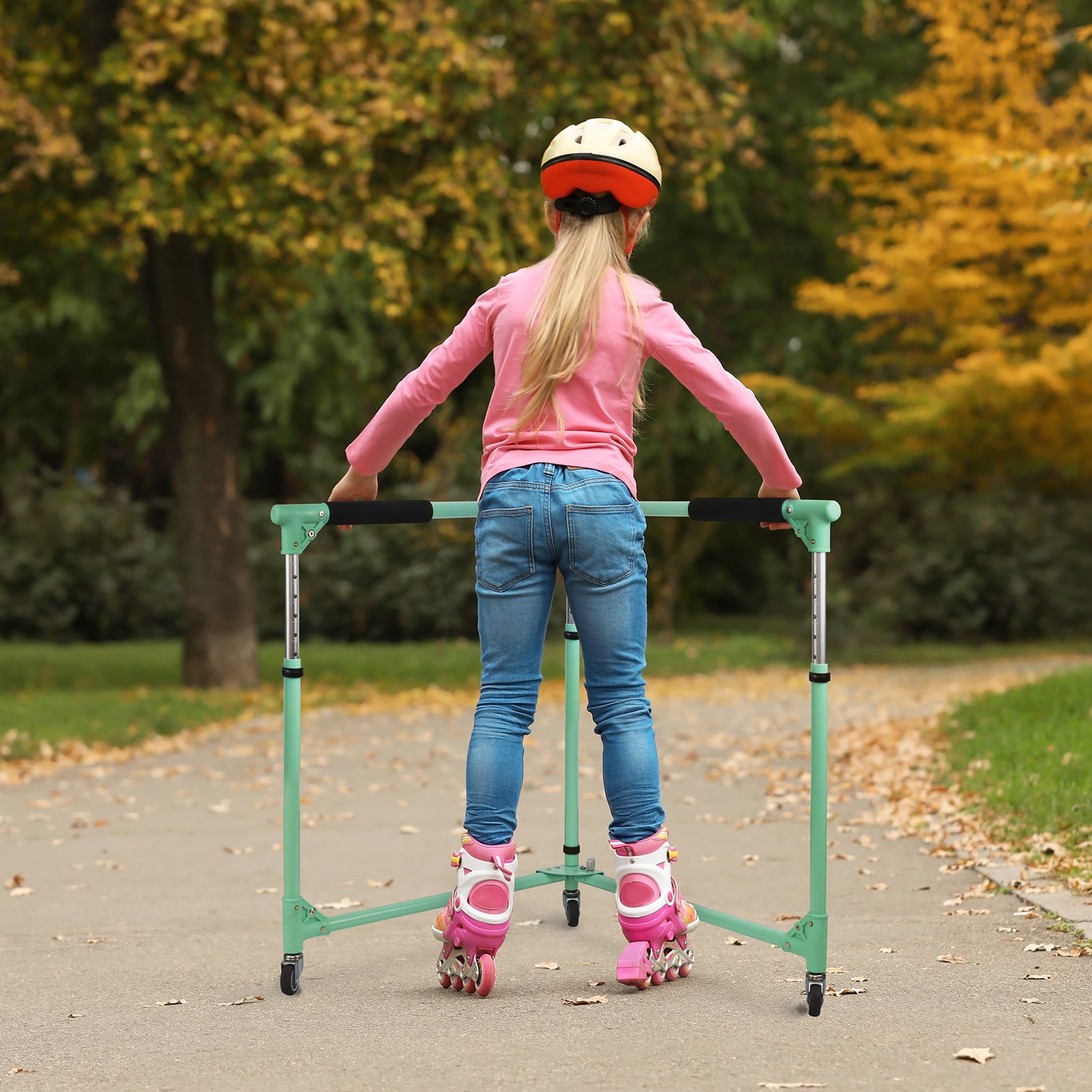 Helps and guides kids learn how to Roller Skate more easily and safely Folding Skater-Aid with all metal construction , suitable for roller skate & inline skate. Very Easy to carry and store Wide Range Adjustable Height 64-94cm/25-37″: 11 levels of height for adjustment Equipped with 3pcs 2-inches mute casters wheels, bring Smoother and Quieter using experience 2022 All New Folding Skater-Aid with elegant appearance, great gift idea for kids, all boys and girls can use