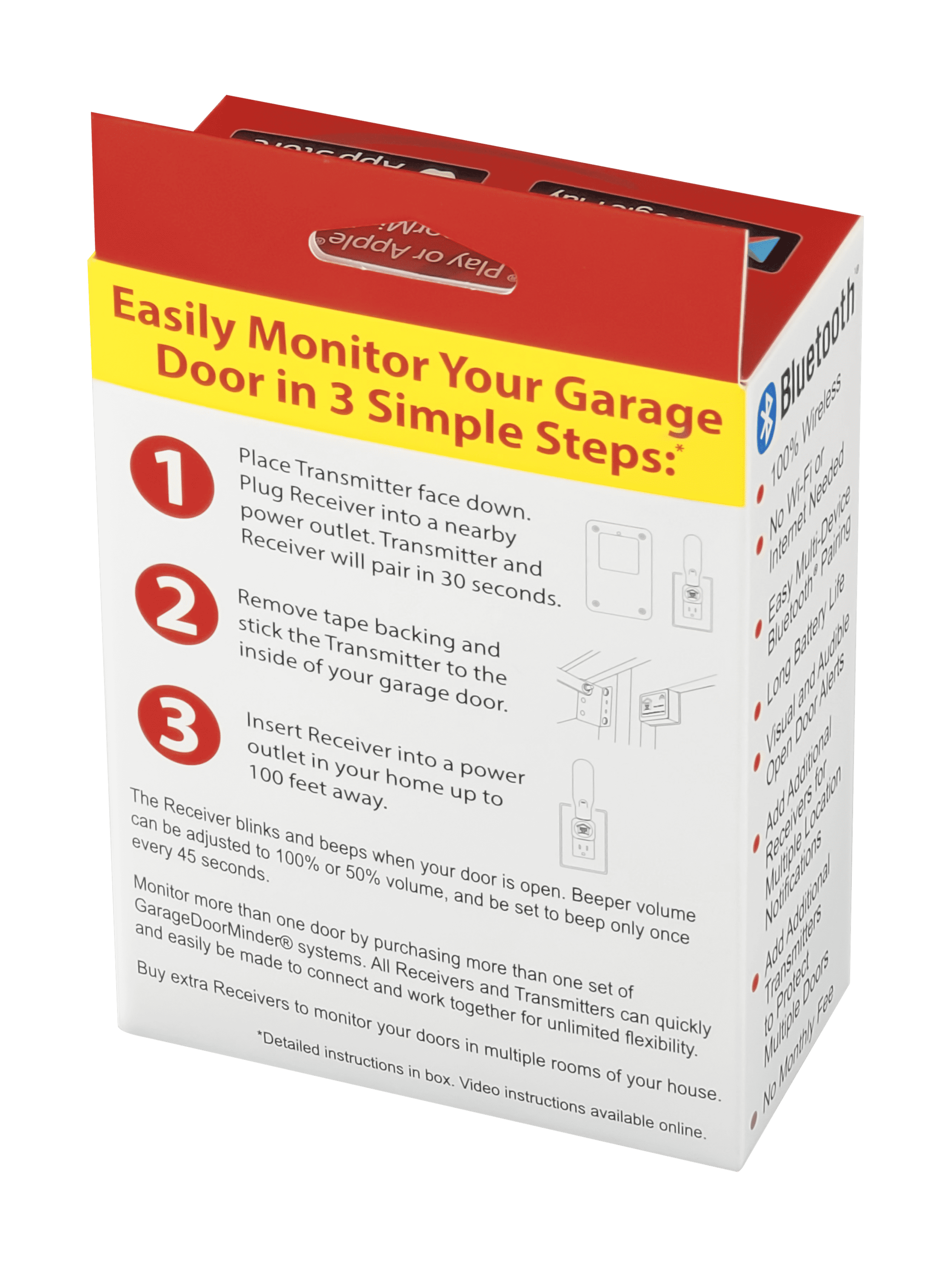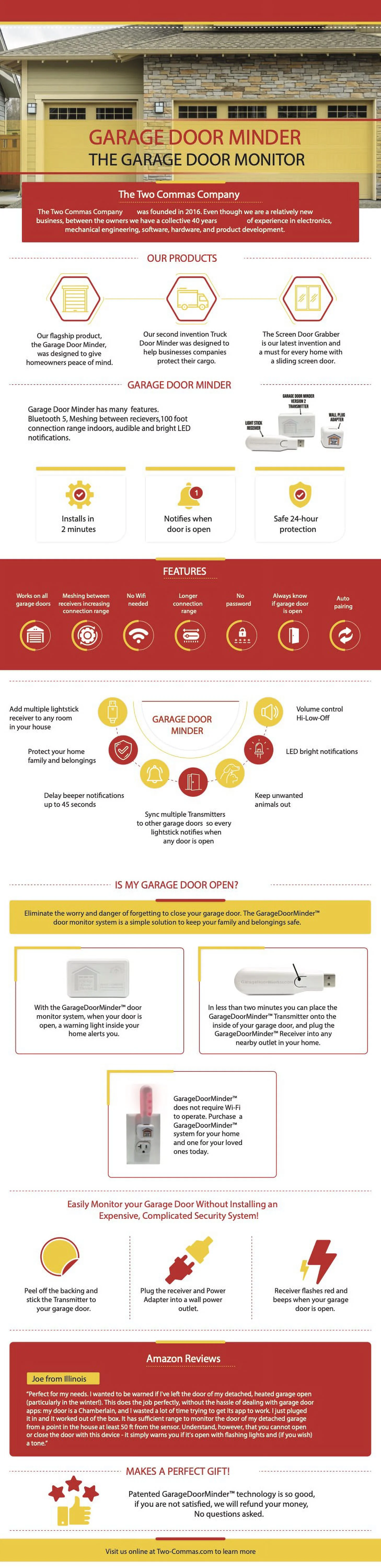 Now even better! The U.S. Patented Garage Door Minder Version II is an update to the World’s First Bluetooth® Garage Door Monitor System™! Is YOUR garage door open? Now you’ll know. No wires to connect, no Internet hookup, and no pesky Wi-Fi passwords or set up to do. Simply peel the backing of the Garage Door Minder Version II Transmitter tape and stick it to the inside of your garage door. Plug one or more Garage Door Minder Version II Lightstick Receivers into outlets in your home and you’ll be continually notified if your garage door is open. Never worry again. Monitor the open or closed status of the largest door to your home… your garage door… protect your valuables with Garage Door Minder Version II. The new Garage Door Minder Version II features UNLIMITED range due to our newly developed Bluetooth® Mesh technology. Each Garage Door Minder Version II Lightstick Receiver “talks” to all others, so you can be notified ANYWHERE in your home or yard if your garage door is open. Be sure to buy an extra Lightstick Receiver. Don’t like beeping? We have you covered! Garage Door Minder Version II features: Beeper OFF, Beeper 50% Volume, and Beeper Delay to make the Lightstick Receiver beep only every 45 seconds. You’ll love the flexibility of having different Lightstick Receivers operate in different beeper modes. Multiple garage doors can be monitored by the Garage Door Minder Version II system. Add up to 8 Transmitters and 8 Lightstick Receivers to your system. All can be synced to operate together or in pairs for each door. The Garage Door Minder Version II is the only garage door monitoring system in the world that gives you this flexibility. Free Garage Door Minder Version II apps are available in the Apple® App Store and Google® Play Store so you can monitor your garage door on your smart device indoors or out, up to 100 feet away from your garage door. Now everyone in the house or in the yard can know if your garage door is open! Garage Door Minder Version II is Certified by the FCC in America, and IC in Canada so you can be sure that your Garage Door Minder Version II is safe and performs just like we advertise. If you have operation questions about your Garage Door Minder Version II contact us! Chances are, you’ll be able to speak directly to the Garage Door Minder Version II inventor! Now THAT’S customer service! Remember, If you’re ever dissatisfied with your Garage Door Minder Version II, Two-Commas LLC offers a 100% Money Back Guarantee. Buy a Garage Door Minder Version II for yourself AND one for a friend or loved one. Garage Door Minder Version II makes a perfect gift any time of the year.