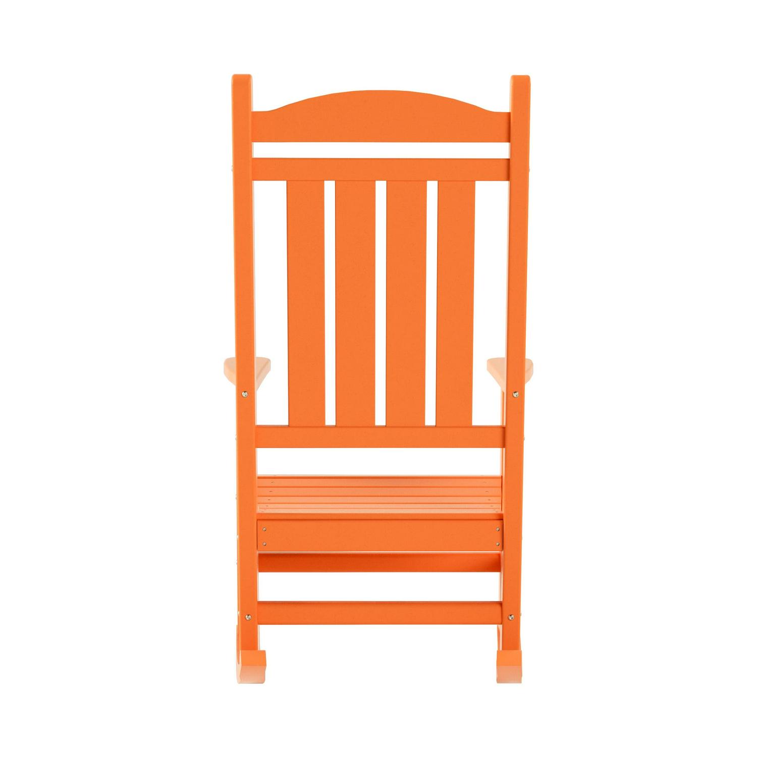 A vibrant and eye-catching classic Adirondack Orange Porch Rocking Chair. Enjoy endless hours outside your porch, balcony, or outdoor living area with this must have plastic outdoor rocking chair. Made with a durable eco friendly HDPE plastic frame and completed with rust resistant hardware. Perfect for any space, this chair works great on the patio, balcony, porch, or in the backyard. This weather resistant rocking chair is easy-to-maintain chair and needs no painting, staining, or waterproofing. A must have patio rocking chair because its sturdy and durable. Available in a variety of fade resistant color options.