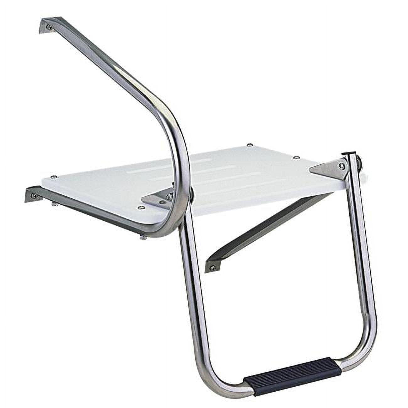 Made of high density white polyethylene and stainless steel. Includes one wrap around rail and one underside support rail. Durable and easy to clean. Rail height above and below platform, 12-1/2″. For use on outboard transoms.