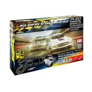 GB Pacific Electric Furious Loop Road Racing Set. 34’9″ of Racing Action. Layout Size 5’9″x4’1″. Approved transformer included. 2 Licensed 1:43 Scale Mercedes Benz SLS AMG GT3 Race Cars with Magnetic Chassis and Working Headlights. Ready, Set, Go, from Start to the finish line this set will provide you with tons of entertainment. Who doesn’t like the loops or racing on the straight track, whatever your preferences are you are sure to be pleased with this set. Every male young and old will enjoy playing with this track. Nice Gift item for any Child Ages 8 years and up