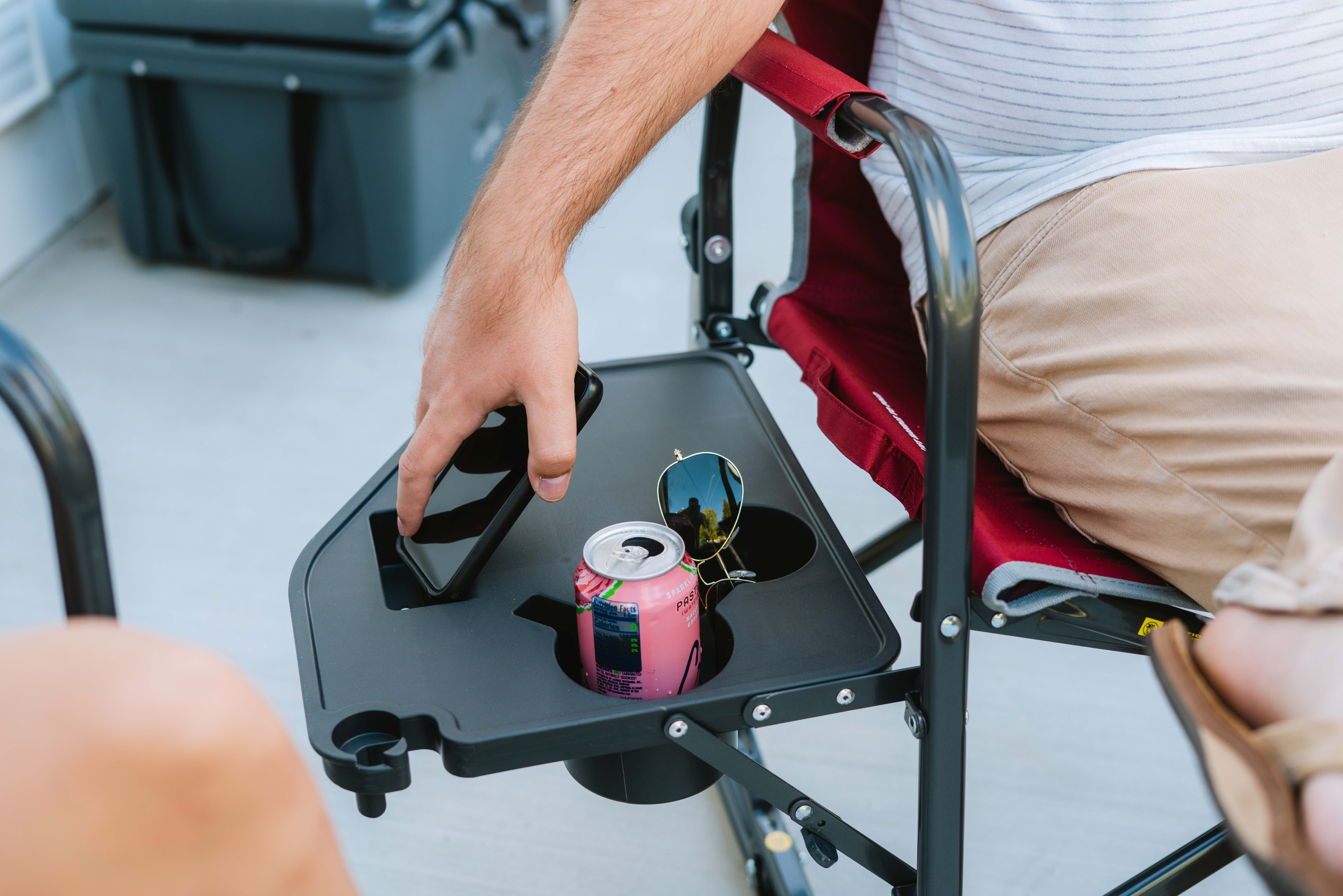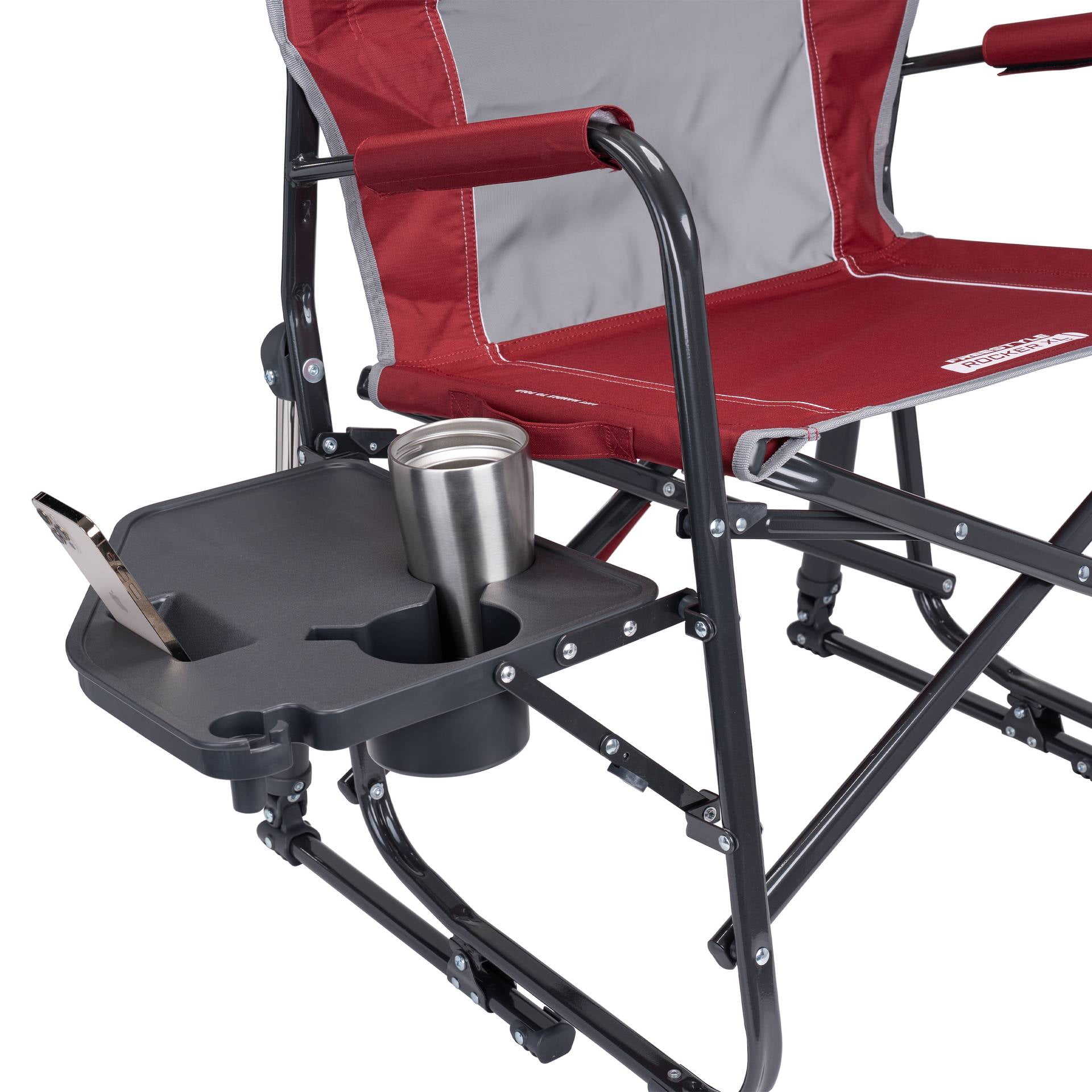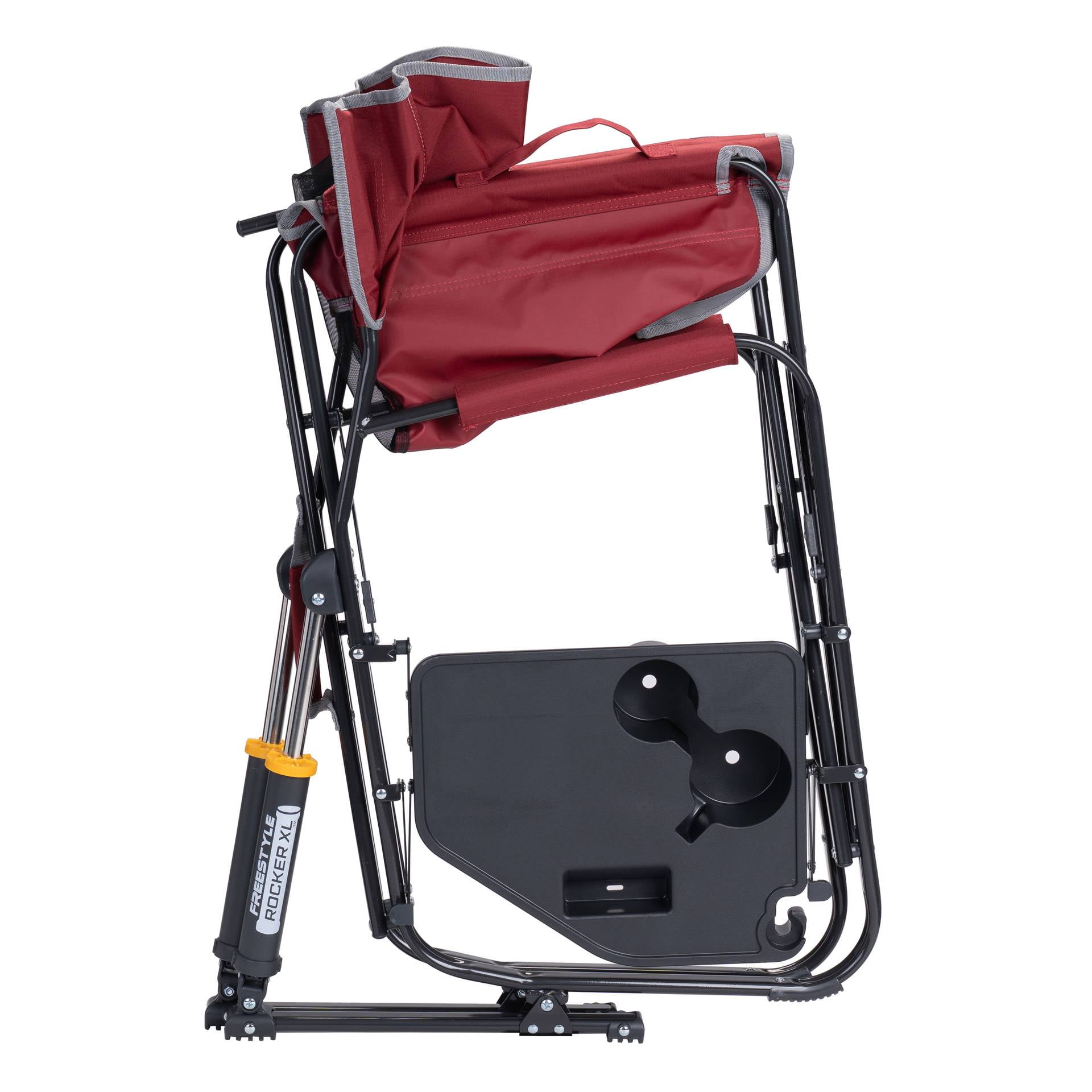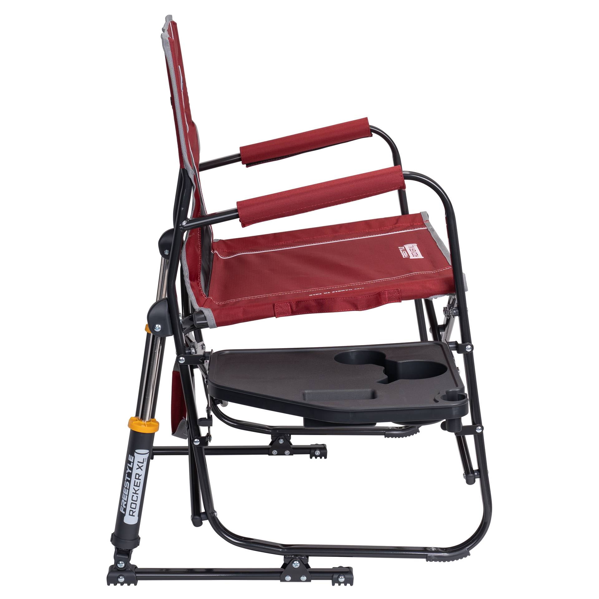 Brand Name: GCI Outdoor Sub Brand: Freestyle Rocker XL Seat Color: Red Style: Freestyle Product Type: Folding Rocker Seat Width: 26.4 in. Seat Depth: 25.6 in. Weight Capacity: 400 lb Height: 34.8 in. Width: 26.4 in. Depth: 25.6 in. Frame Material: Aluminum Frame Color: Black Adjustable: No Cup Holder: Yes Storage Bag Included: No Stackable: No Packaging Type: Carded Folded Size Width: 4.9 in. Folded Size Depth: 25 in. With Side Table: Yes Size: XL Unit Weight: 14.5 lbs Seat Height: 20 in. Folded Size Height: 34.8 in.