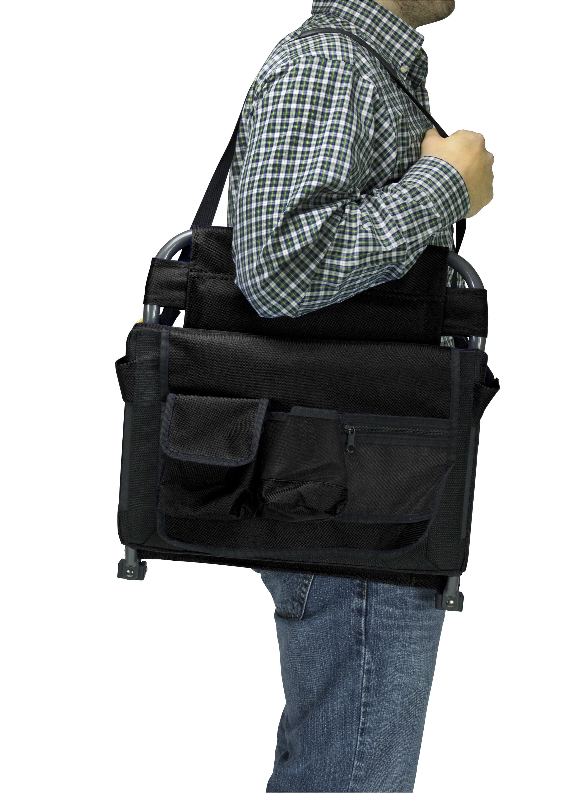 Auto-Fold™ Technology shoulder strap for easy opening, closing and carrying Single buckle bench attachment Additional backrest padding Multi-purpose pouch to hold your beverage, keys, etc. Powder-coated steel Supports 250 lb (113.6 kg) Open size (not including pouch): 12.2 x 16.3 x 17.5 in (31 x 41.5 x 44.5 cm) Folded size: 16.3 x 16.3 x 3.3 in (41.5 x 41.5 x 8.5 cm) Seat width: 16.3 in (41.5 cm) Unit weight: 3 lb (1.4 kg)