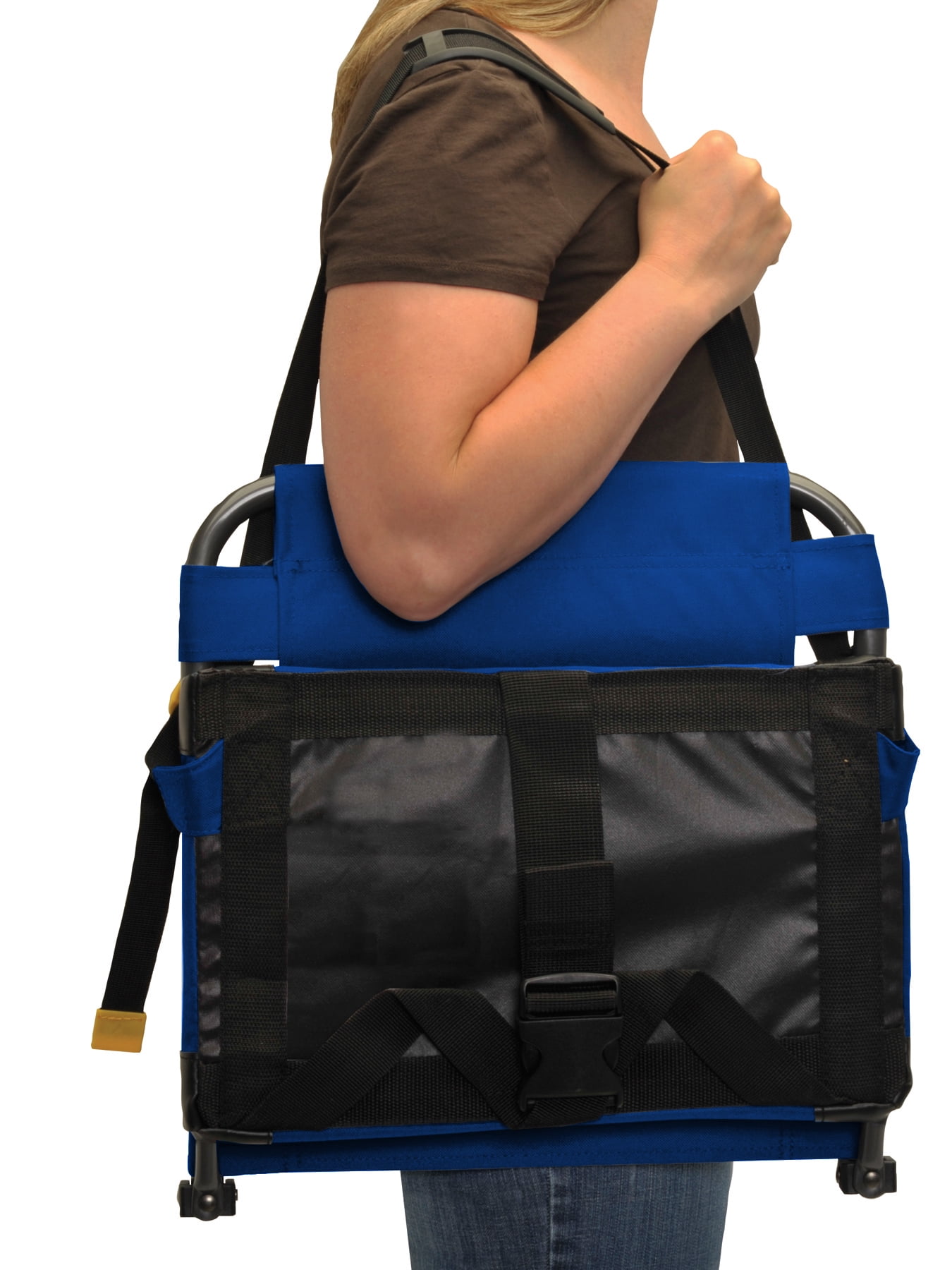 BackComfort? Technology for a multitude of customized backrest comfort zones Auto-Fold? Technology shoulder strap for easy opening, closing and carrying Single buckle bench attachment Powder-coated steel Storage pocket Supports 250 lb (113.6 kg) Open size: 12.6 x 16 x 16.7 in. Folded size: 16.7 x 16 x 3.5 in. Seat width: 16 in. Unit weight: 2.9 lb.