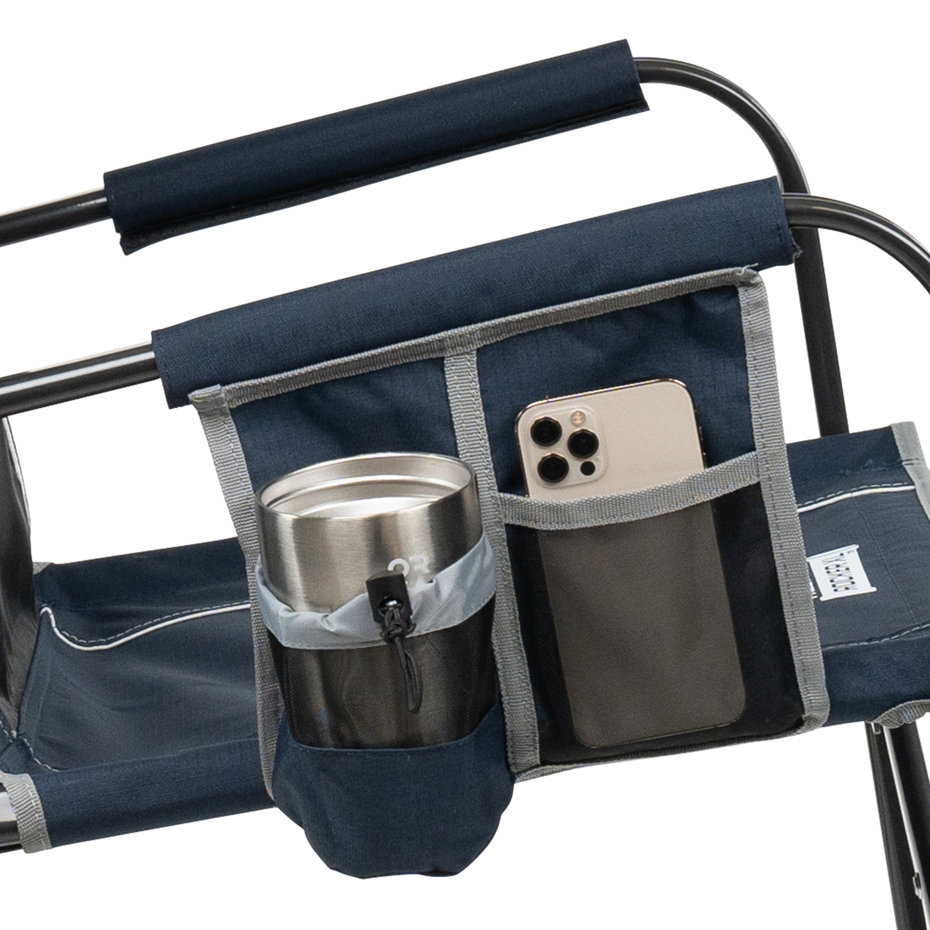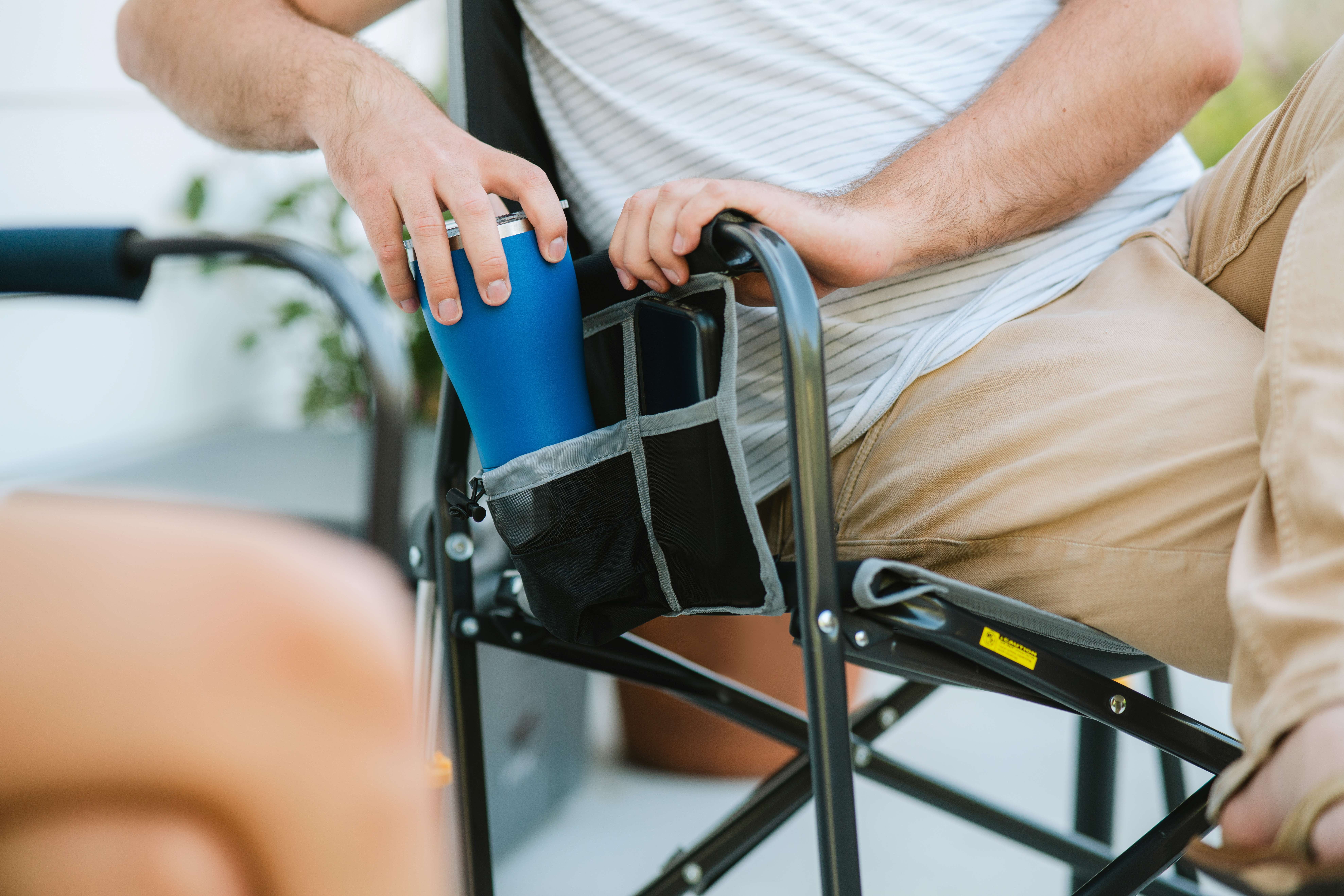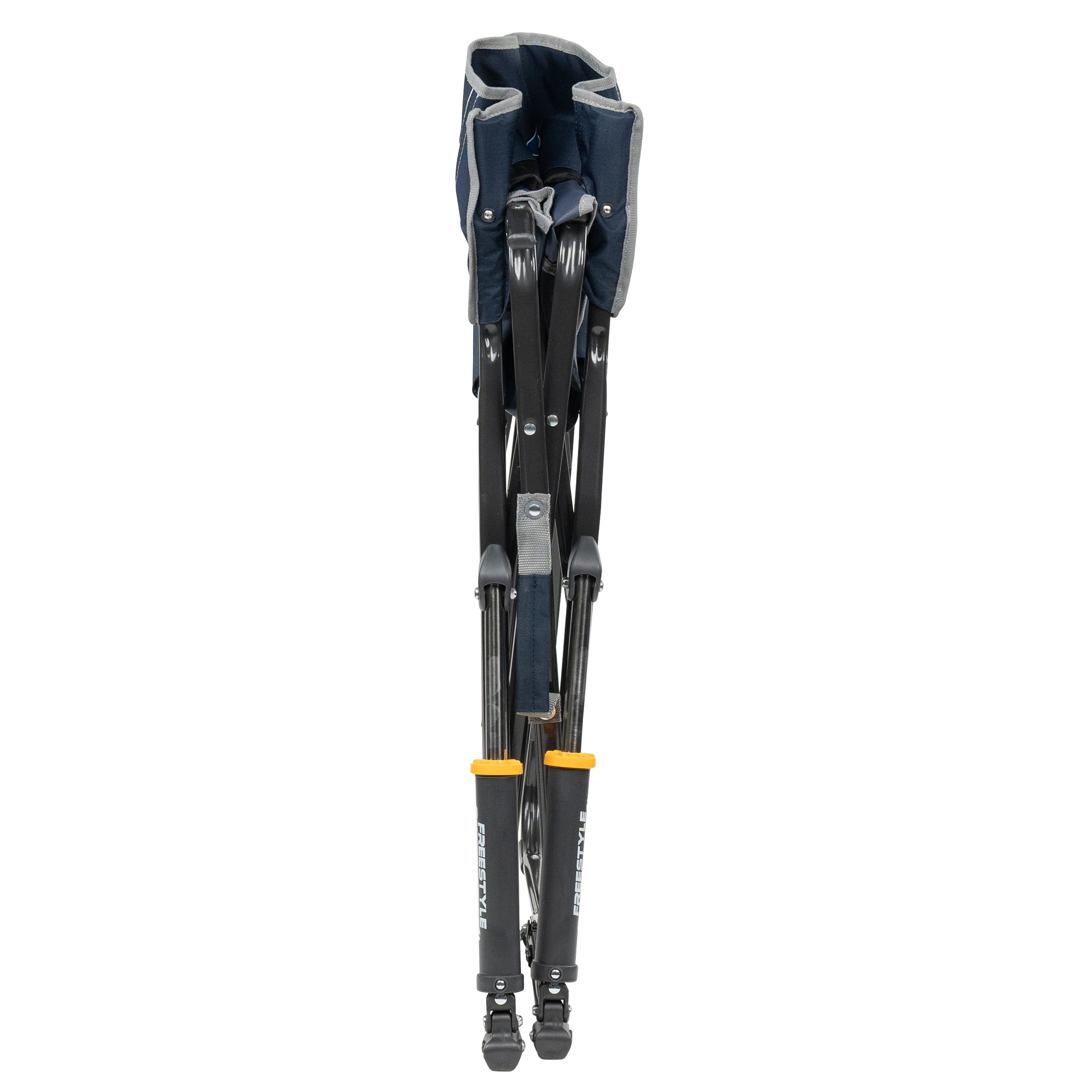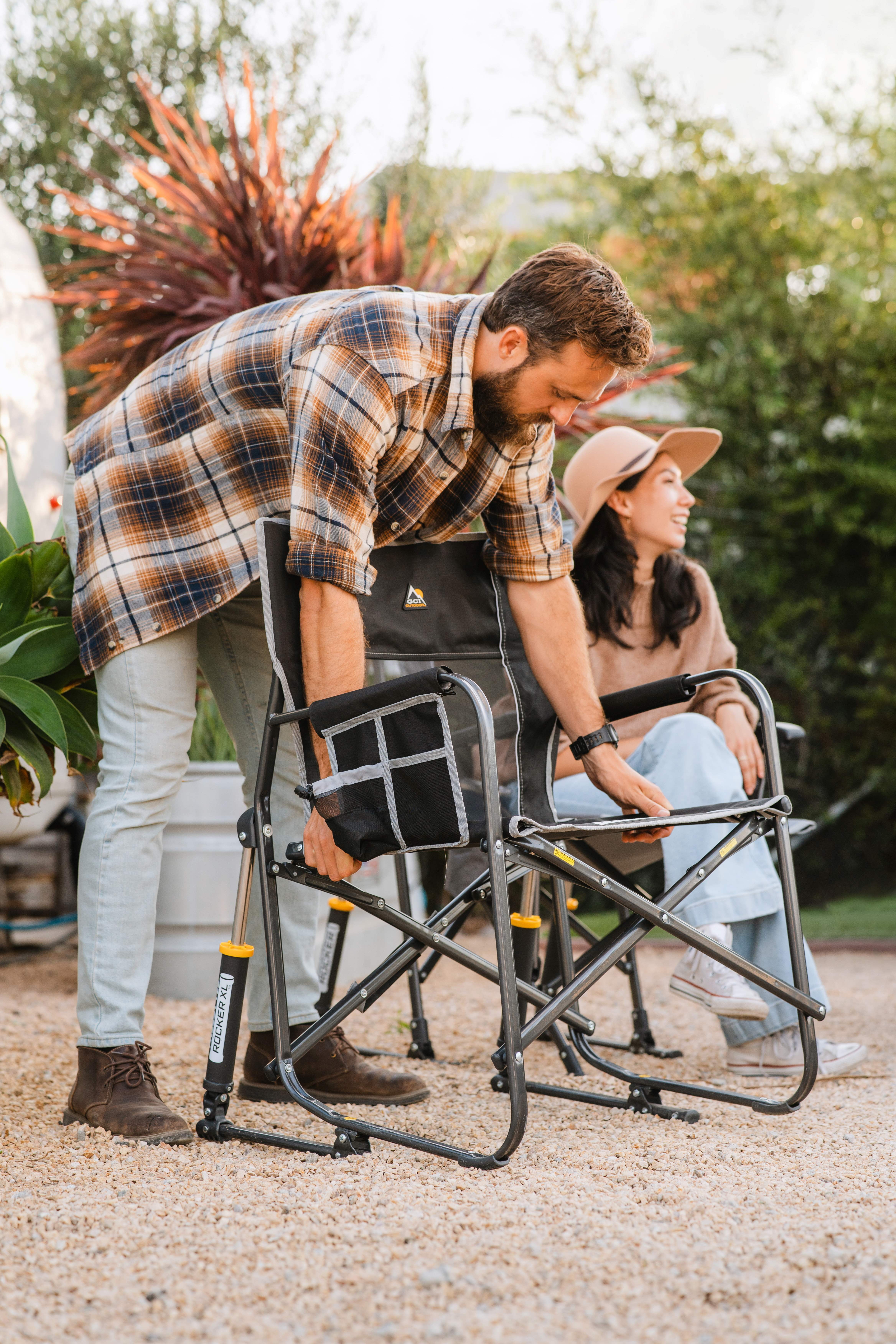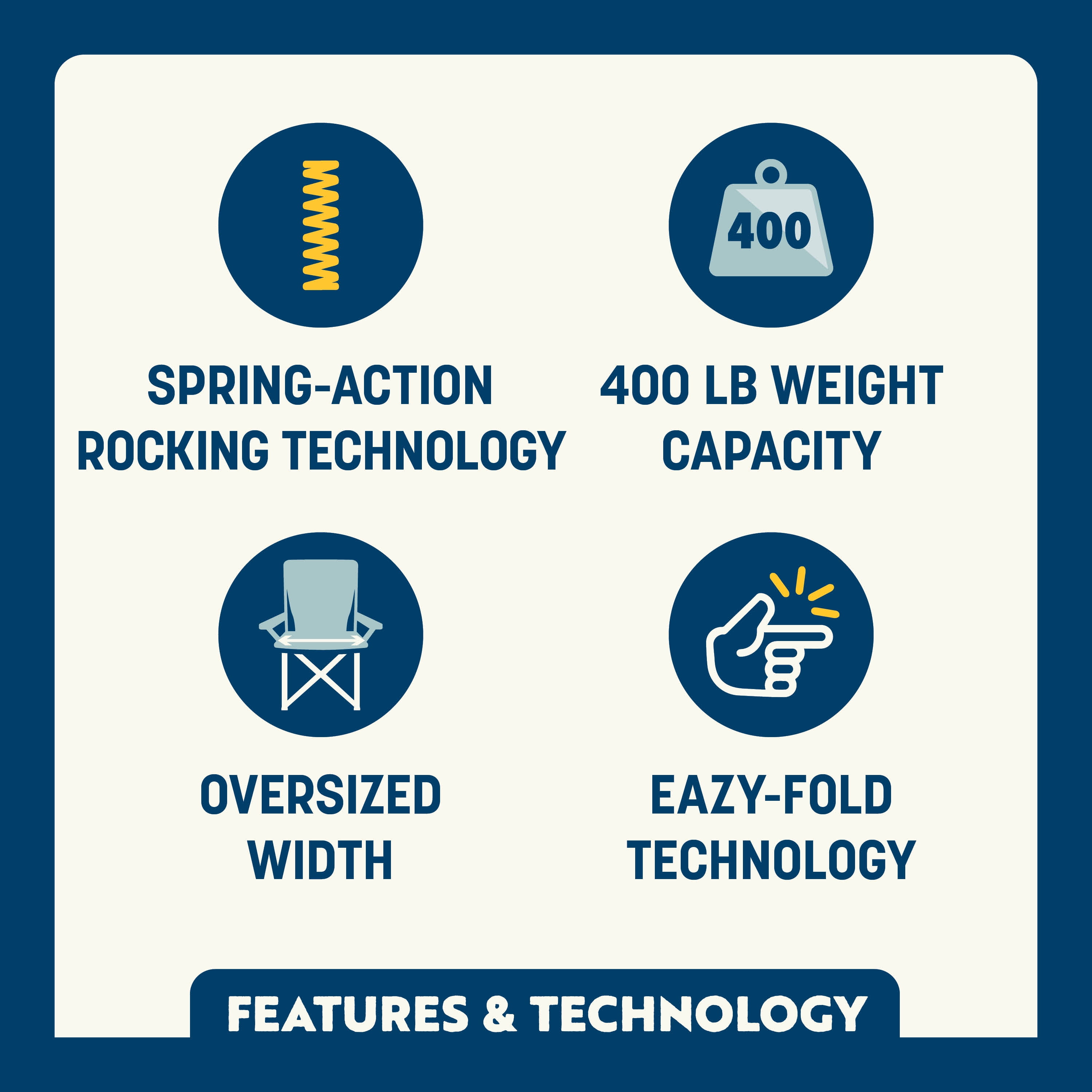 GCI Outdoor Freestyle Rocker XL Heavy Duty Portable Folding Camping Chair, Indigo Over-sized height and width outdoor rocking chair Patented spring-loaded shocks for a smooth rocking motion Eazy-Fold Technology for safe and simple opening and closing Solid armrests for extra support when sitting down or standing up Durable, nylon mesh backrest for continual airflow to keep you cool in warmer weather Heavy-duty, powder-coated steel frame provides comfort and durability Fold-flat design for storage and transporting Convenient carry handle offers easy portability Convenient beverage holder and phone pocket Limited lifetime warranty for worry-free outdoor adventures Supports 400 lb Seat Height: 20 in Item Weight: 13.4 lb Adult chair