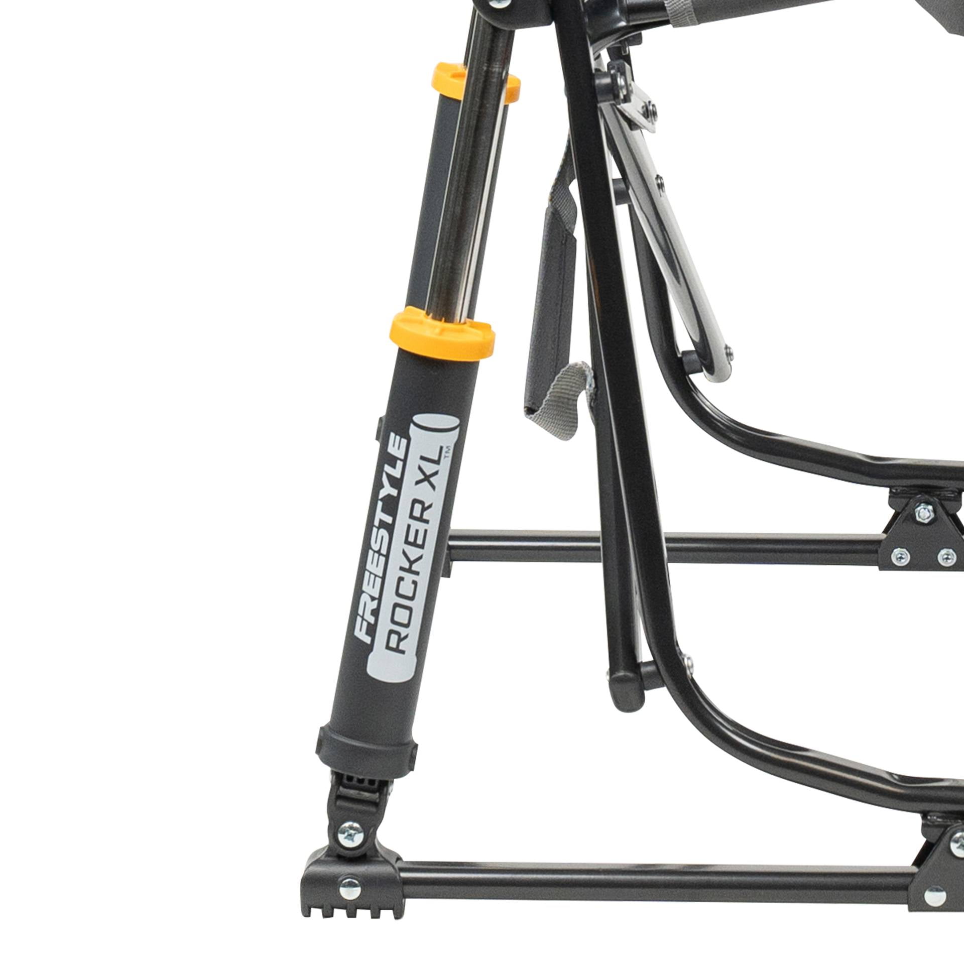 GCI Outdoor Freestyle Rocker XL Heavy Duty Portable Folding Camping Chair, Black Over-sized height and width outdoor rocking chair Patented spring-loaded shocks for a smooth rocking motion Eazy-Fold Technology for safe and simple opening and closing Solid armrests for extra support when sitting down or standing up Durable, nylon mesh backrest for continual airflow to keep you cool in warmer weather Heavy-duty, powder-coated steel frame provides comfort and durability Fold-flat design for storage and transporting Convenient carry handle offers easy portability Convenient beverage holder and phone pocket Weight capacity: 400 lb Seat Height: 20 in Item Weight: 13.4 lb Adult chair