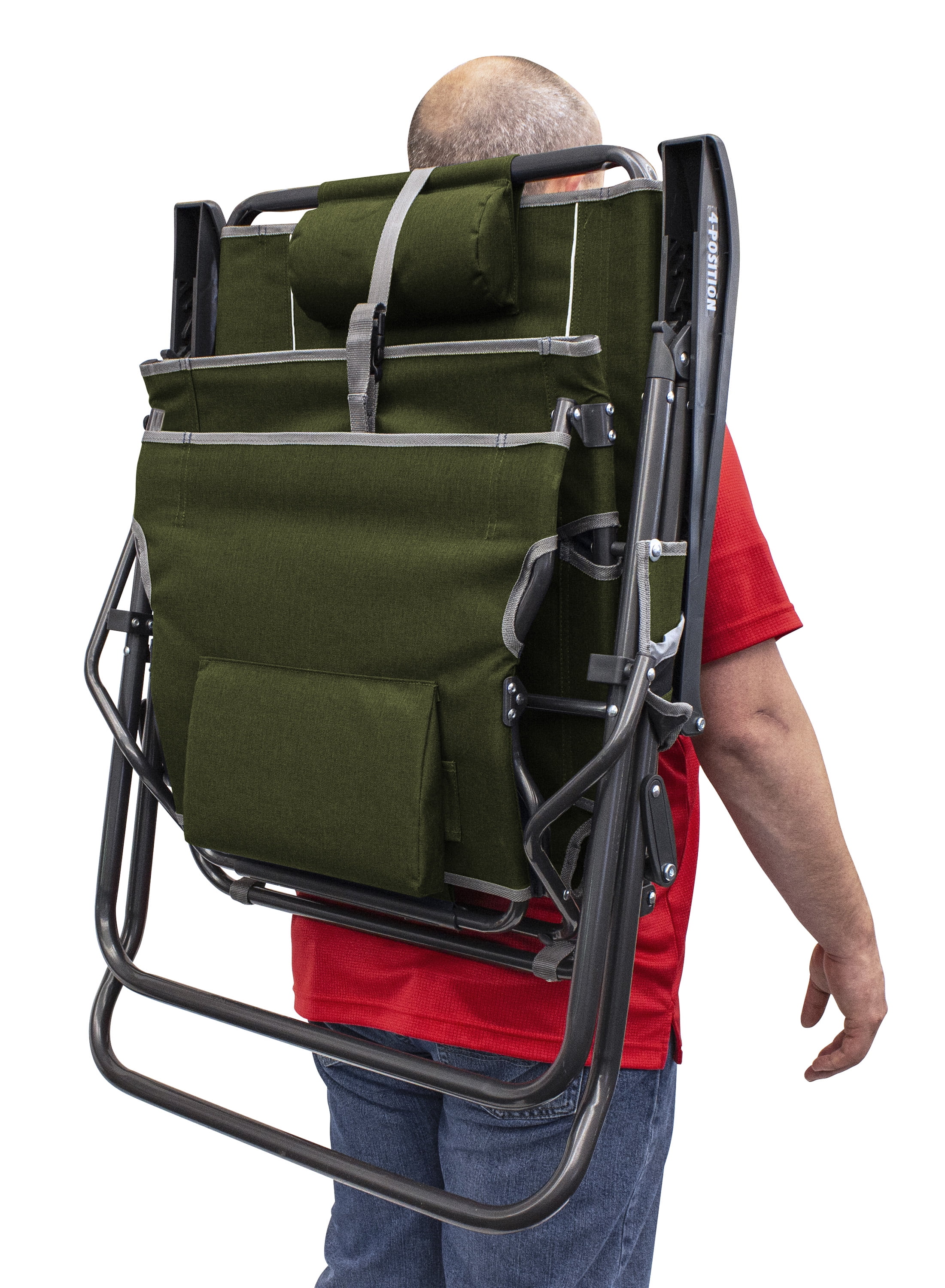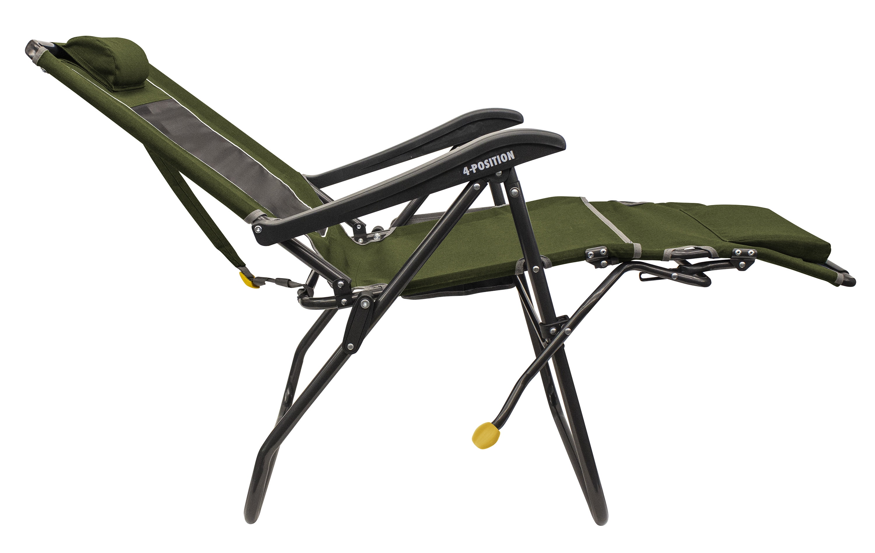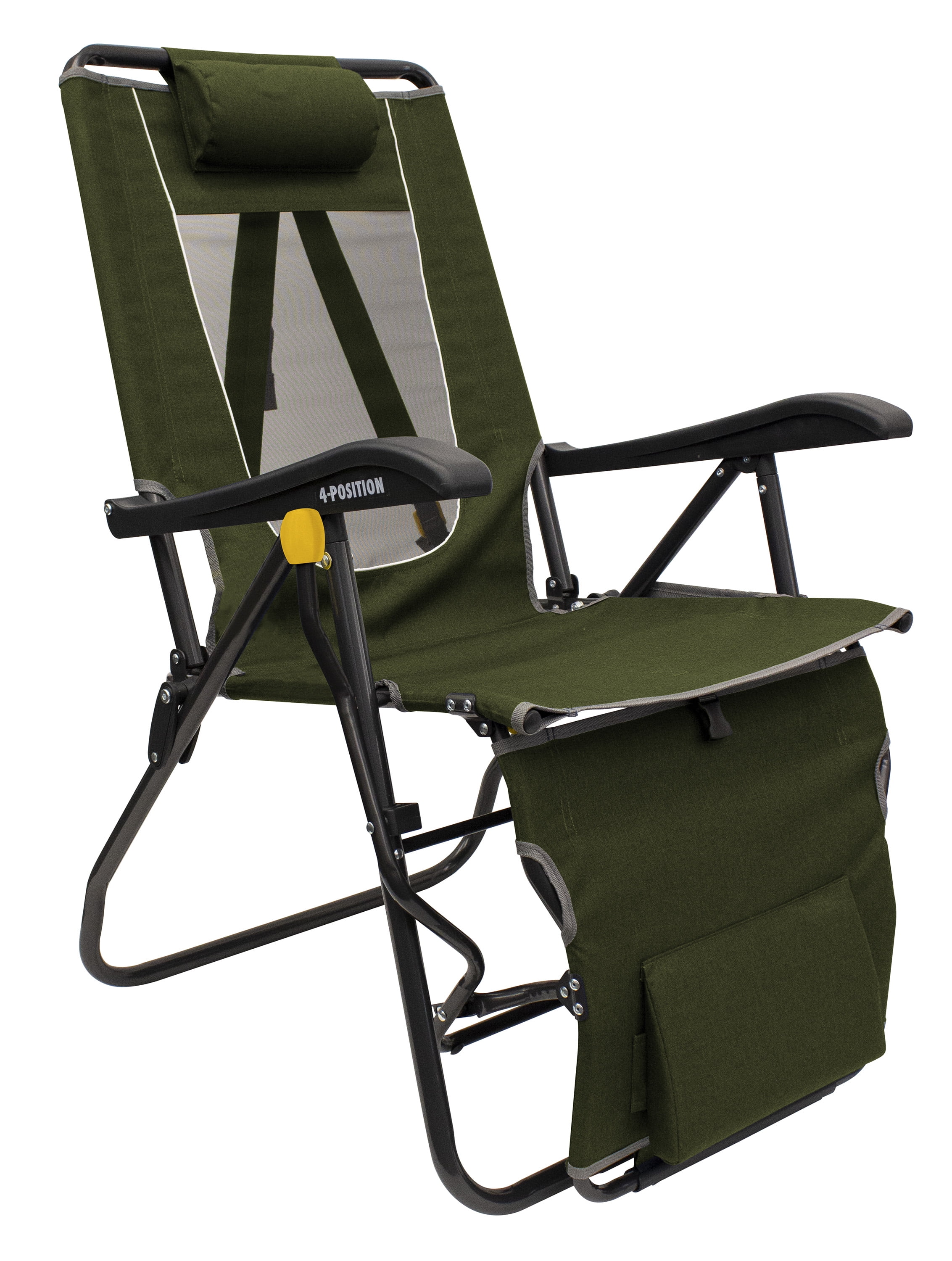 GCI Outdoor Legz Up Lounger Adjustable Folding Recliner Camping Chair, Heathered Loden Innovative, lounge chair perfect for camping, tailgating and backyard BBQs Legz Up Technology for seamlessly raising the leg rest up or down Adjustable, reclining backrest and head pillow for all day comfort Durable steel frame to last for years Solid armrests for extra support when sitting down or standing up Mesh backrest for continual airflow to keep you cool in warmer weather Backpack straps for hands-free carrying Convenient beverage holder and phone pocket Limited lifetime warranty Supports: 250 lb Seat Height: 13.8 in Adult chair