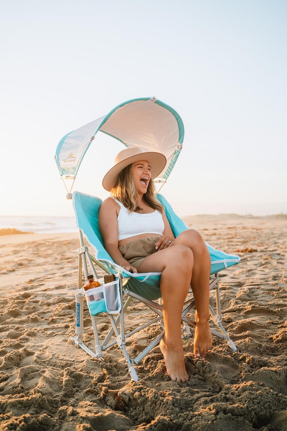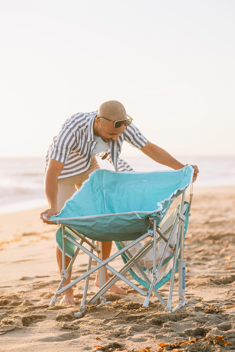 GCI Outdoor Pod Rocker SunShade Portable Folding Canopy Camp Chair, Seafoam Green Patented spring-loaded shocks for a smooth rocking motion Structured sling-style seat with breathable mesh panels to keep cool Adjustable SPF SunShade with UPF 50 fabric Convenient beverage holder and phone pocket Heavy-duty, powder-coated steel frame provides comfort and durability Carry bag with shoulder strap offers easy portability and storage Supports 250 lb Seat Height: 20.1 in Item Weight: 11.7 lb Adult chair