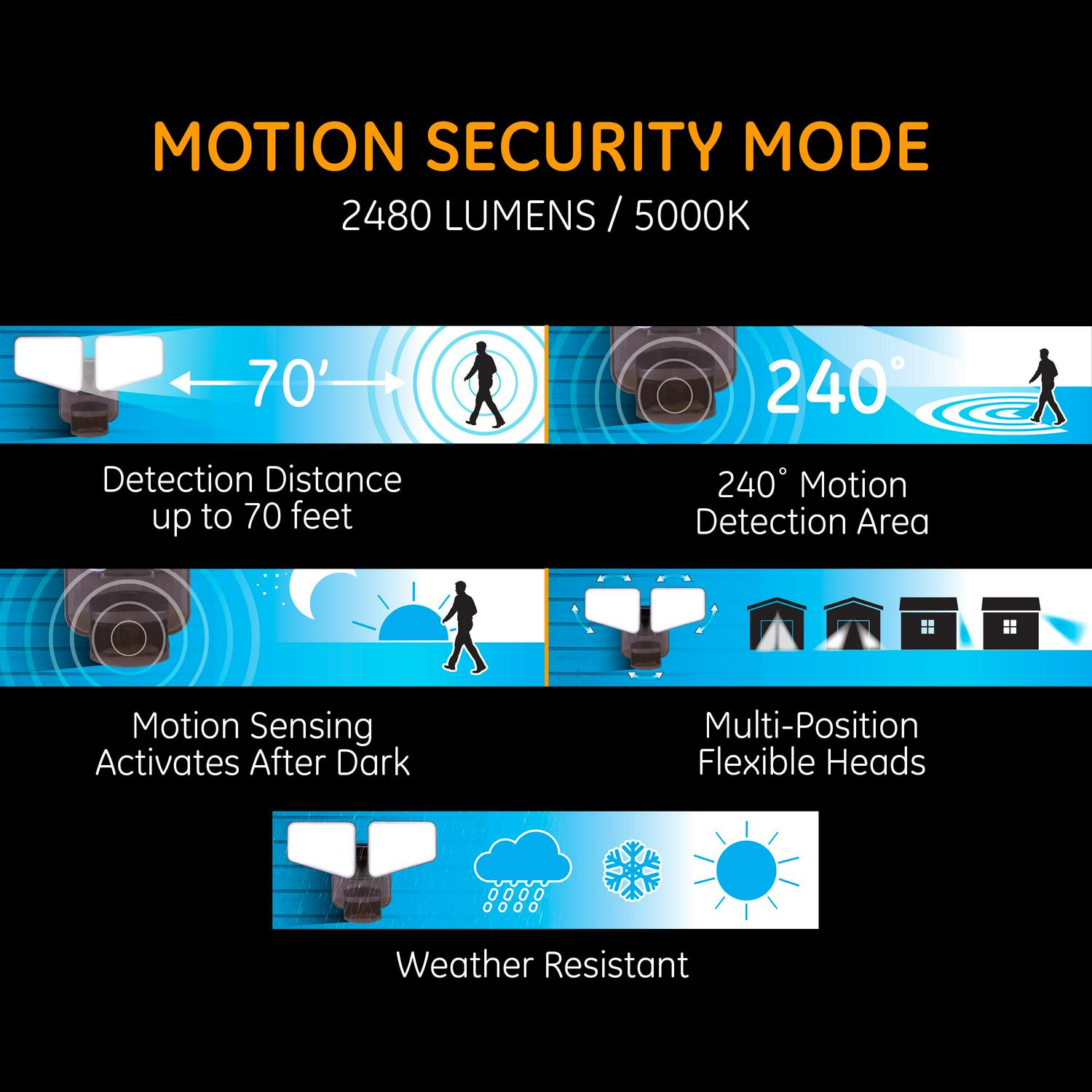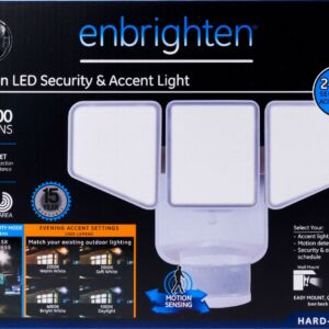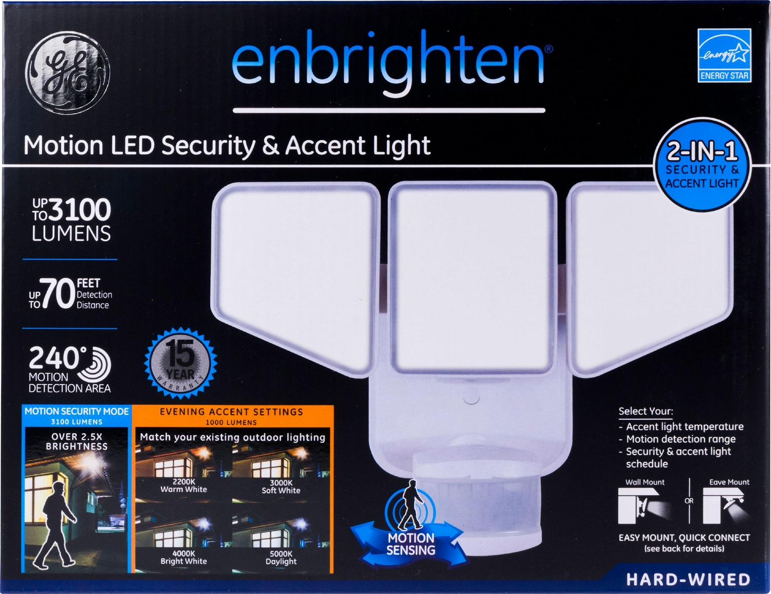 Keep your home shining bright with the GE Enbrighten Motion LED Security & Accent Light. Use the motion-sensing light to detect activity outside your home at night by illuminating your driveway, garage, backyard and more. With a motion-detection area of 240° at a distance of up to 70 feet, the light turns on as soon as it senses motion when in security mode. Once motion is no longer detected, the light will automatically turn off after the preset amount of time you select. While in accent mode your outdoor space will stay safely lit during your evening routines. And when in security mode it will alert you if anyone is near your home after dark. The motion-sensing LED light is weather resistant and can be used as both an accent light and security light, with customizable settings to best suit your needs. You can select a lighting schedule for both accent and security modes. When in accent mode you select a temperature to match your existing outdoor lights. Choose from: warm white, soft white, bright white and daylight. Additionally, the light includes a dusk-to-dawn feature that helps keep energy costs down by turning the accent light on at dusk and off at dawn. Installation is simple the motion sensing LED light can be easily wired to any non-dimmable wall switch with its easy mount, quick connect system. The multi-position, flexible heads can be maneuvered to aim the light directly at the desired outdoor area. Take your outdoor lighting to the next level with the GE Enbrighten Motion LED Security & Accent Light.