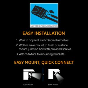 – Easy installation and easy to mount: wire to any non-dimmable wall switch. Can be wall or eave mounted to a flush or surface mounted junction box (mounting hardware included). Comes with quick connect, easy wiring push-in connectors, and a 15-year warranty.