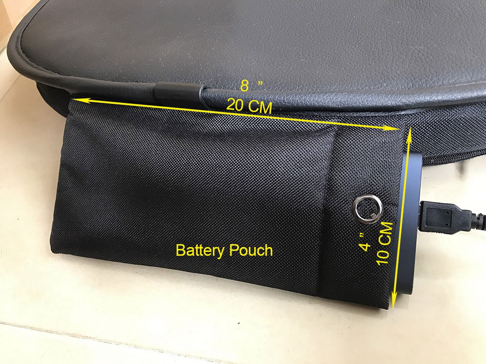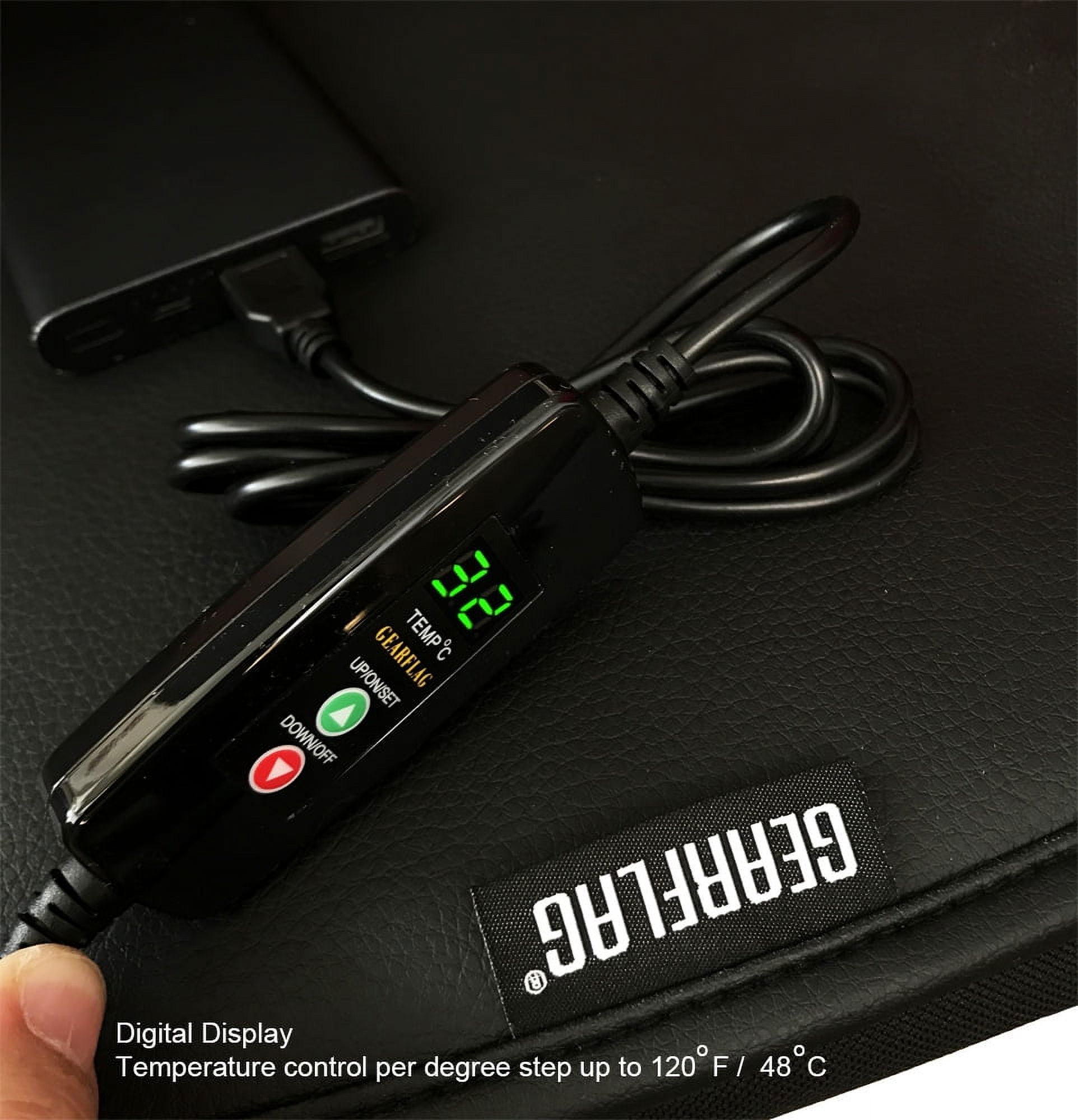 [ USB Power HEATING ] Heated seat powered by external USB battery pack, power bank or any USB 5V power source, comes with front pouch for placing battery pack. Worrying about battery compatibility? Just plug in any power bank which normally charging your phone will power this seat up. BATTERY or POWER BANK IS NOT INCLUDED. [ ADJUSTABLE TEMPERATURE ] Digital temperature display, adjustable up to 48 degree C. You pick the right temperature heating for your comfortable level. Built-in USB cable to connect to 5V power. [ COMPACT CARRYING CASE ] PORTABLE, Easy to roll up after exhaling air, comes with compact size carrying case. Easy to be kept in any compartment for emergency purpose or just carrying it around in your backpack. Excellent for winter game season, hockey game, football game, hunting season, winter/spring/autumn outdoor fun. [ AUTO FILLED AIR INTAKE CUSHION ] Air filled with high quality foam. Can release air and roll into compact size. Carrying case is included [BATTERY IS NOT INCLUDED ] Please note that this cushion powered by external power bank with USB outlet. Battery or Power bank is not included. This seat cushion is a must have for cold winter. Emergency winter stop. Outdoor hunting or camping. High quality “skin feel” like leather. Soft, durable, water resistance. Easy to clean. Comfortable sitting on hard floor, rocky place, concrete surface, snow covered surface, wet surface, boat, wood, hiking, camping and more…