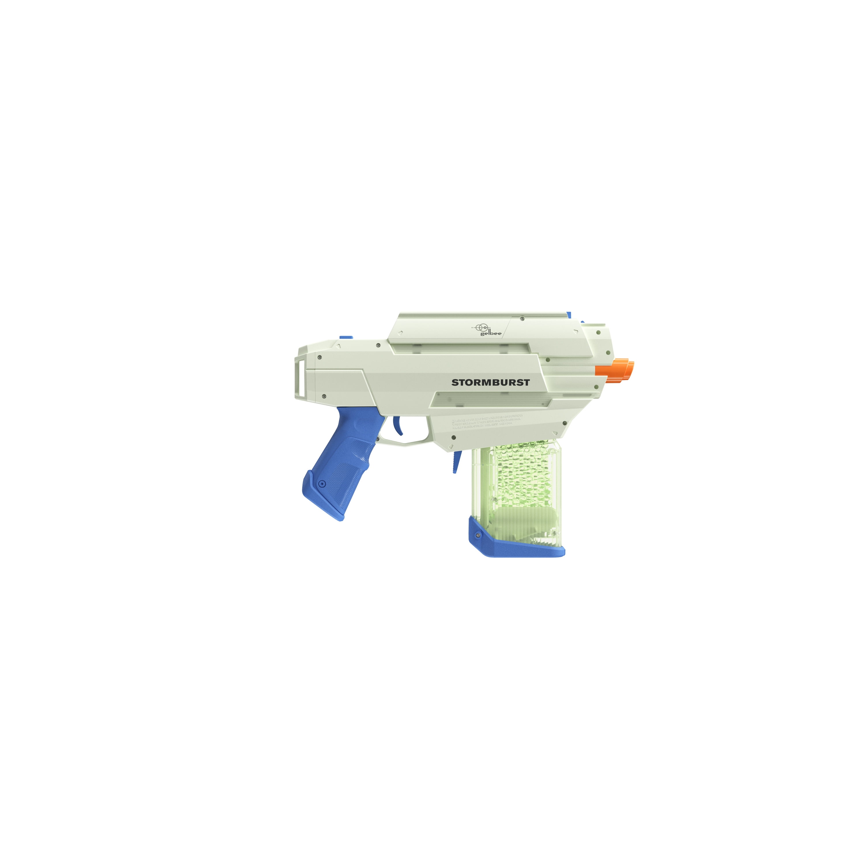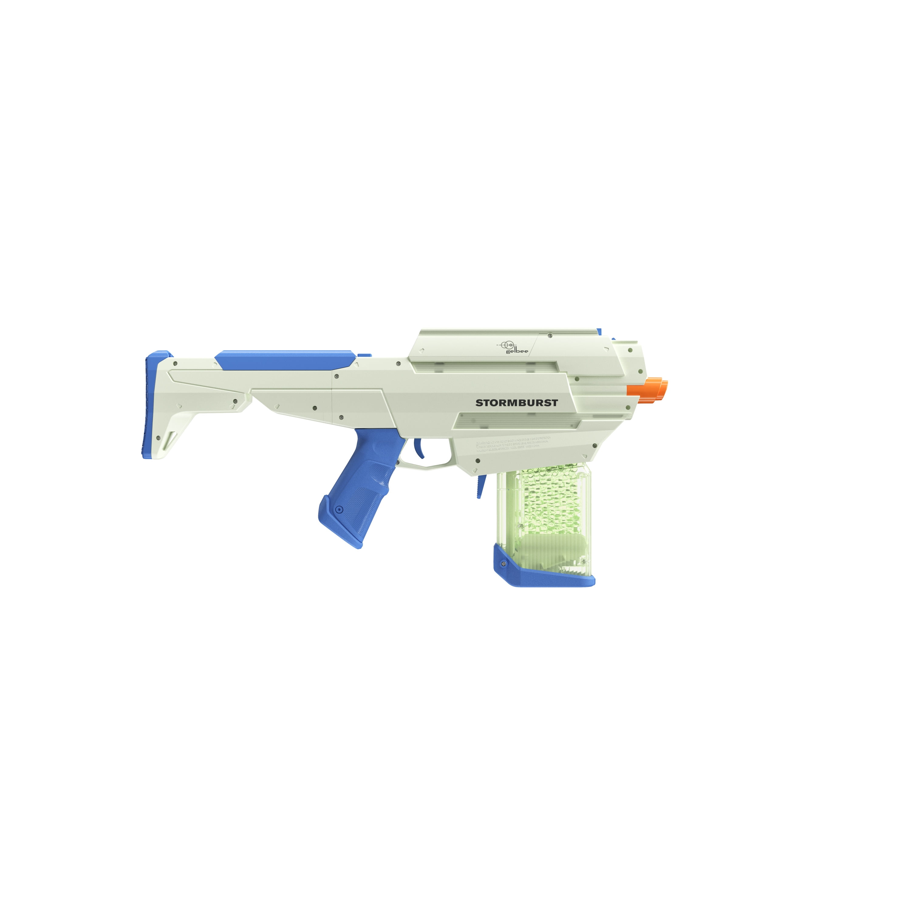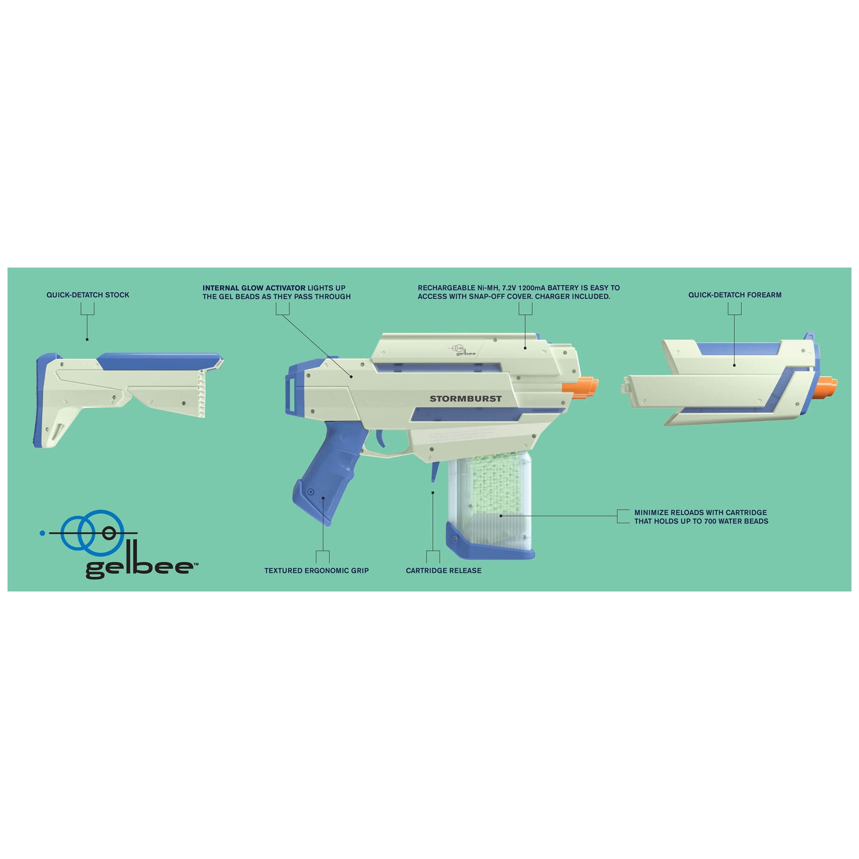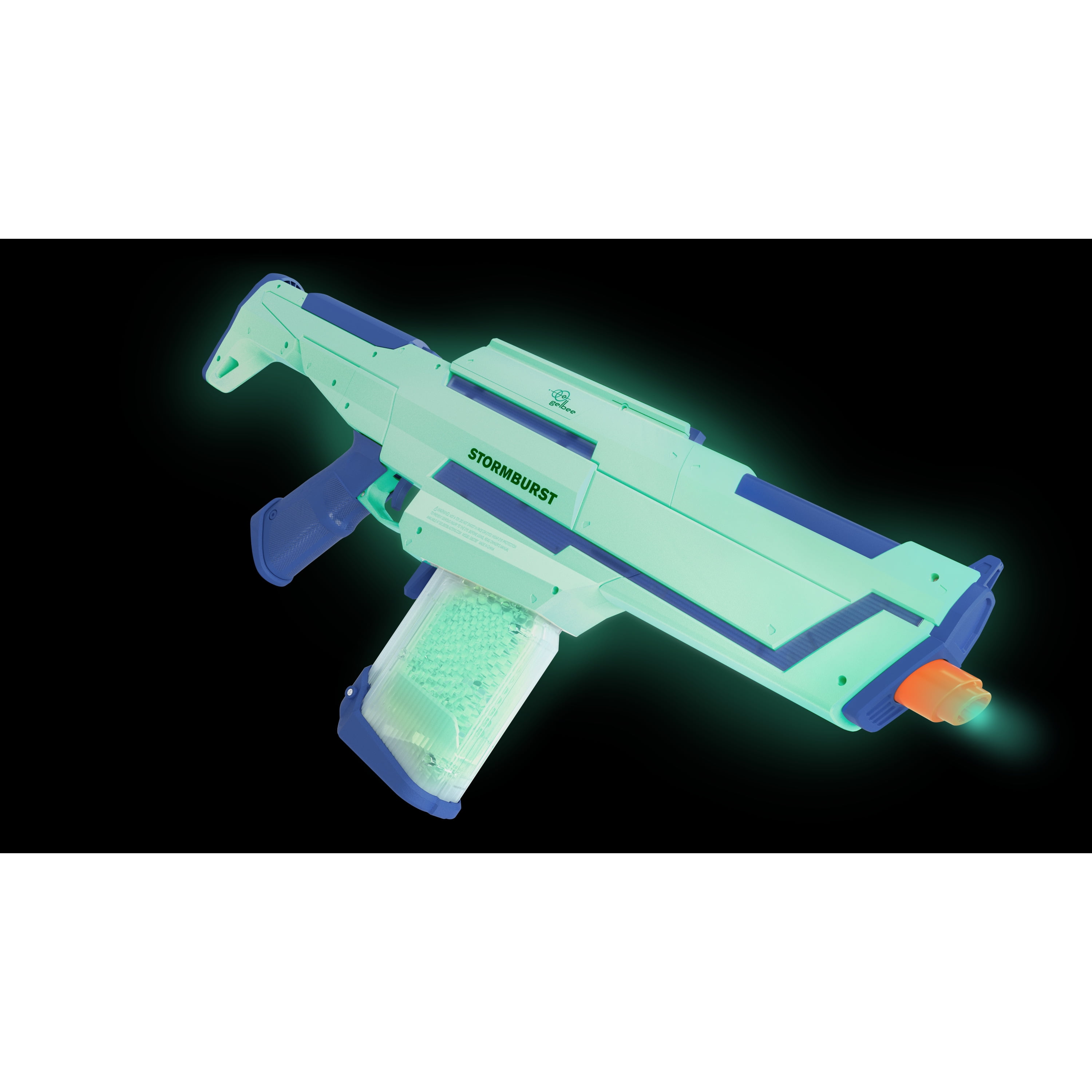 GelBee’s Storm Burst Glow Bead Blaster. The Storm Burst is a 4 advanced modular system; includes a rear stock, front barrel, and blaster. Blasts up to 11 gel beads per second Both the blaster and beads Glow in the Dark. In the full auto setting blast 11 gel beads per second, up to 240 fps. Includes a starter pack of Glow in the Dark water beads Rechargeable battery powered recommended minimum age is 14 recommended maximum age is 99