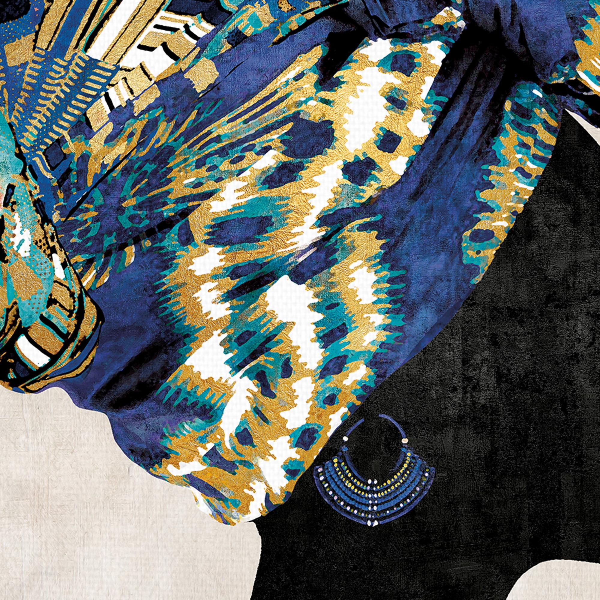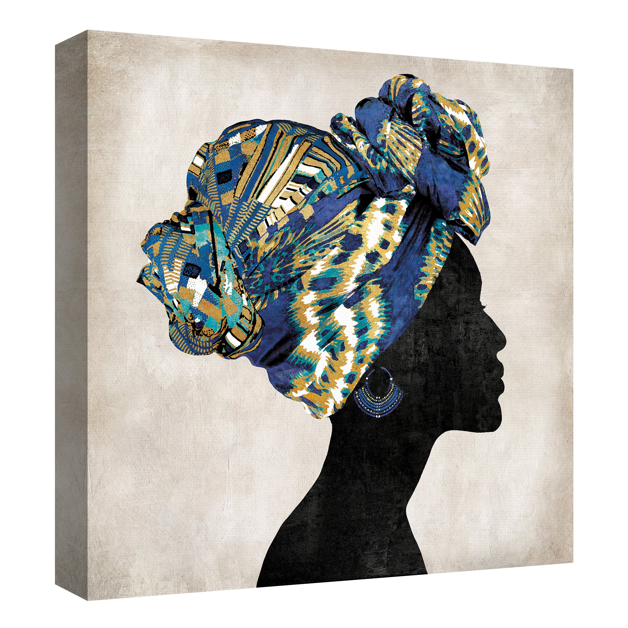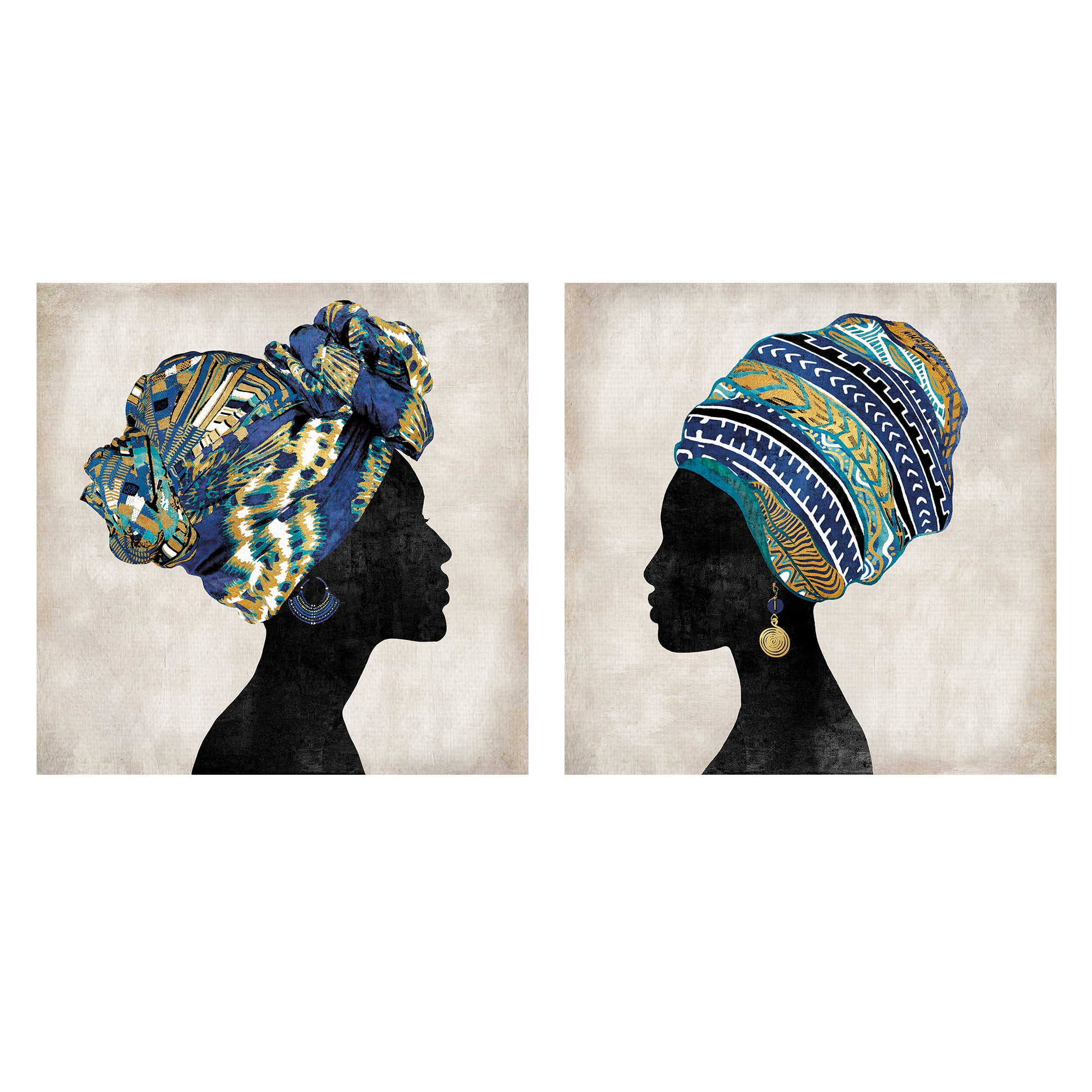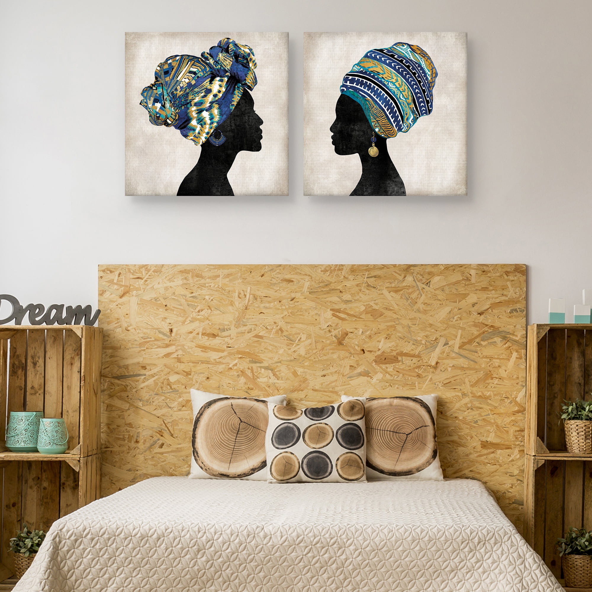 This African American portrait of two women in side profile is the perfect way to represent traditional heritage. They are against a neutral white backdrop that is perfectly shaded with gray. This allows them to pop against the canvas without the backdrop being too dull. Their headdresses display shades of indigo, green, and yellow that induce a subtle sense of bright intricacy. Whether you display this piece in your living room, hallway, or entranceway, it is sure to establish a firm, noble presence in your home. The rich color saturation and intricate blending is characterized by the exceptional printing technology used on top-of-the-line canvas. Plus, since the print wraps around the expanse of the canvas, there is no need for framing. Installation is quick and easy, giving you ample time to enjoy your new masterpiece.