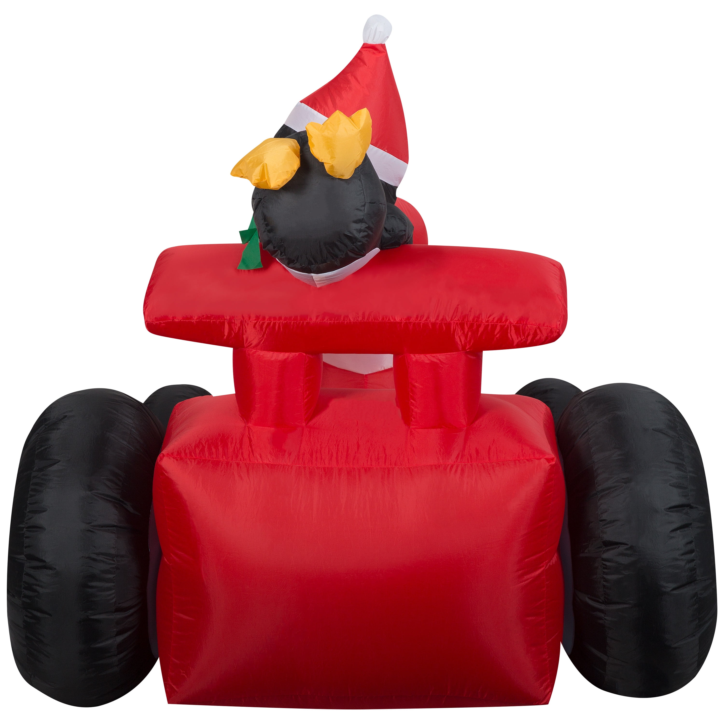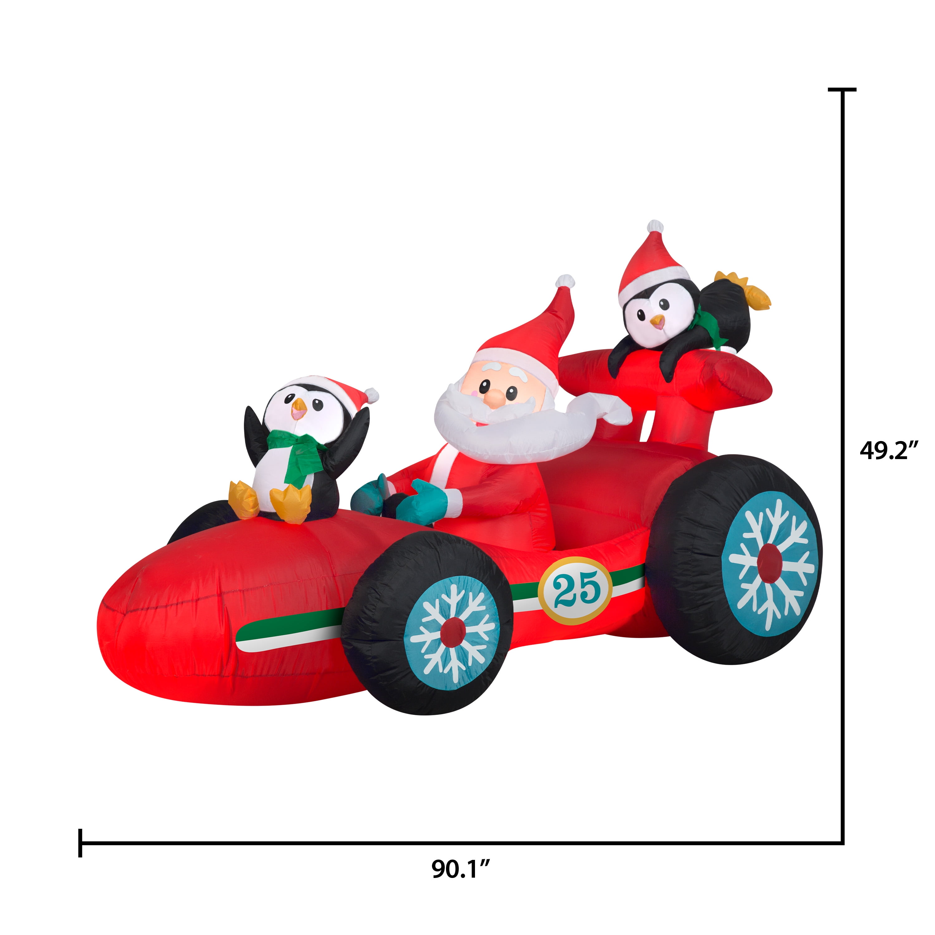 Vroom vroom! Santa has the wind in his beard driving this speedy Christmas racecar! Accented with snowflake tires and two daring penguin passengers, this delightful outdoor inflatable makes an eye-catching addition to your Christmas decorations. Setup is super simple. Just plug it in, stake it down and watch the magic unfold. Display this whimsical holiday decoration as a standalone or combine it with other Airblown® Inflatables to create a custom scene. Includes everything needed for easy outdoor setup.