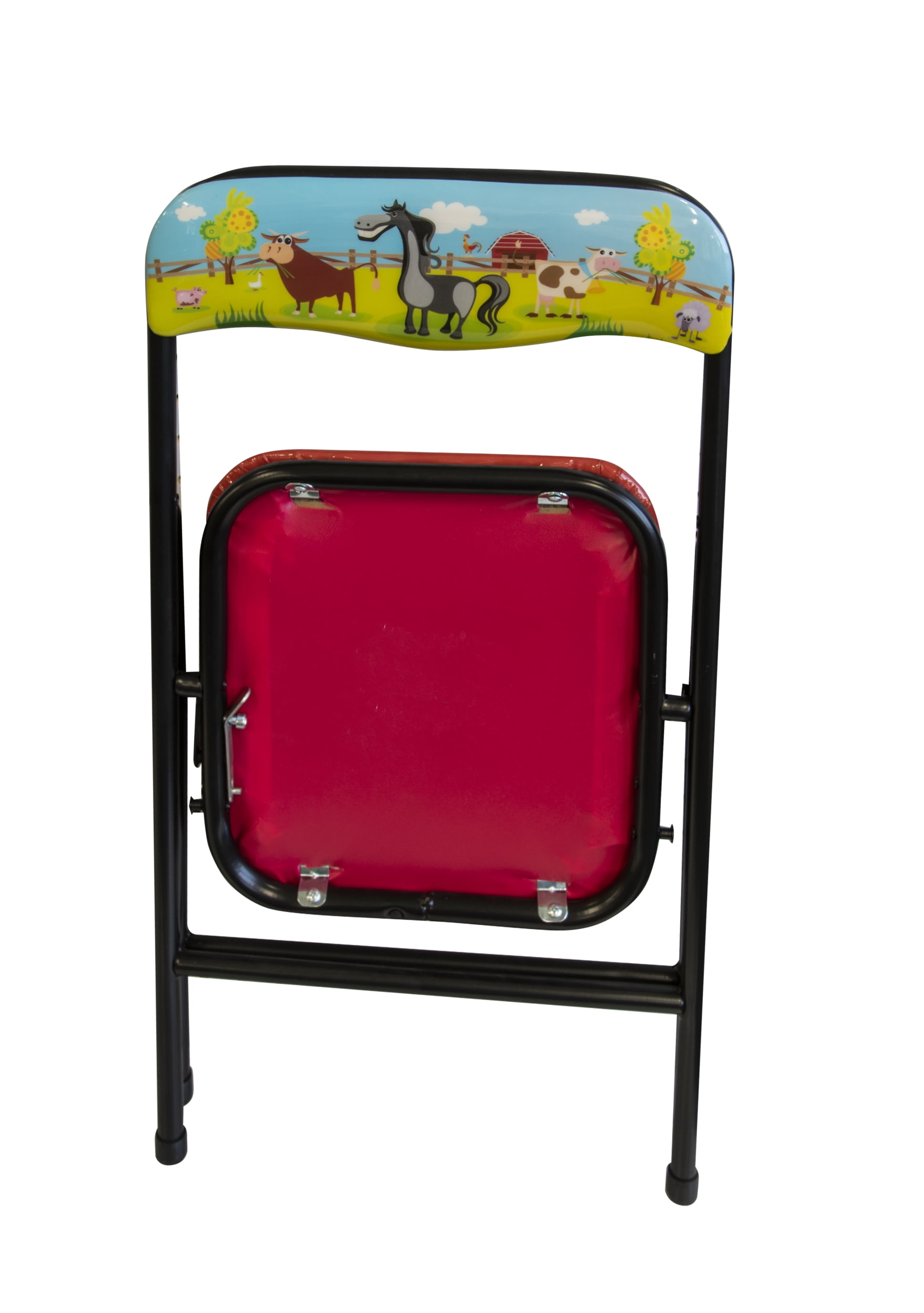 Gener8 GS75044 Barnyard table & Chairs Table dimensions: 25W x 25D x 20H in. Recommended for ages 3 to 8 Cute folding table for games, crafts, and more 2 folding chairs included; Weight limit: 90 lbs. each Chair dimensions: 13W x 12D x 21.5H in. For Toddlers and Children Ages 3 to 8 Years