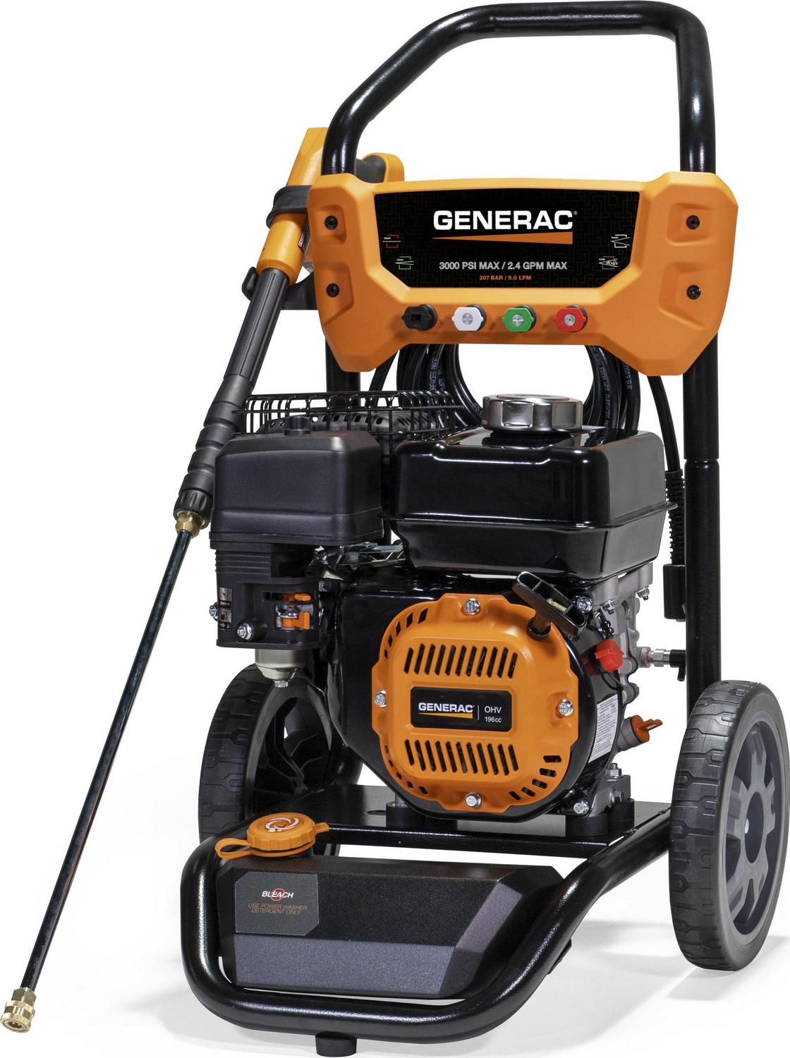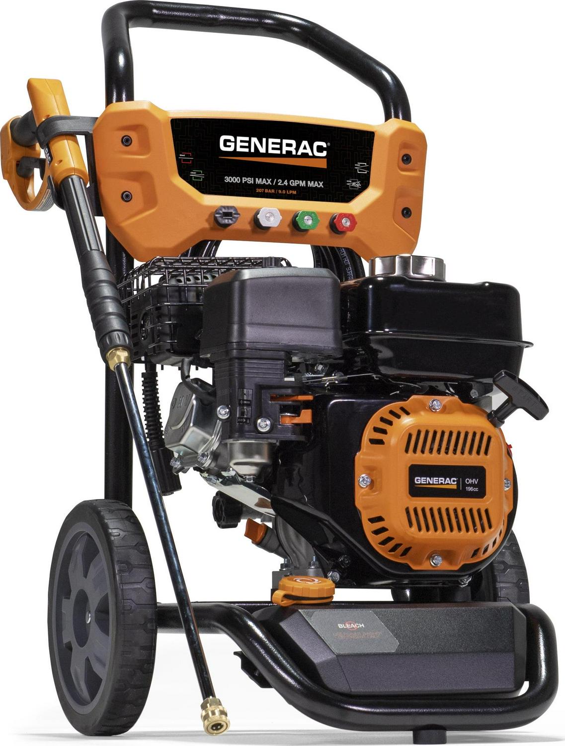 Generac s 3000 PSI power washer gives you cleaning power, reliability and above all ease of use in an affordable, compact unit you can use to clean everything from patio furniture to driveways and decks. The user-friendly design makes it easy to assemble, connect hoses, move almost effortlessly regardless of terrain, and clean longer and more comfortably.