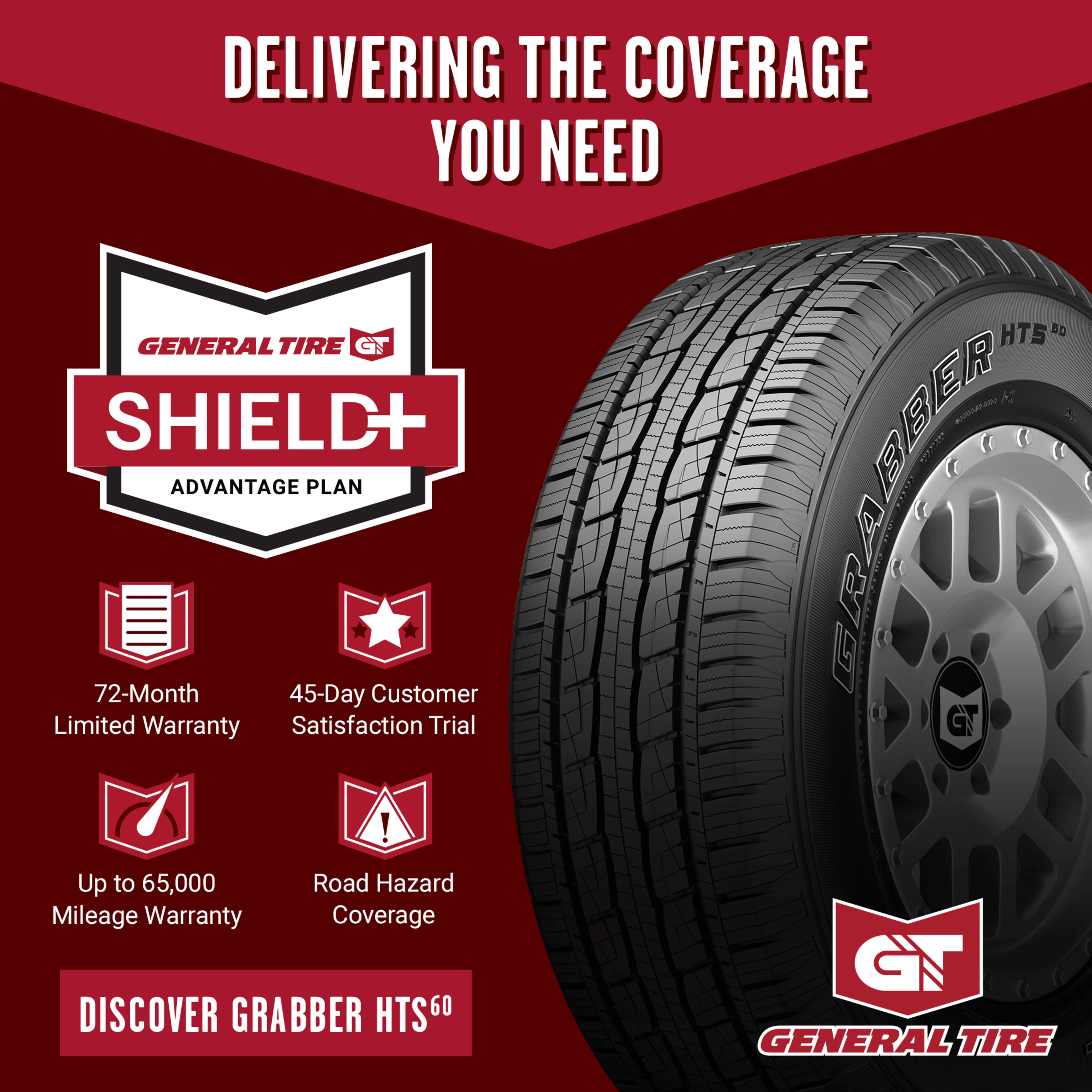 The General Grabber HTS60 is an all-season tire designed for light trucks and SUVs that offers reliable braking, responsive handling, enhanced durability, low road noise, and long-lasting treadwear.