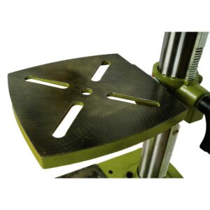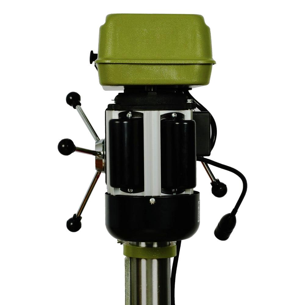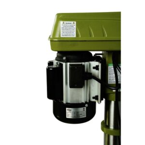 General International 12″ Drill Press Laser Benchtop Variable Speed Forced opening line interrupter switch, requires machine restart in case of power failure or circuit interruption. Adjustable spindle tension return spring. Built-in laser pointer. Sturdy design with cast-iron head, base, and table. High-quality bearings for smooth, vibration-free operation. Simple hand lever controlled mechanical variable speed from 500 to 3000 rpm. Digital spindle speed display. 1/3 HP industrial-quality, 120 V motor. Equipped with easy to adjust dual depth stop for complete control of both down stroke depth and upstroke travel. 5/8 Chuck with key and convenient inboard chuck key holder. Easy to use see-through flip-up chuck guard included. Crank-operated rack and pinion table height adjustment.