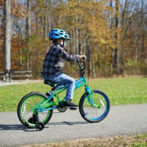 The Boys’ Genesis 18″ Glitch BMX Bicycle is a great bike for your young rider! It is a single speed BMX style bike with a steel freestyle frame and heavy duty training wheels. This bike also has front pegs, textured hand-grips and a translucent green chain guard. The quick adjust seat lets the rider adjust as they grow. It has a four bolt stem, foot brakes and dual hand brakes for added convenience. This is a great bike for learning and beyond with a super cool paint job! It also comes with removable training wheels.